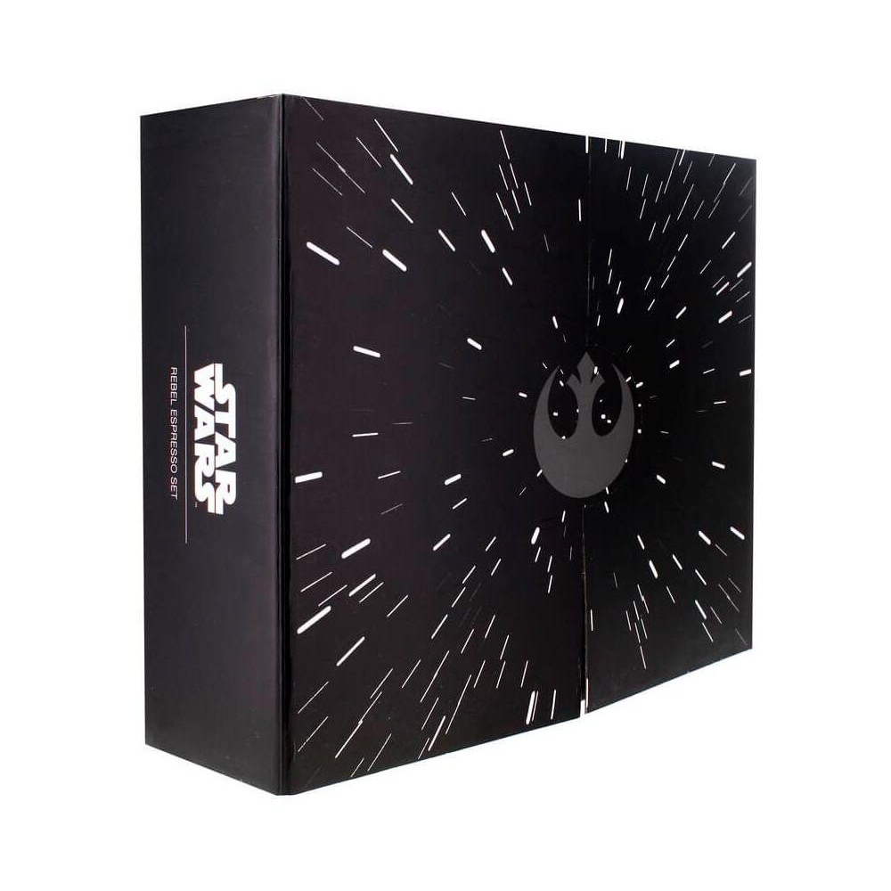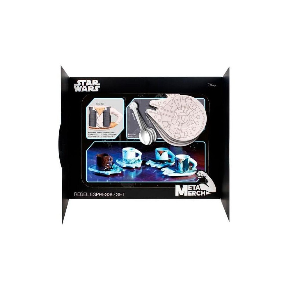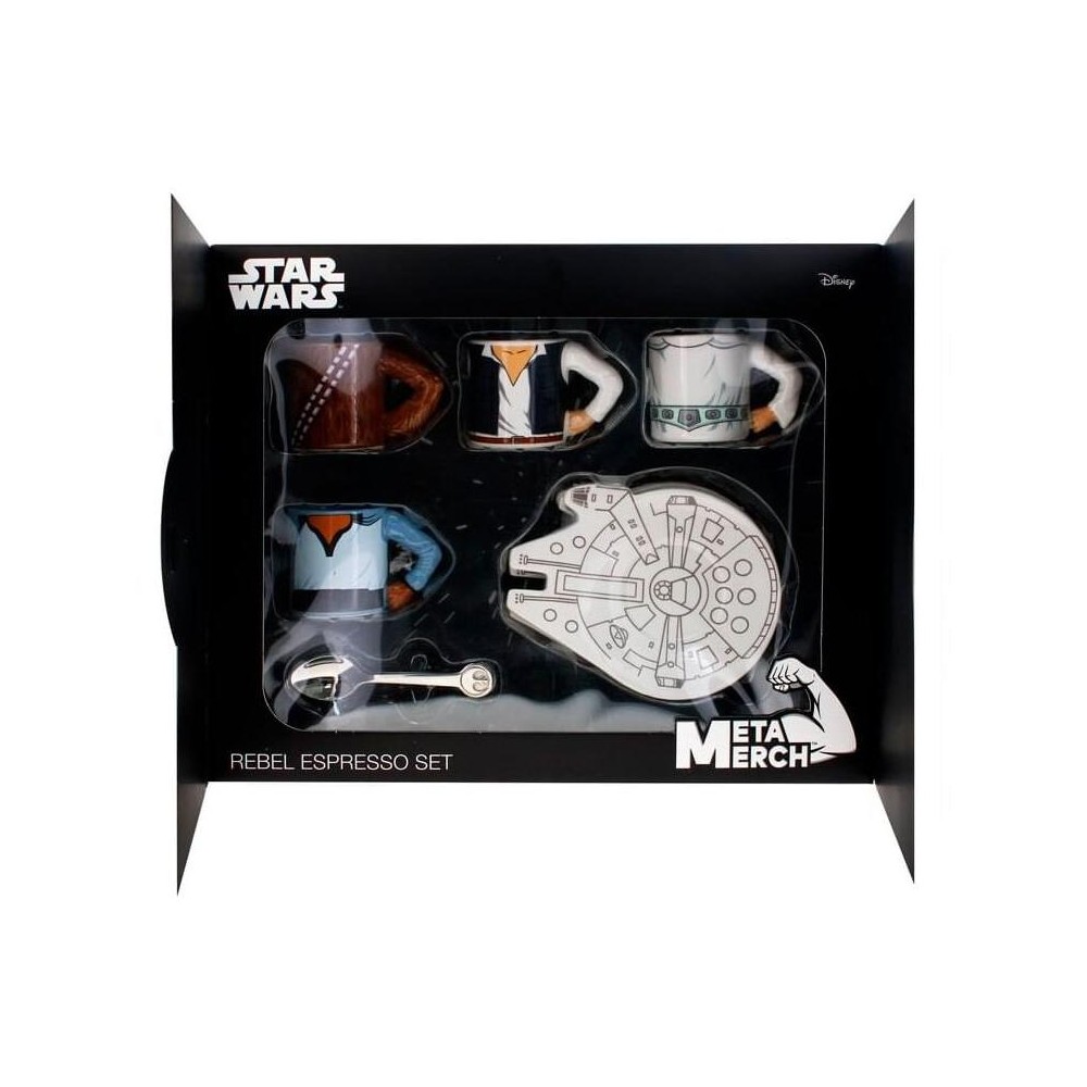 Originální sada na espresso pro milovníky Star Wars - Hvězdných válek obsahuje 4 stylové hrnky s grafikou Hana Sola, Žvejkala, princezny Leiy Organy a Luka Skywalkera. Součástí jsou také 4 talířky ve tvaru slavné lodi Millennium Falcon a 4 kovové lžičky se znakem povstalců. Krásný dárek pro fanoušky slavné sci-fi ságy!