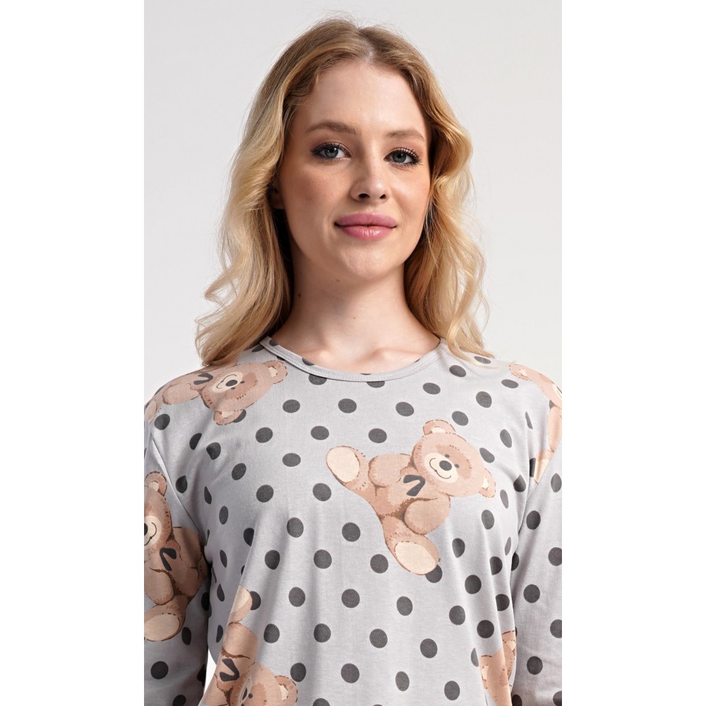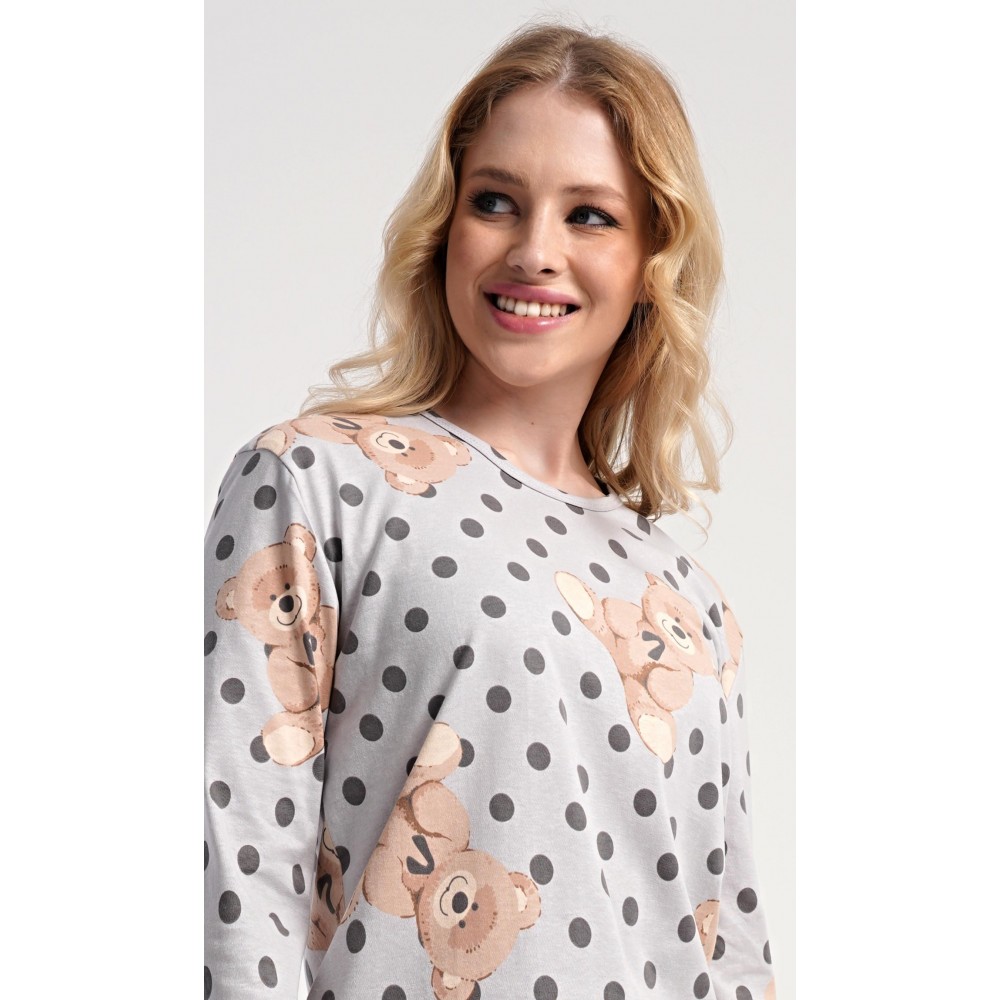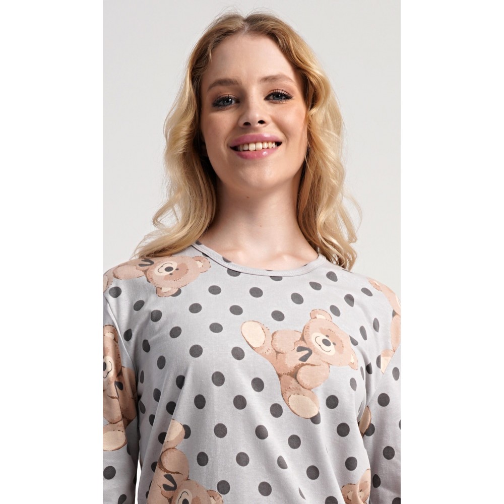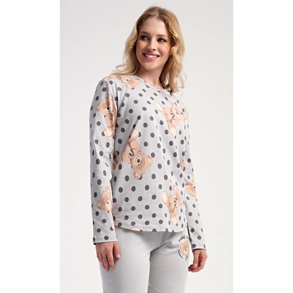 Dámské bavlněné dlouhé pyžamo Paula. Dámské pyžamo se skládá z trika s dlouhým rukávem a dlouhých kalhot. Jednobarevné triko je ozdobeno obrázkem medvědů. Tento motiv se opakuje i na kalhotách, které mají v pase gumu a šňůrku na stažení, nemají kapsy. Použitý bavlněný materiál je poddajný a příjemný na dotek.