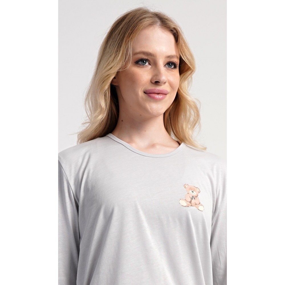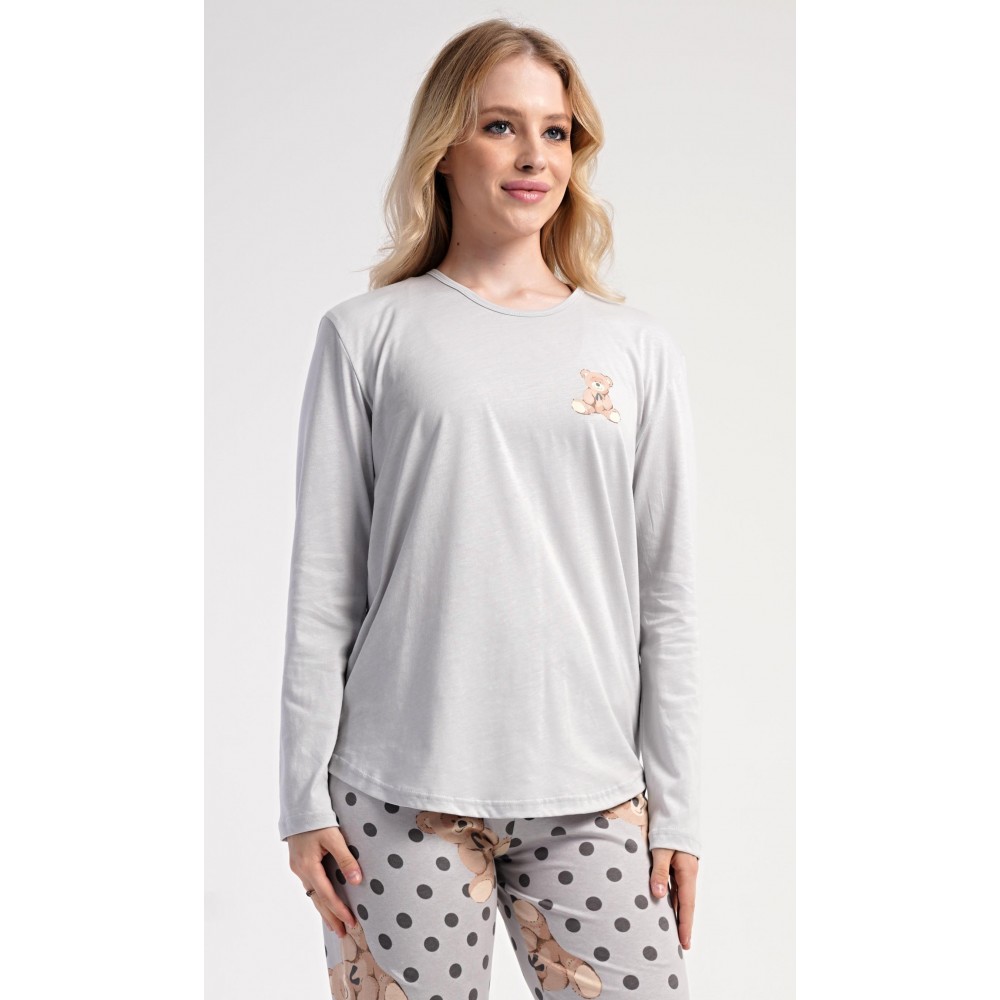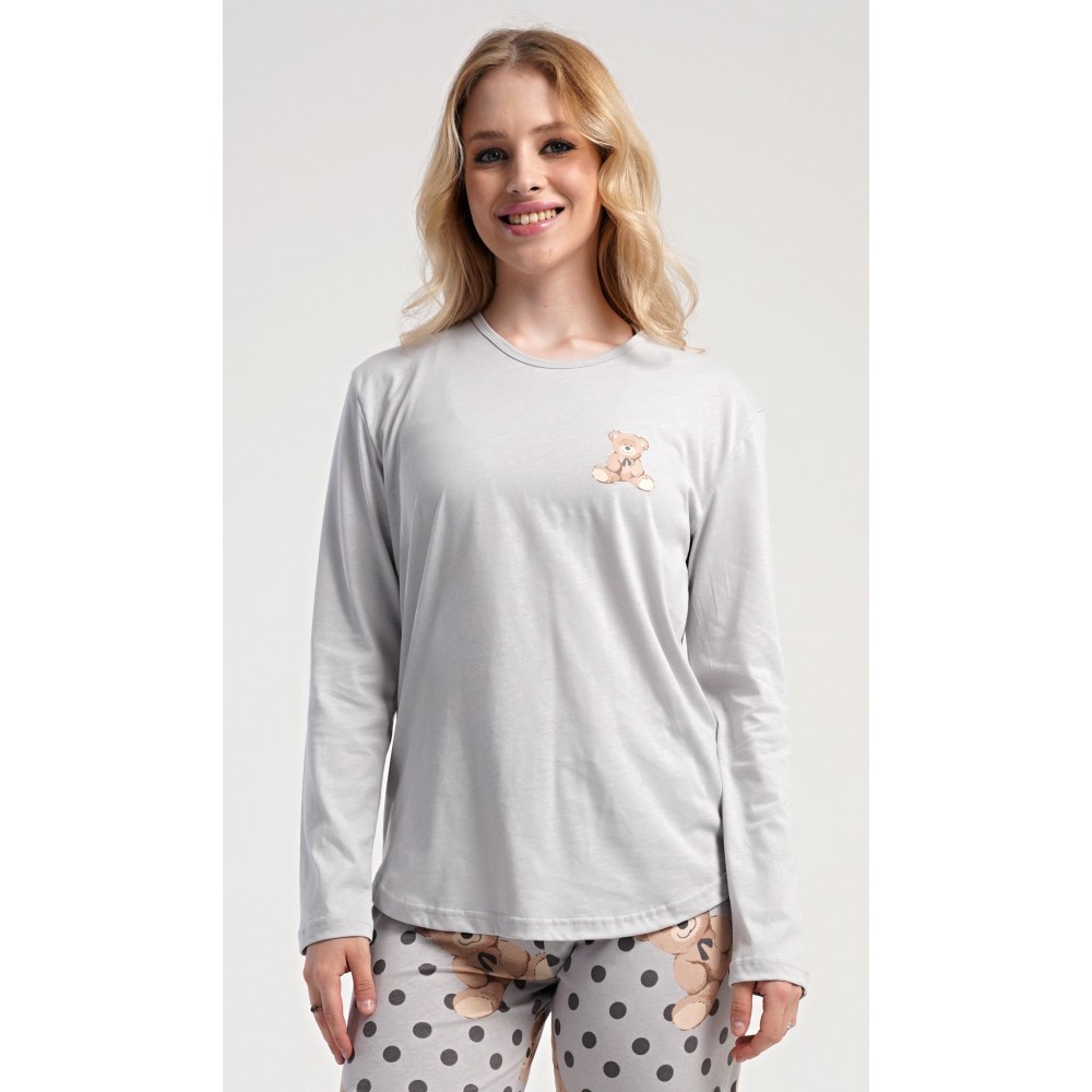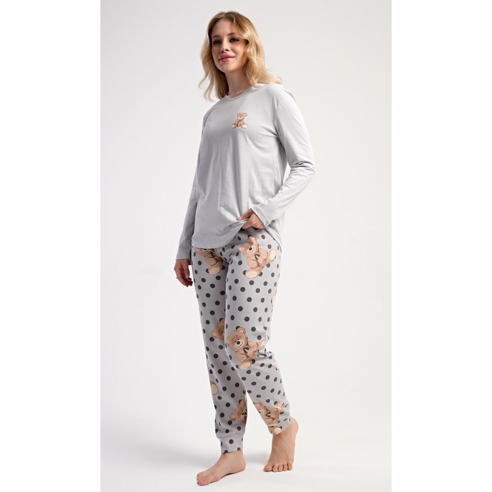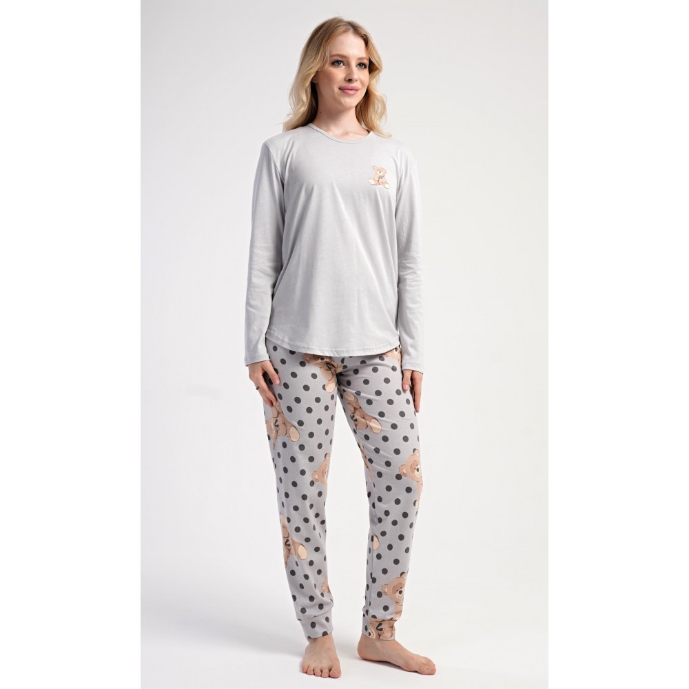 Dámské bavlněné dlouhé pyžamo Poppy. Dámské pyžamo se skládá z trika s dlouhým rukávem a dlouhých kalhot. Jednobarevné triko s kulatým výstřihem je ozdobeno obrázkem medvídka. Tento motiv se opakuje i na kalhotách, které mají v pase gumu a šňůrku na stažení, nemají kapsy. Použitý bavlněný materiál je poddajný a příjemný na dotek.
