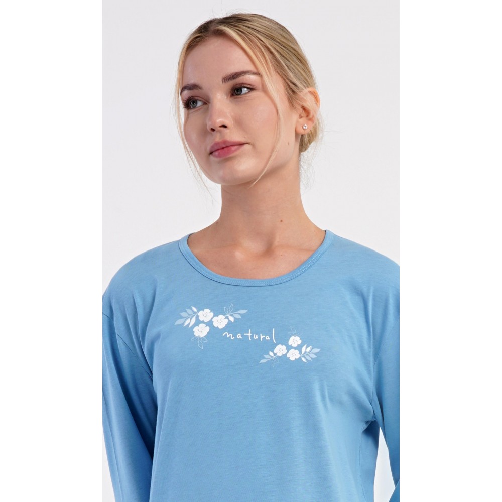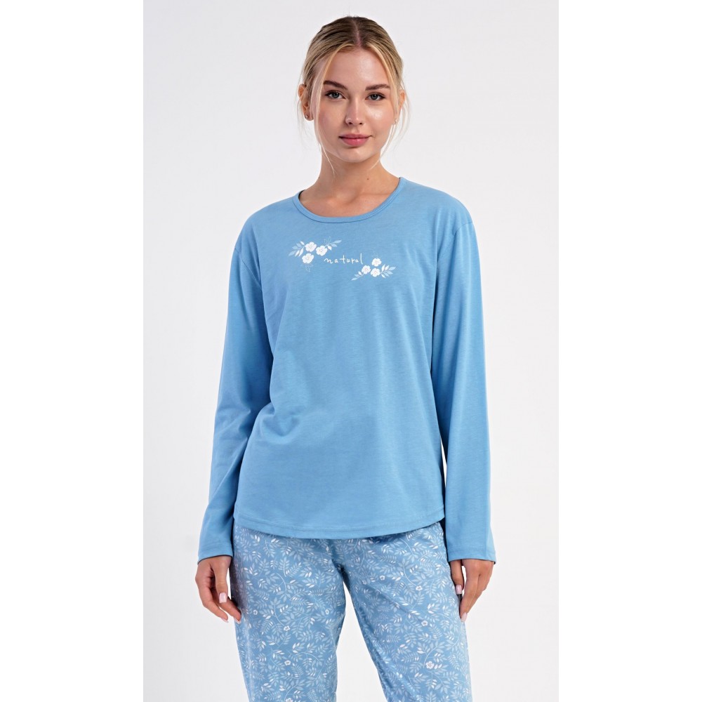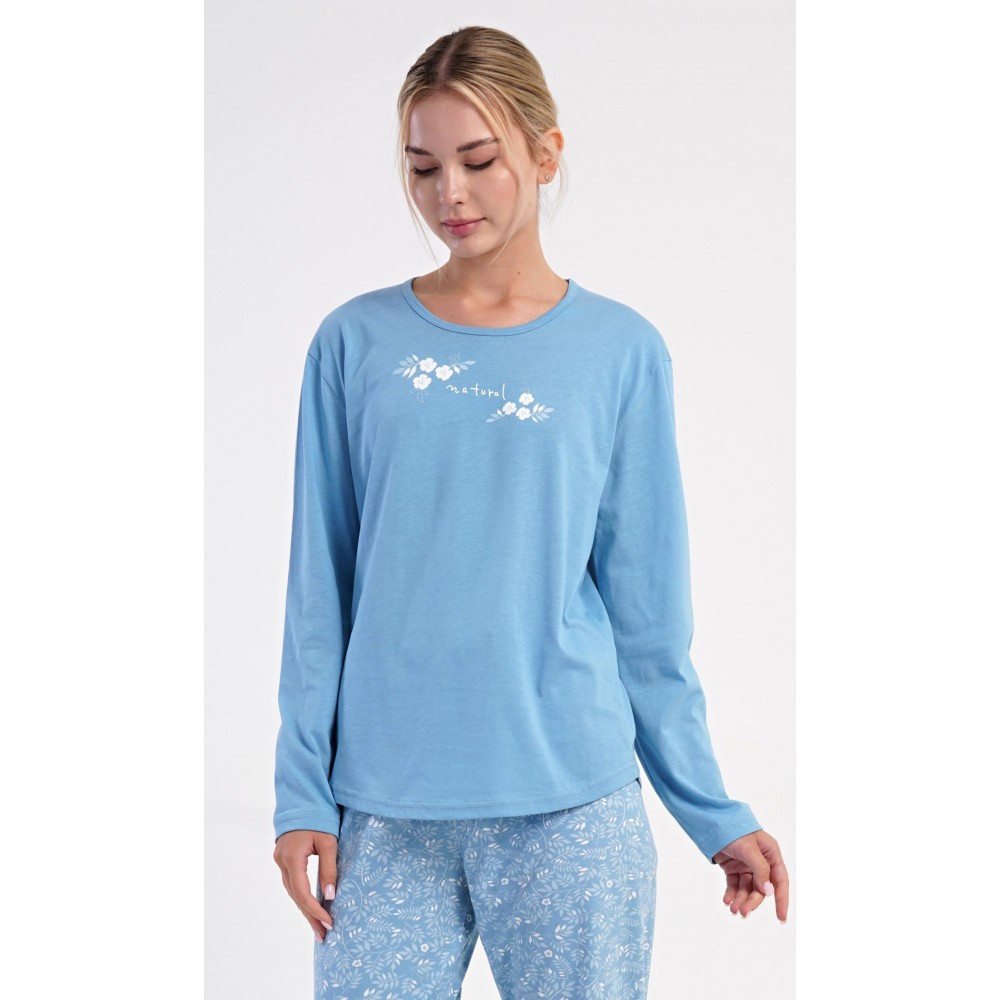 Dámské bavlněné dlouhé pyžamo Natural life. Dámské pyžamo se skládá z trika s dlouhým rukávem a dlouhých kalhot. Jednobarevné triko je ozdobeno obrázkem květů a větviček. Tento motiv se opakuje i na kalhotách, které mají v pase gumu a šňůrku na stažení, nemají kapsy. Použitý bavlněný materiál je poddajný a příjemný na dotek.