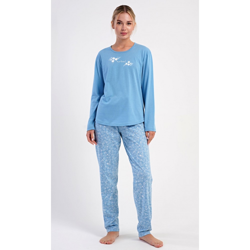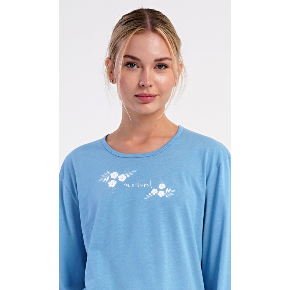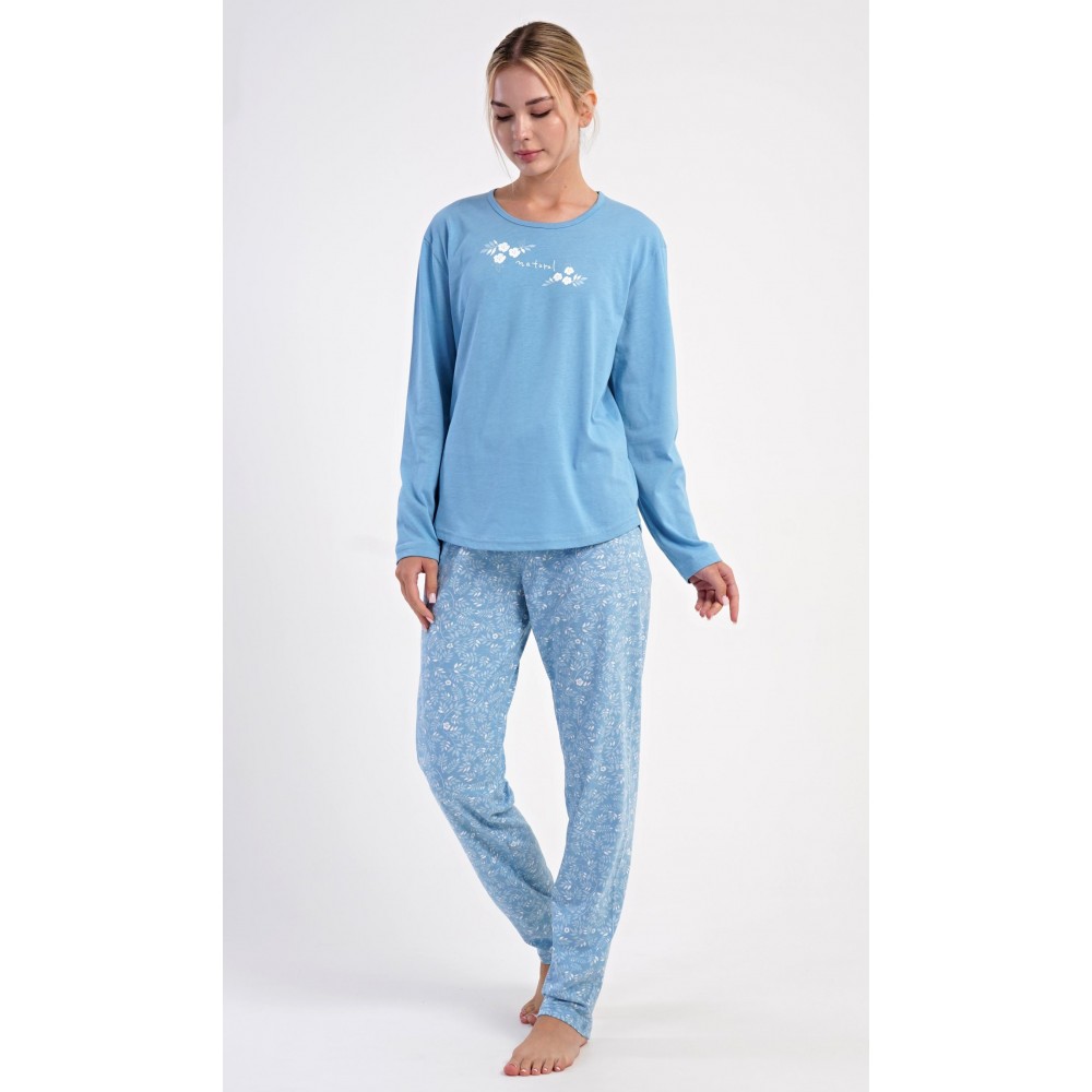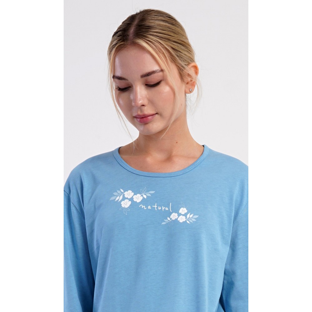 Dámské bavlněné dlouhé pyžamo Natural life. Dámské pyžamo se skládá z trika s dlouhým rukávem a dlouhých kalhot. Jednobarevné triko je ozdobeno obrázkem květů a větviček. Tento motiv se opakuje i na kalhotách, které mají v pase gumu a šňůrku na stažení, nemají kapsy. Použitý bavlněný materiál je poddajný a příjemný na dotek.