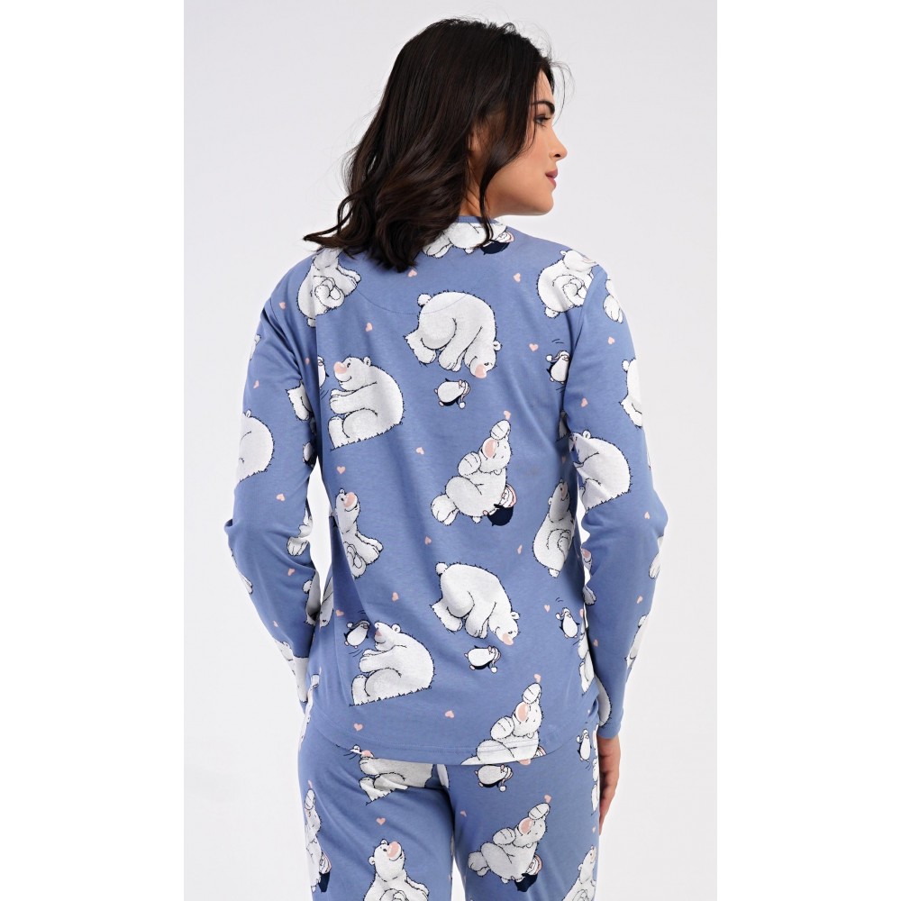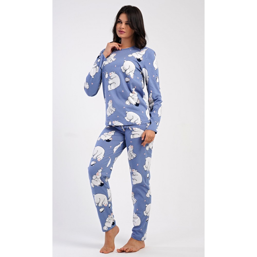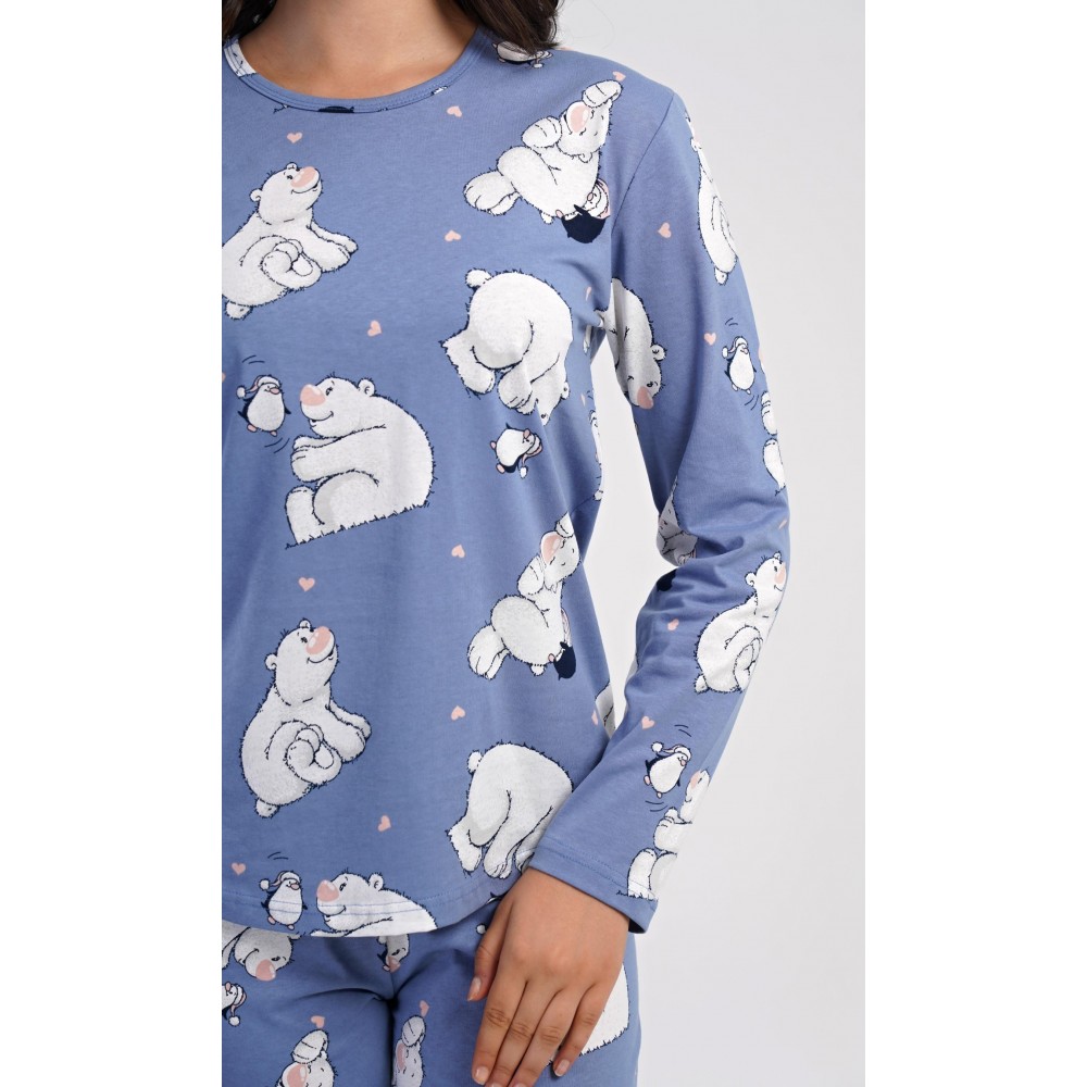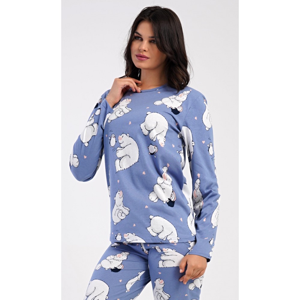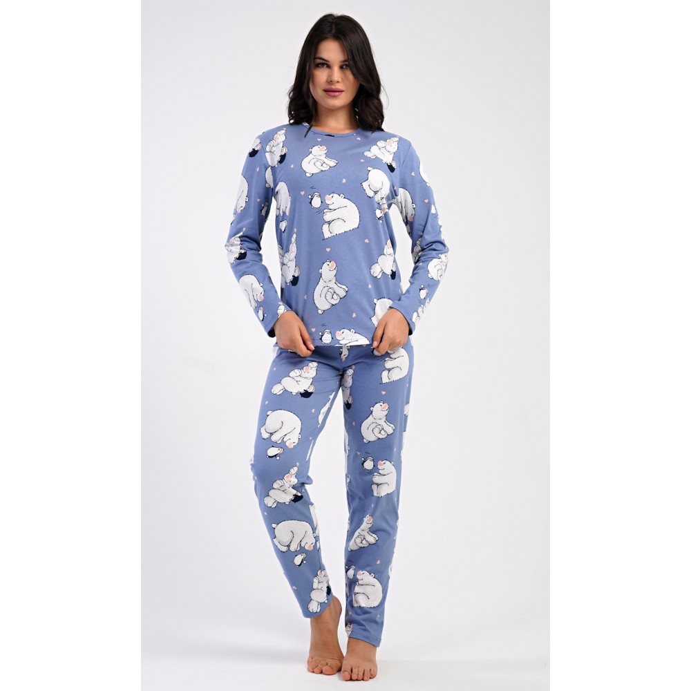 Dámské bavlněné dlouhé pyžamo Tučňák a méďa. Dámské pyžamo se skládá z trika s dlouhým rukávem a dlouhých kalhot. Triko s kulatým výstřihem je ozdobeno obrázky ledních medvědů. Tento motiv se opakuje i na kalhotách, které mají v pase gumu a šňůrku na stažení, nemají kapsy. Použitý bavlněný materiál je poddajný a příjemný na dotek.