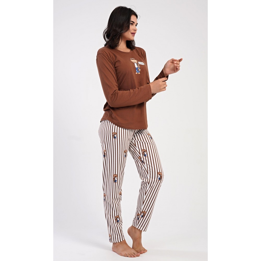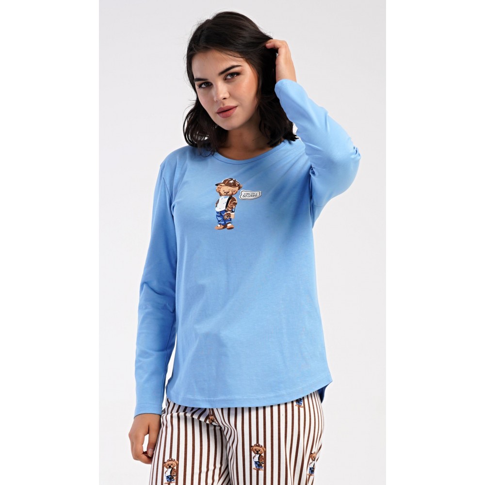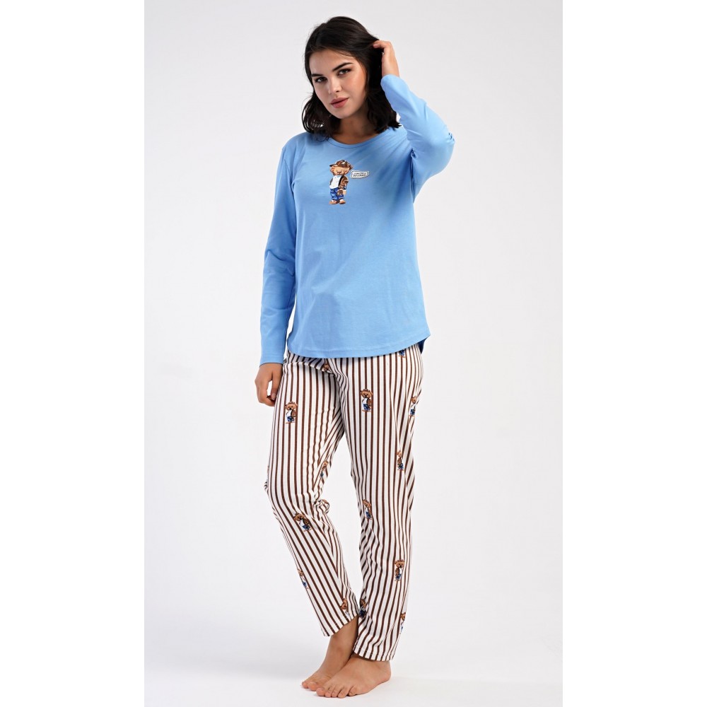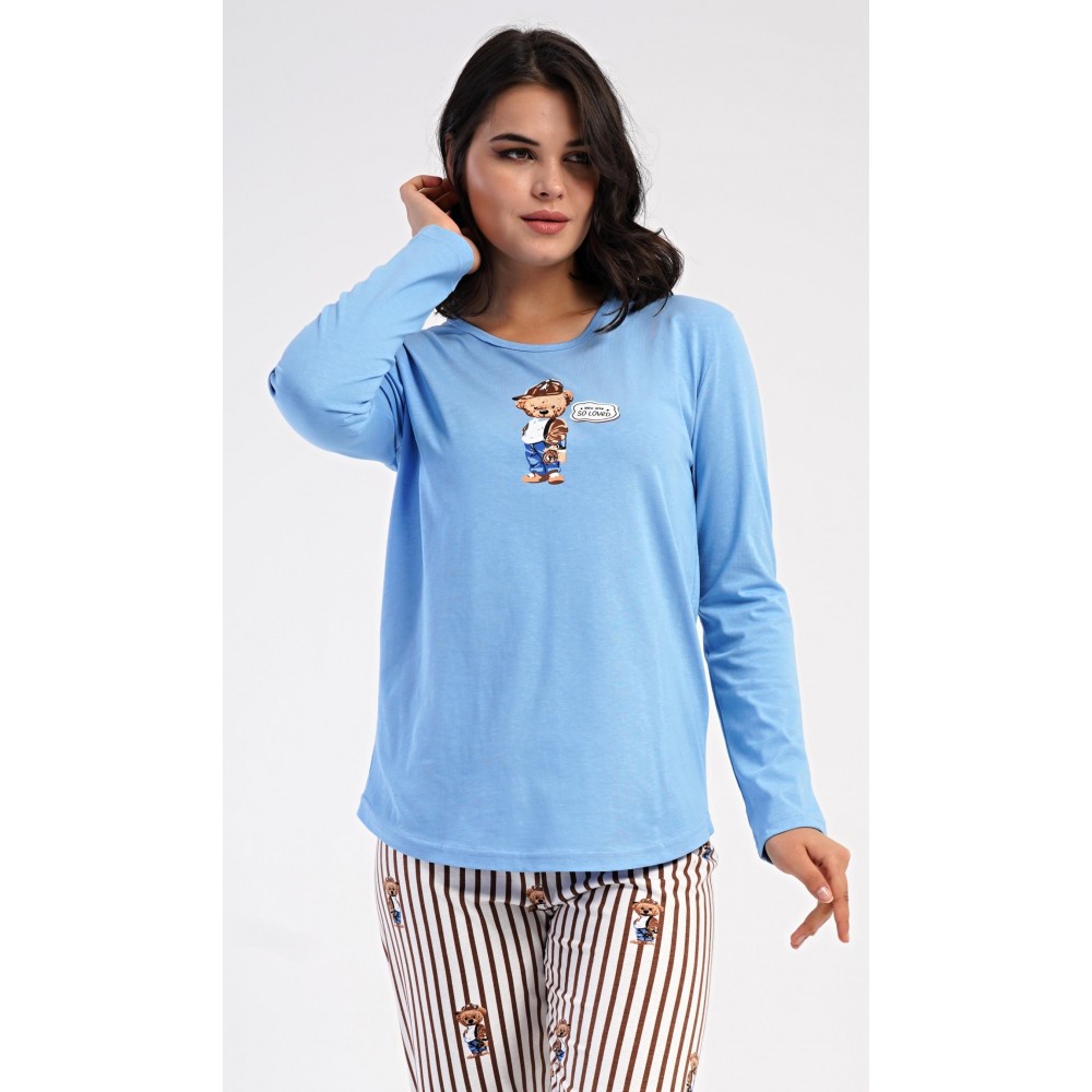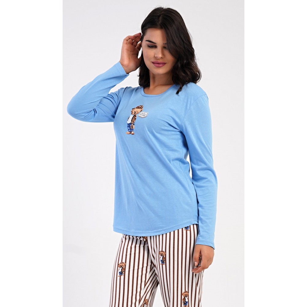 Dámské bavlněné dlouhé pyžamo Bear. Dámské pyžamo se skládá z trika s dlouhým rukávem a dlouhých kalhot. Jednobarevné triko je ozdobeno obrázkem medvěda. Tento motiv se opakuje i na proužkovaných kalhotách, které mají v pase gumu a šňůrku na stažení, nemají kapsy. Použitý bavlněný materiál je poddajný a příjemný na dotek.