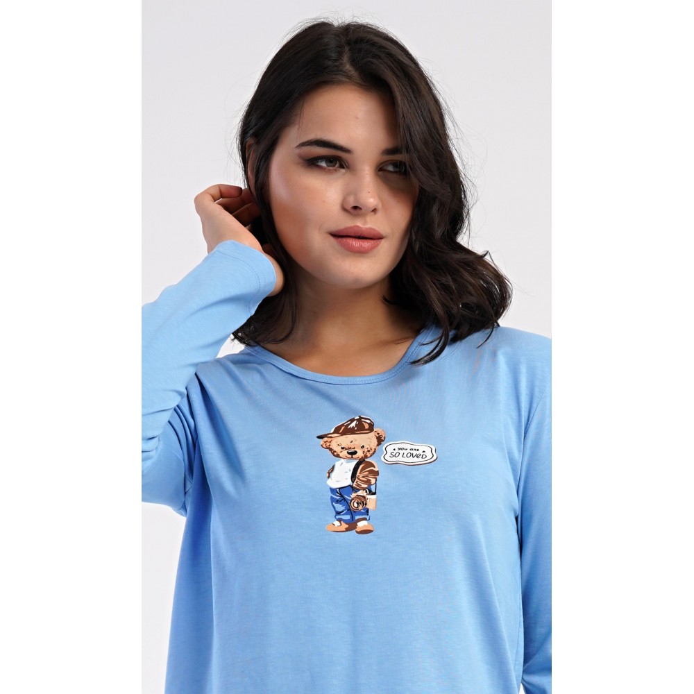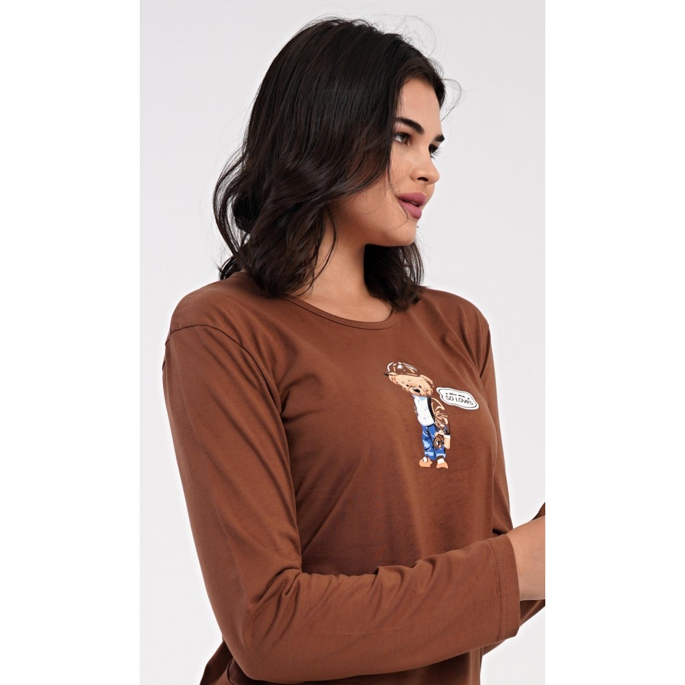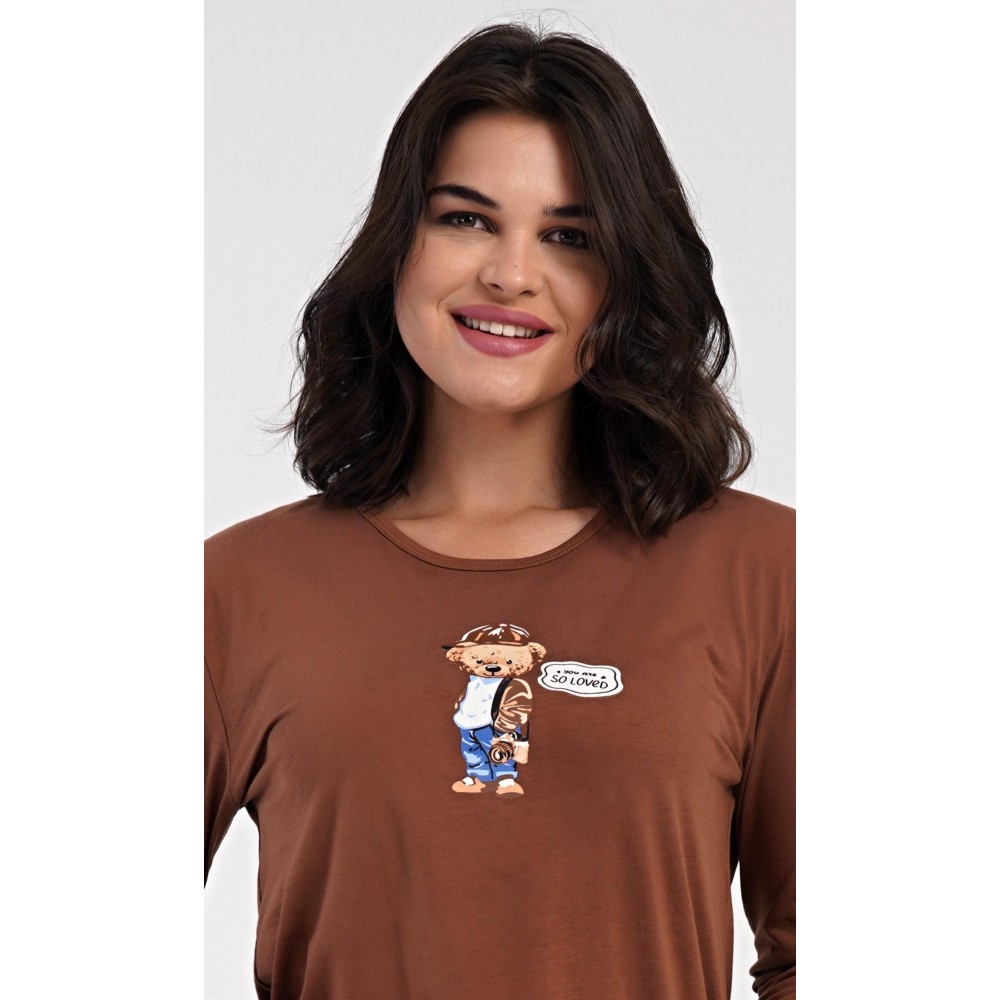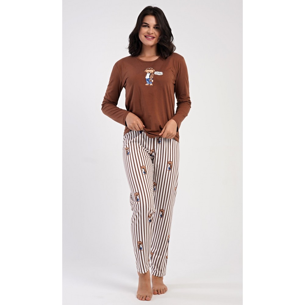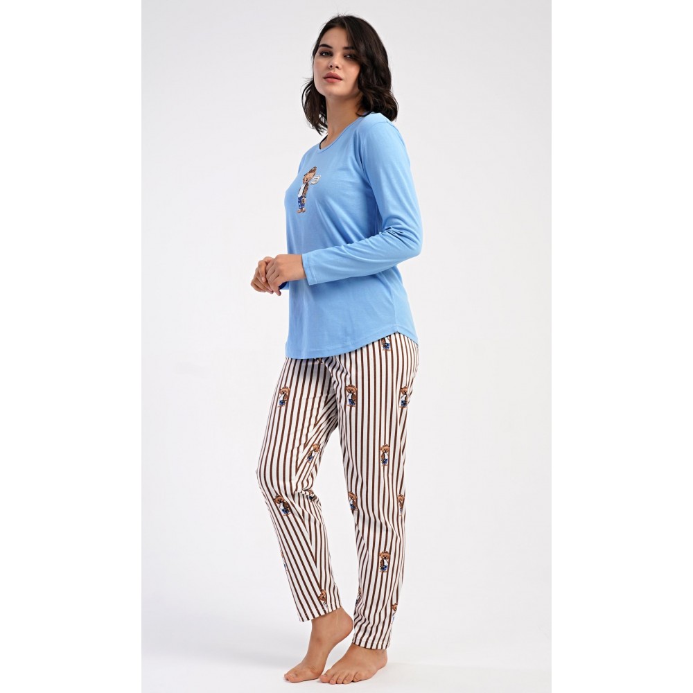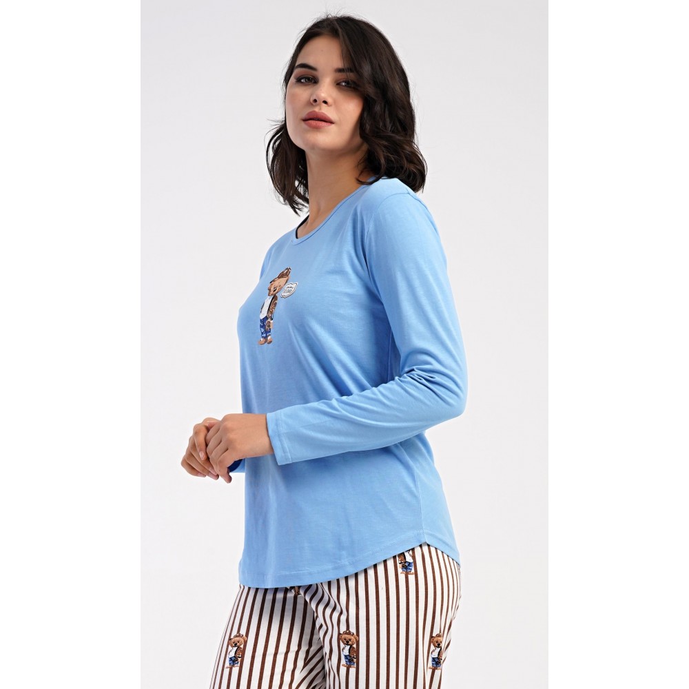 Dámské bavlněné dlouhé pyžamo Bear. Dámské pyžamo se skládá z trika s dlouhým rukávem a dlouhých kalhot. Jednobarevné triko je ozdobeno obrázkem medvěda. Tento motiv se opakuje i na proužkovaných kalhotách, které mají v pase gumu a šňůrku na stažení, nemají kapsy. Použitý bavlněný materiál je poddajný a příjemný na dotek.