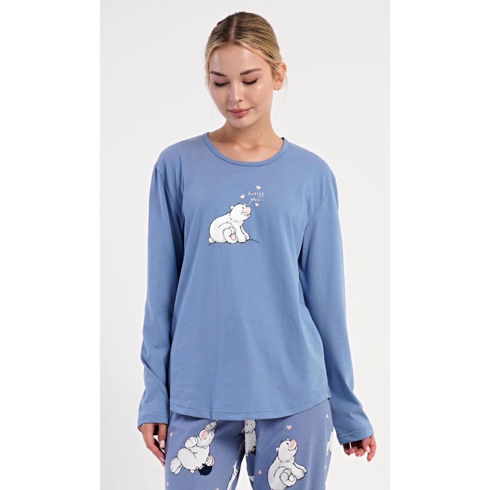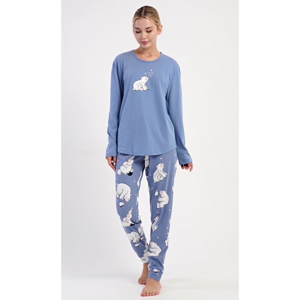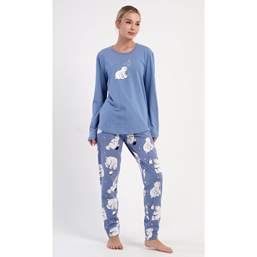 Dámské bavlněné dlouhé pyžamo Méďa a tučňák. Dámské pyžamo se skládá z trika s dlouhým rukávem a dlouhých kalhot. Triko s kulatým výstřihem je na hrudi zdobeno obrázkem ledního medvěda. Tento motiv se opakuje i na kalhotách, které mají v pase gumu a šňůrku na stažení, nemají kapsy. Použitý bavlněný materiál je poddajný a příjemný na dotek.
