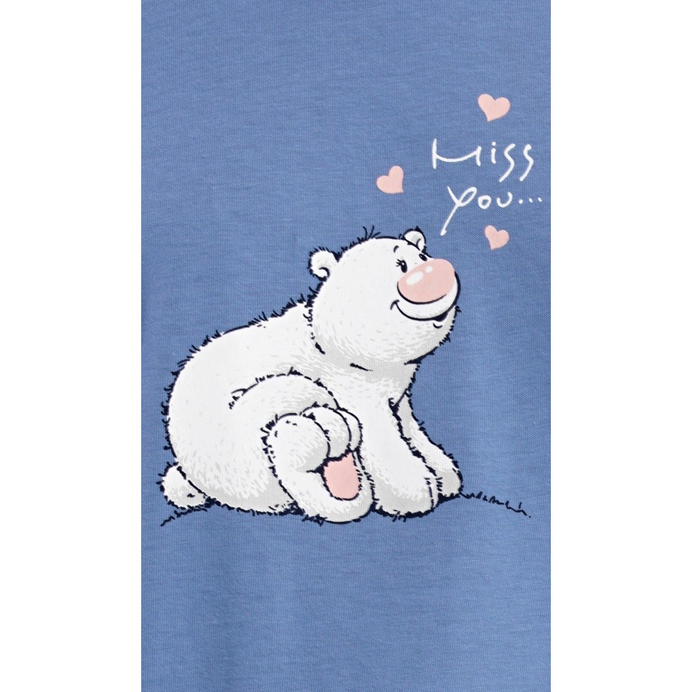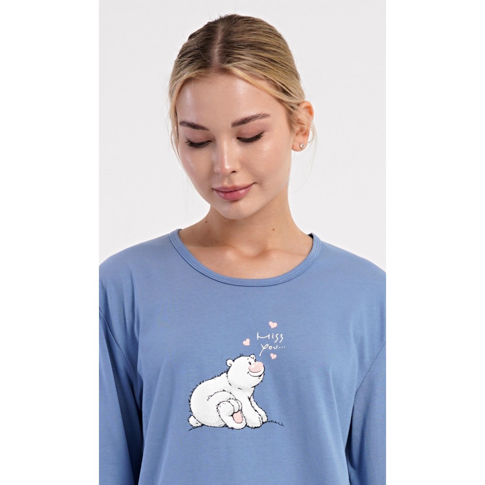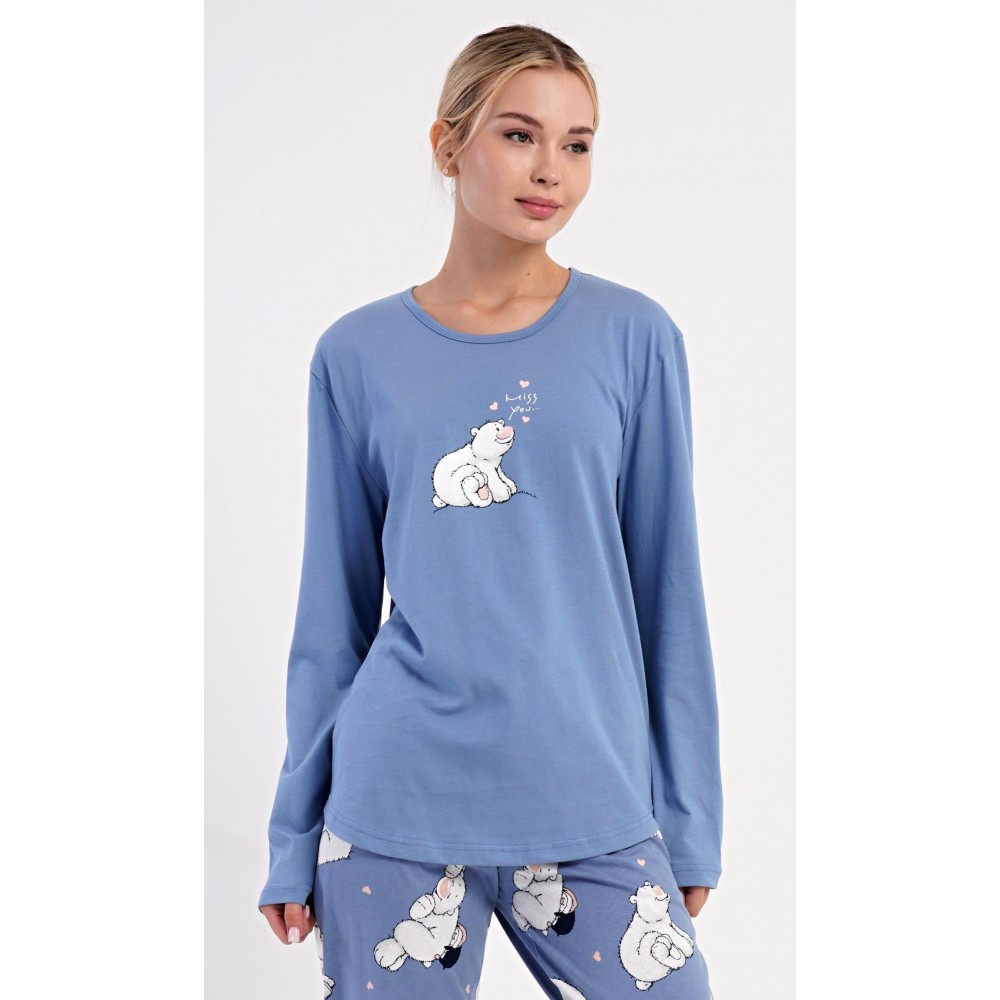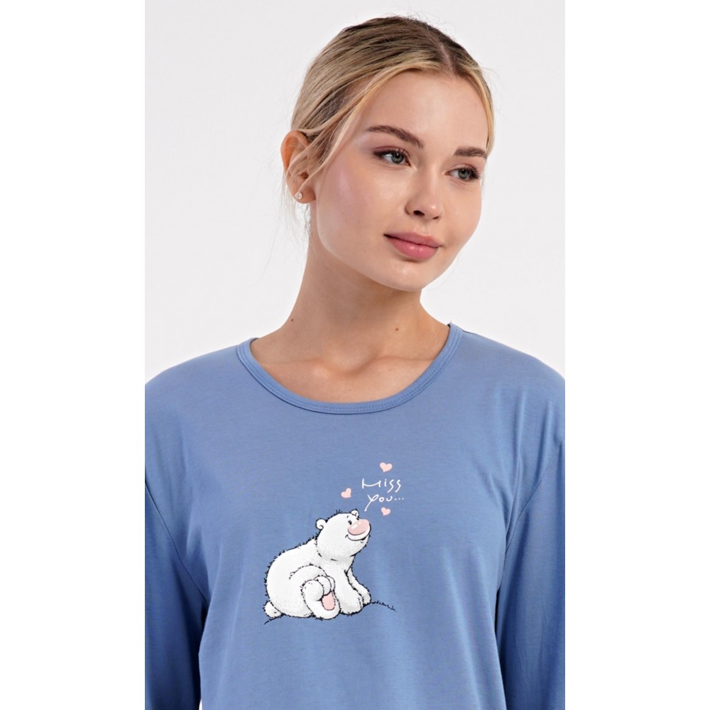 Dámské bavlněné dlouhé pyžamo Méďa a tučňák. Dámské pyžamo se skládá z trika s dlouhým rukávem a dlouhých kalhot. Triko s kulatým výstřihem je na hrudi zdobeno obrázkem ledního medvěda. Tento motiv se opakuje i na kalhotách, které mají v pase gumu a šňůrku na stažení, nemají kapsy. Použitý bavlněný materiál je poddajný a příjemný na dotek.