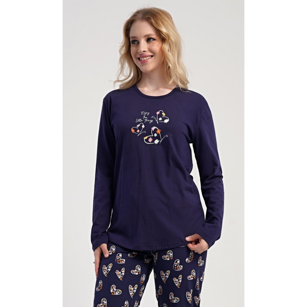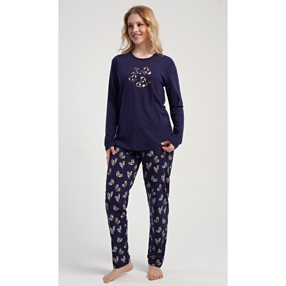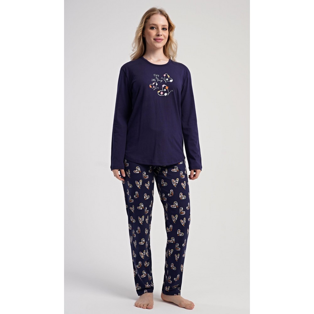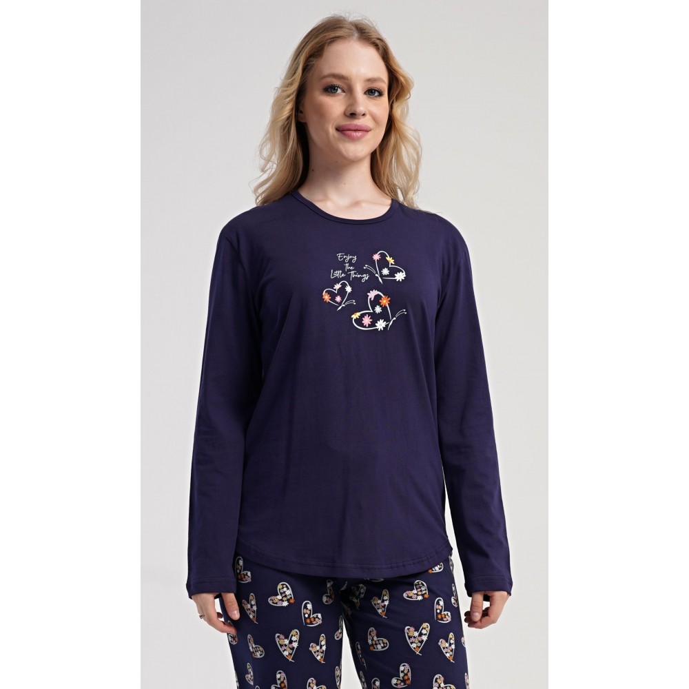 Dámské bavlněné dlouhé pyžamo Sarah. Dámské pyžamo se skládá z trika s dlouhým rukávem a dlouhých kalhot. Jednobarevné triko je ozdobeno obrázkem květů a motýlů. Květinový motiv se opakuje i na kalhotách, které mají v pase gumu a šňůrku na stažení, nemají kapsy. Použitý bavlněný materiál je poddajný a příjemný na dotek.