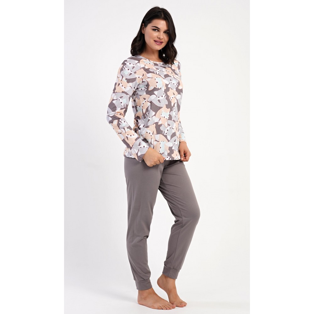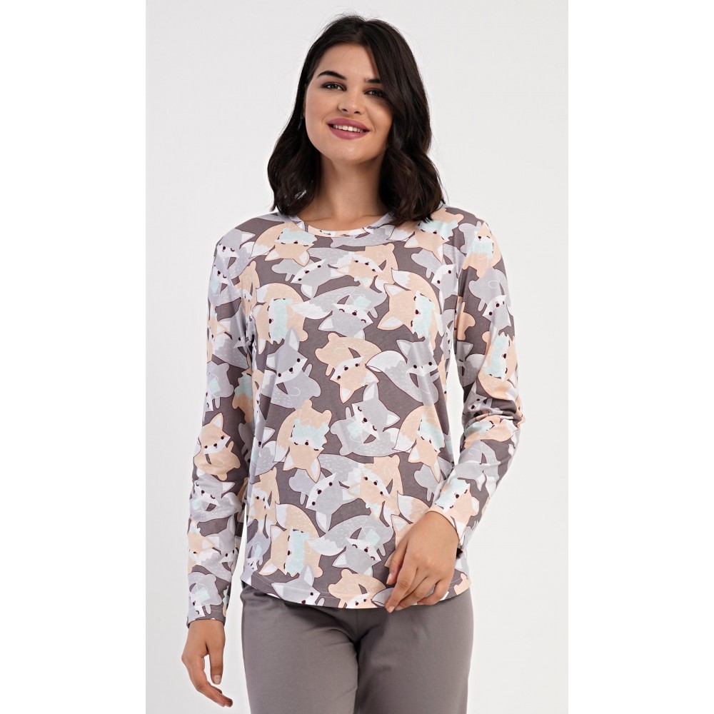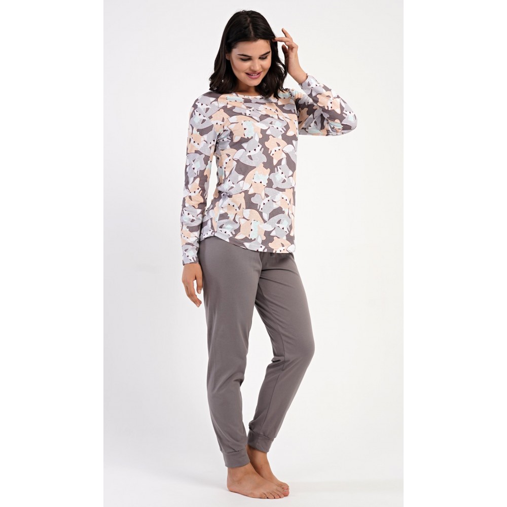 Dámské bavlněné dlouhé pyžamo Kamarádi z lesa. Dámské pyžamo se skládá z trika s dlouhým rukávem a dlouhých kalhot. Triko s kulatým výstřihem je potištěno obrázky lišek a jezevců. Jednobarevné kalhoty mají v pase gumu a šňůrku na stažení, nemají kapsy. Použitý bavlněný materiál je poddajný a příjemný na dotek.