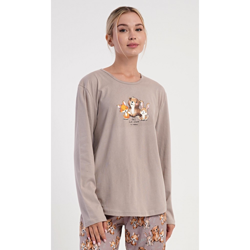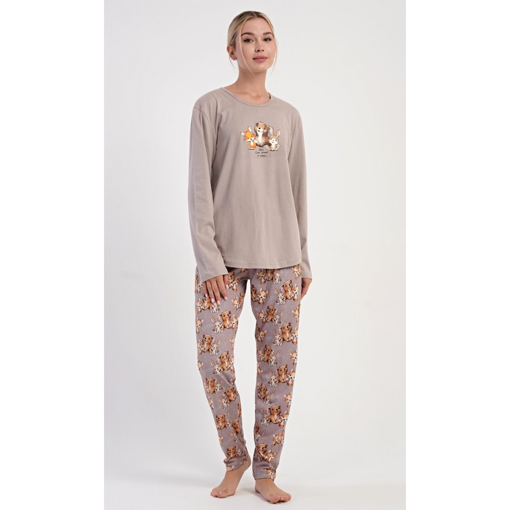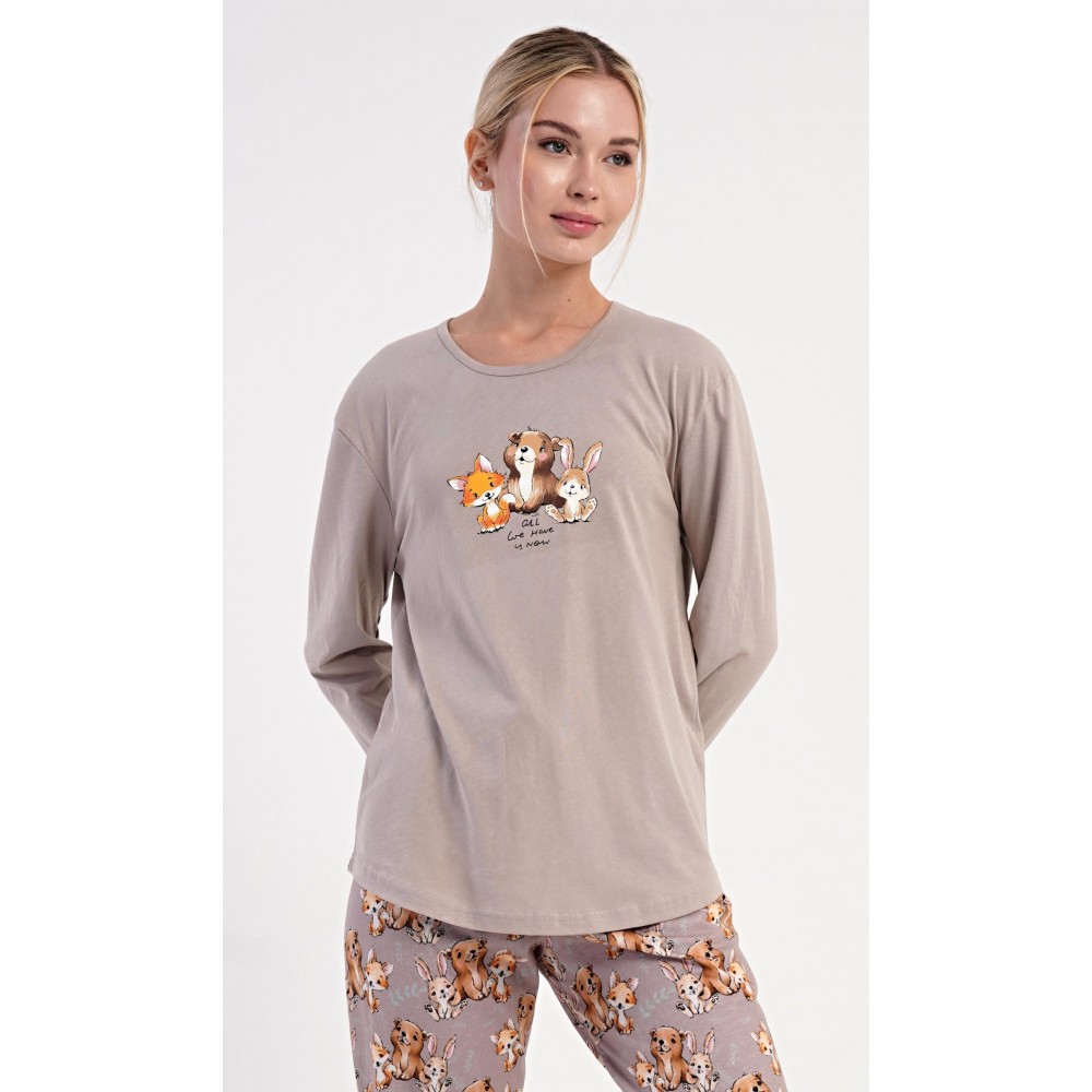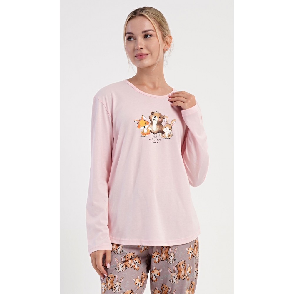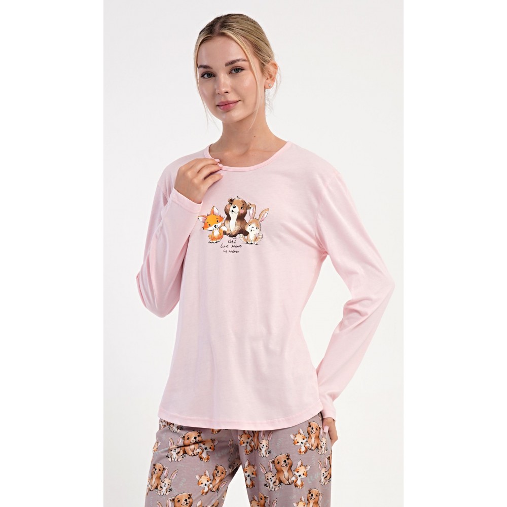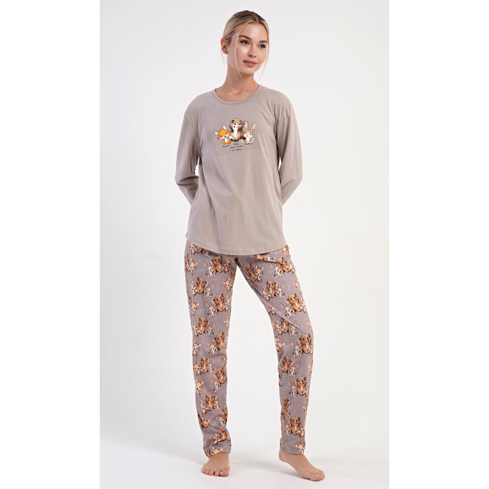 Dámské bavlněné dlouhé pyžamo Olivia. Dámské pyžamo se skládá z trika s dlouhým rukávem a dlouhých kalhot. Jednobarevné triko zdobí na hrudi obrázek malé lišky, štěněte a králíčka. Tento motiv se opakuje i na kalhotách, které mají v pase gumu a šňůrku na stažení, nemají kapsy. Použitý bavlněný materiál je poddajný a příjemný na dotek.