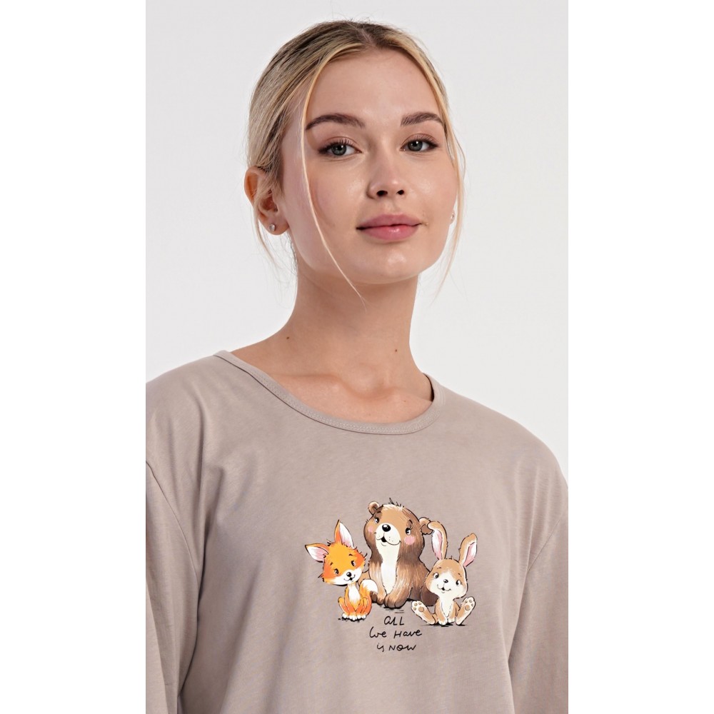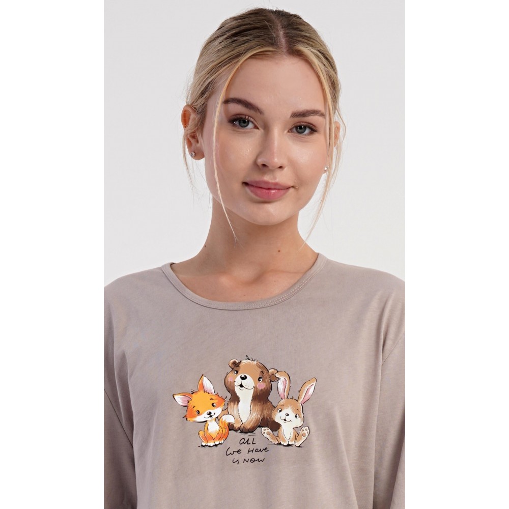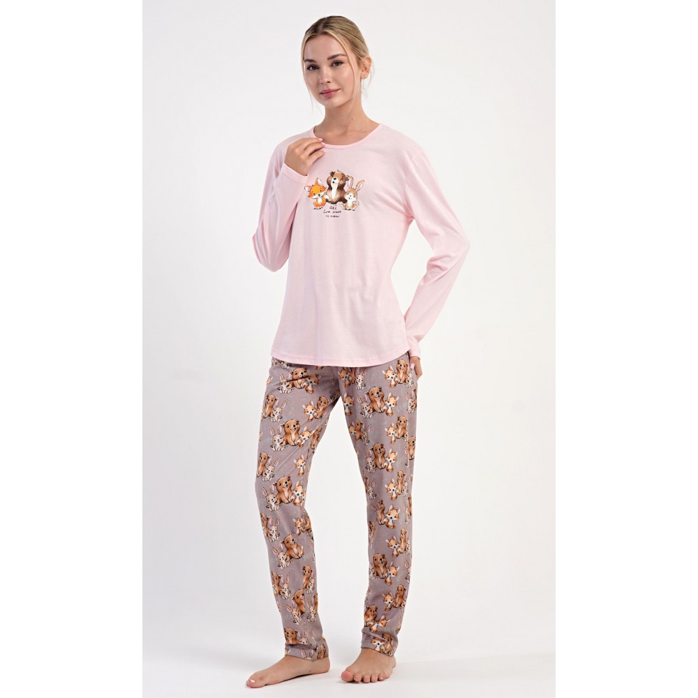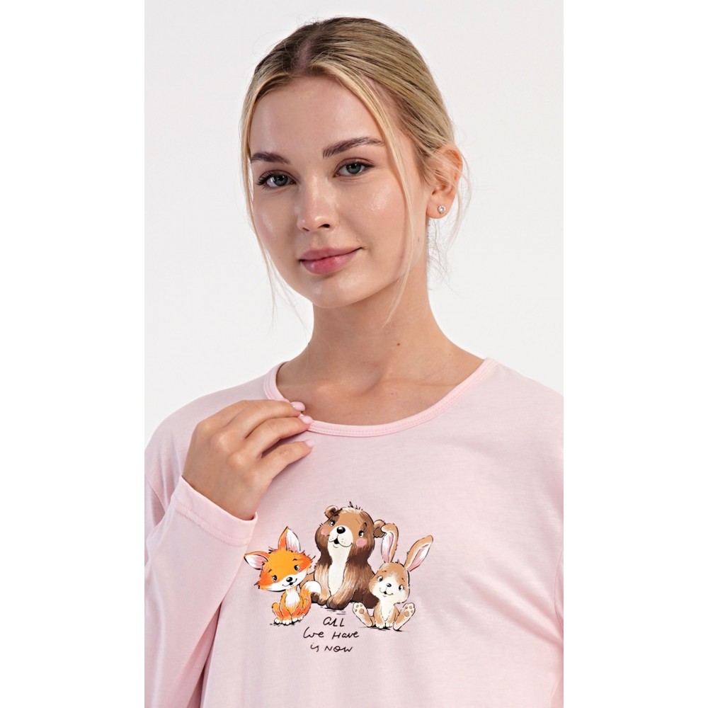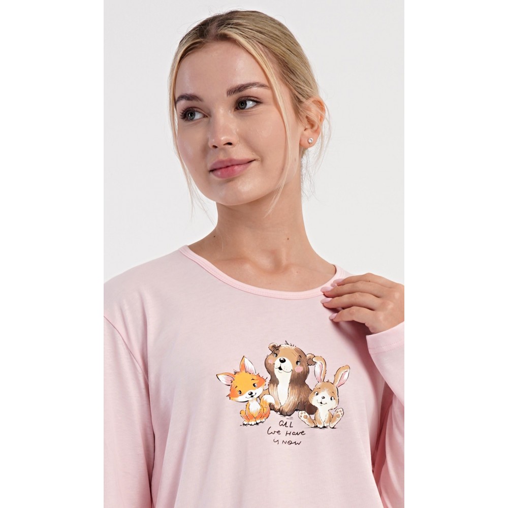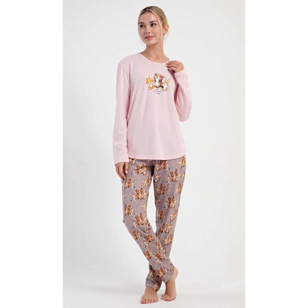 Dámské bavlněné dlouhé pyžamo Olivia. Dámské pyžamo se skládá z trika s dlouhým rukávem a dlouhých kalhot. Jednobarevné triko zdobí na hrudi obrázek malé lišky, štěněte a králíčka. Tento motiv se opakuje i na kalhotách, které mají v pase gumu a šňůrku na stažení, nemají kapsy. Použitý bavlněný materiál je poddajný a příjemný na dotek.
