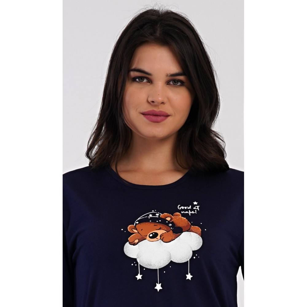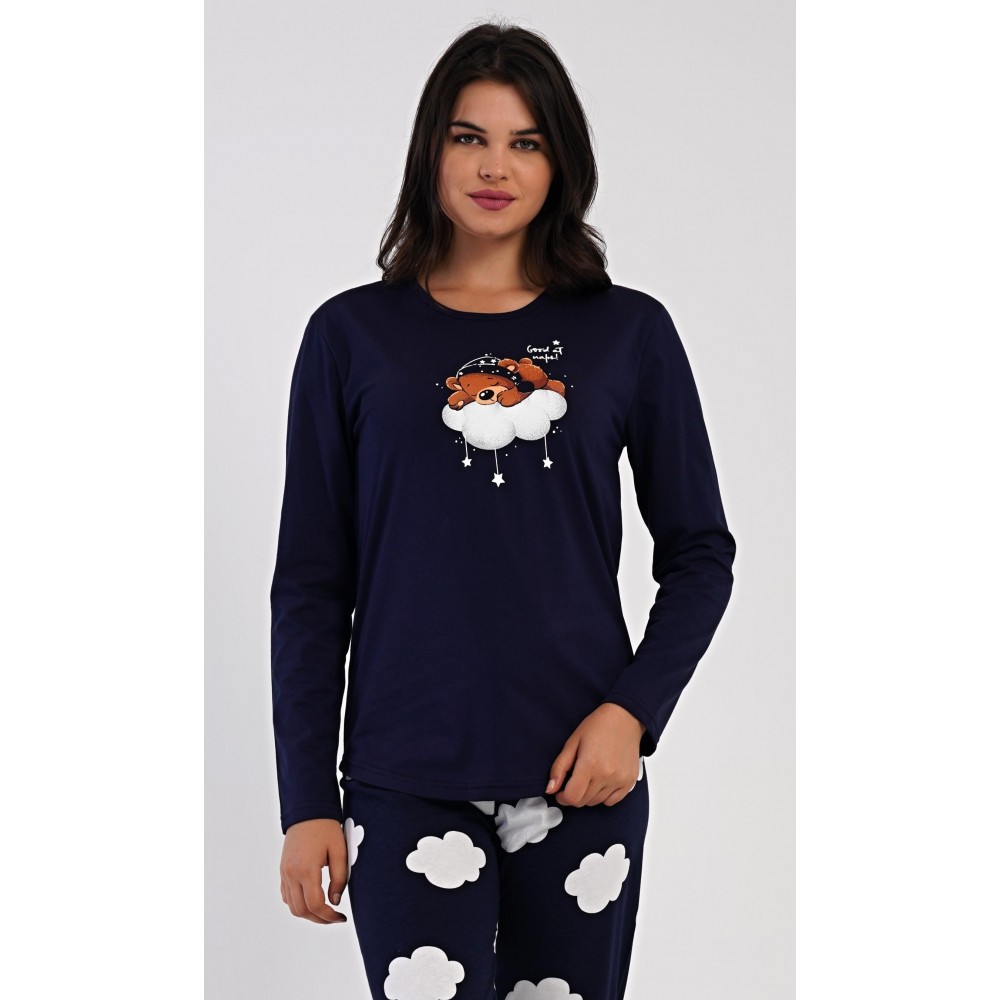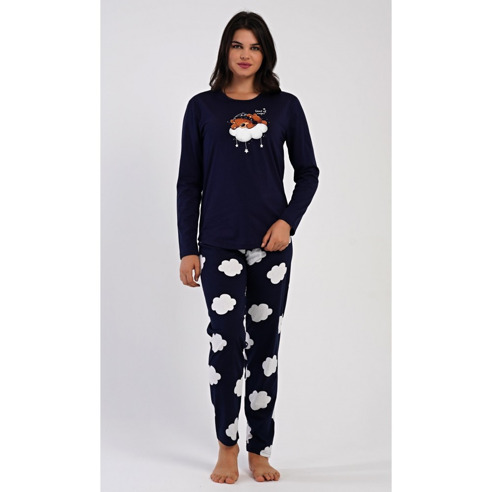 Dámské bavlněné dlouhé pyžamo Méďa na obláčku. Dámské pyžamo se skládá z trika s dlouhým rukávem a dlouhých kalhot. Jednobarevné triko je ozdobeno obrázkem medvěda na obláčku. Tento motiv se opakuje i na kalhotách, které mají v pase gumu a šňůrku na stažení, nemají kapsy. Použitý bavlněný materiál je poddajný a příjemný na dotek.