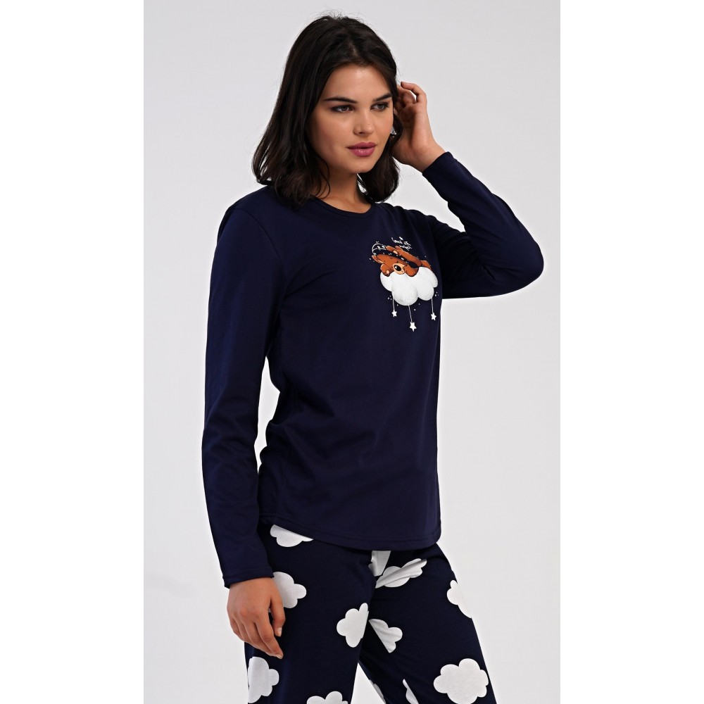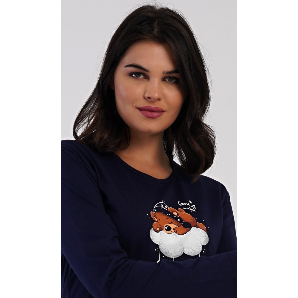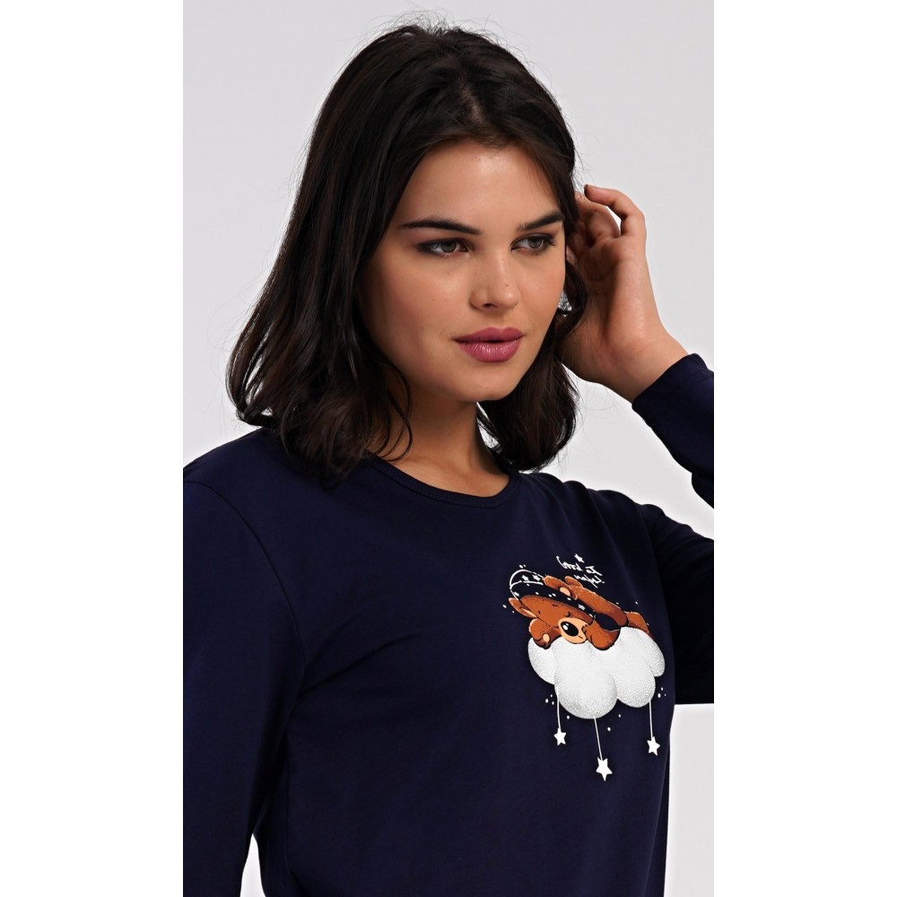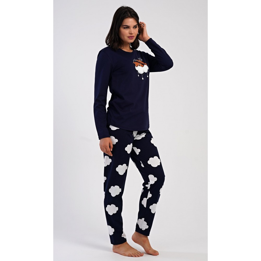 Dámské bavlněné dlouhé pyžamo Méďa na obláčku. Dámské pyžamo se skládá z trika s dlouhým rukávem a dlouhých kalhot. Jednobarevné triko je ozdobeno obrázkem medvěda na obláčku. Tento motiv se opakuje i na kalhotách, které mají v pase gumu a šňůrku na stažení, nemají kapsy. Použitý bavlněný materiál je poddajný a příjemný na dotek.