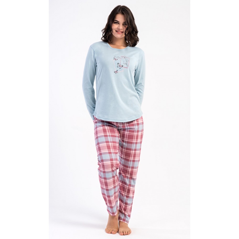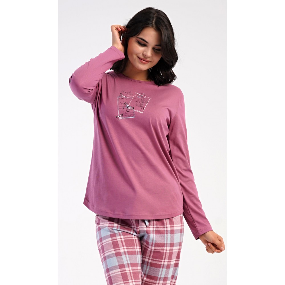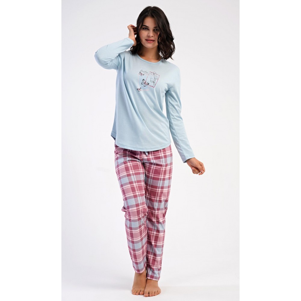 Dámské bavlněné dlouhé pyžamo Charlotte. Dámské pyžamo se skládá z trika s dlouhým rukávem a dlouhých kalhot. Jednobarevné triko s kulatým výstřihem zdobí na hrudi motýlci. Kárované kalhoty mají v pase gumu a šňůrku na stažení, nemají kapsy. Použitý bavlněný materiál je poddajný a příjemný na dotek.