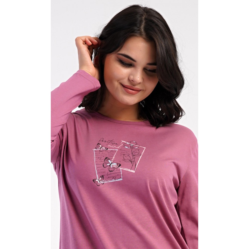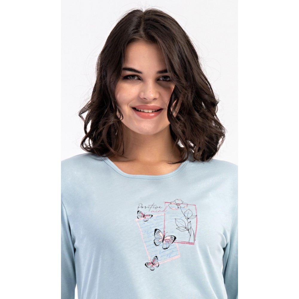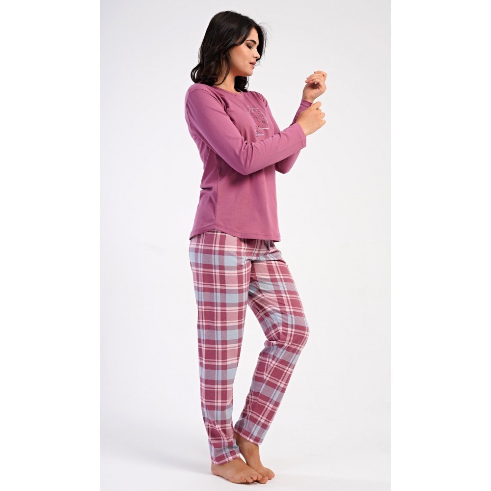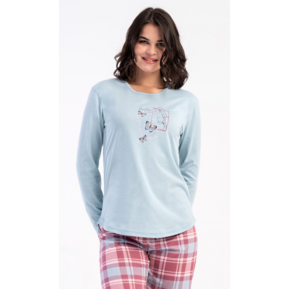 Dámské bavlněné dlouhé pyžamo Charlotte. Dámské pyžamo se skládá z trika s dlouhým rukávem a dlouhých kalhot. Jednobarevné triko s kulatým výstřihem zdobí na hrudi motýlci. Kárované kalhoty mají v pase gumu a šňůrku na stažení, nemají kapsy. Použitý bavlněný materiál je poddajný a příjemný na dotek.