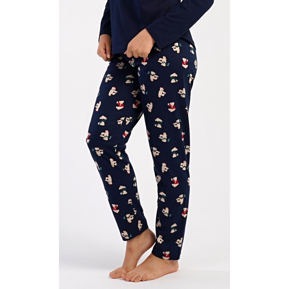 Dámské bavlněné dlouhé pyžamo Sabrina. Dámské pyžamo se skládá z trika s dlouhým rukávem a dlouhých kalhot. Triko je jednobarevné, bez potisku, má kulatý výstřih. Kalhoty s potiskem medvídků mají v pase gumu a šňůrku na stažení, nemají kapsy. Použitý bavlněný materiál je poddajný a příjemný na dotek.