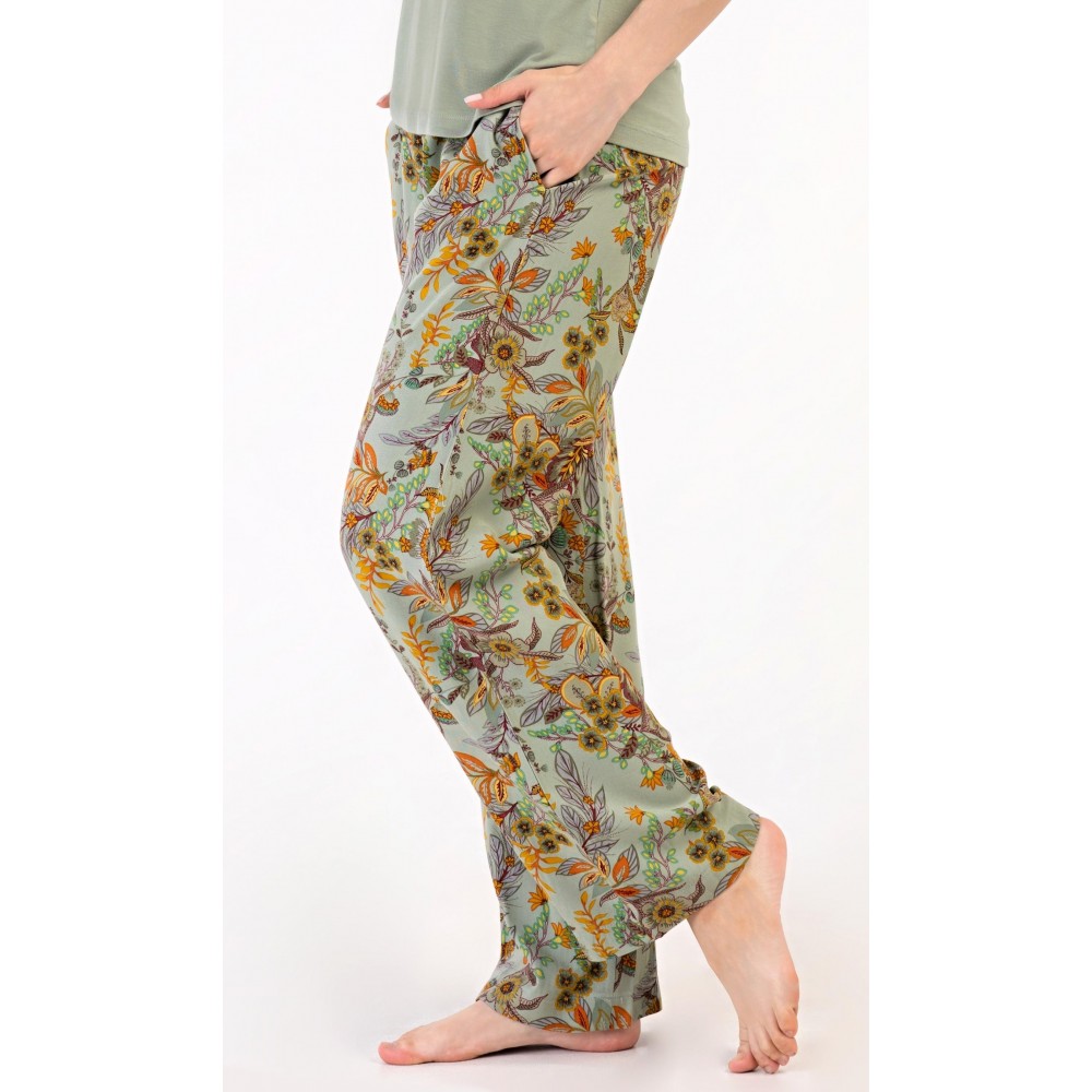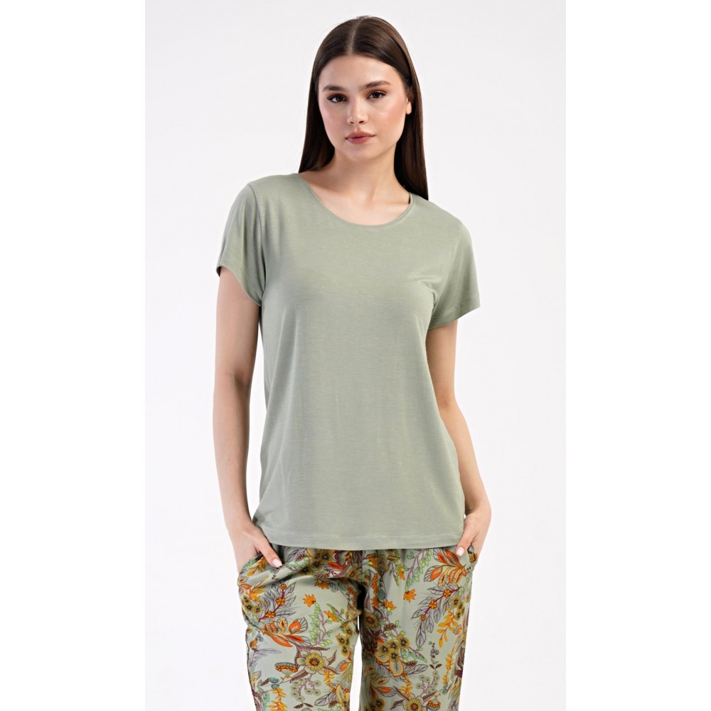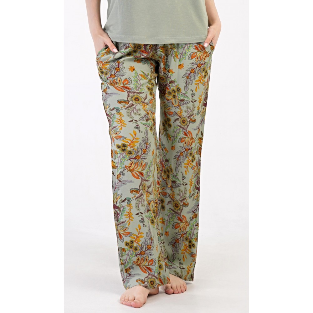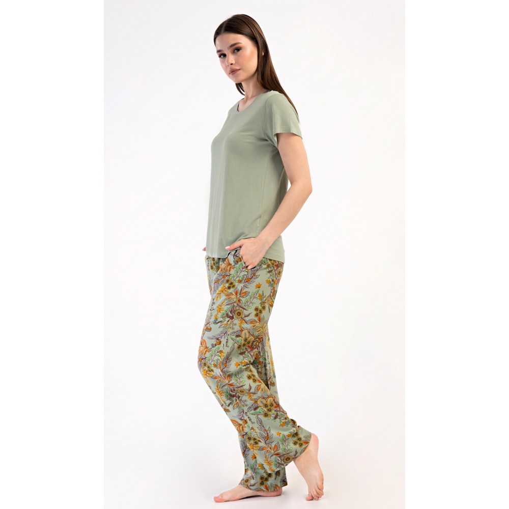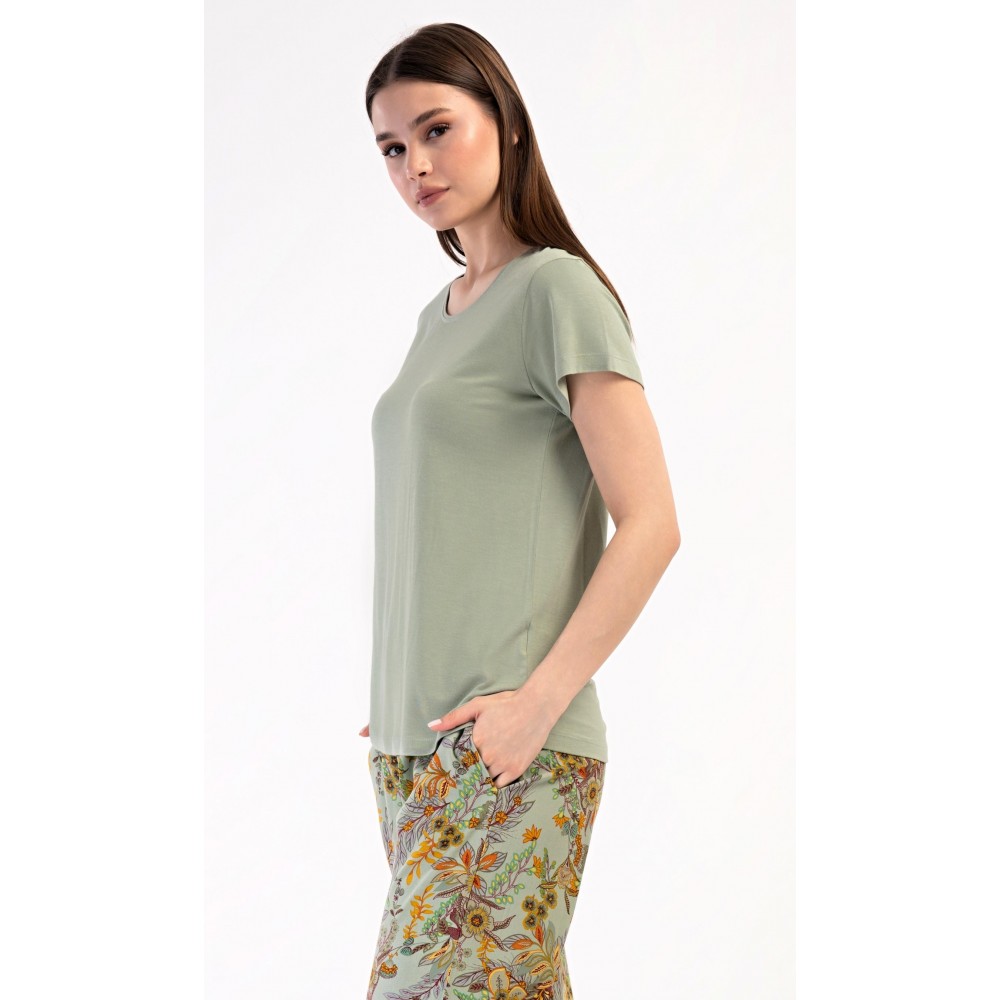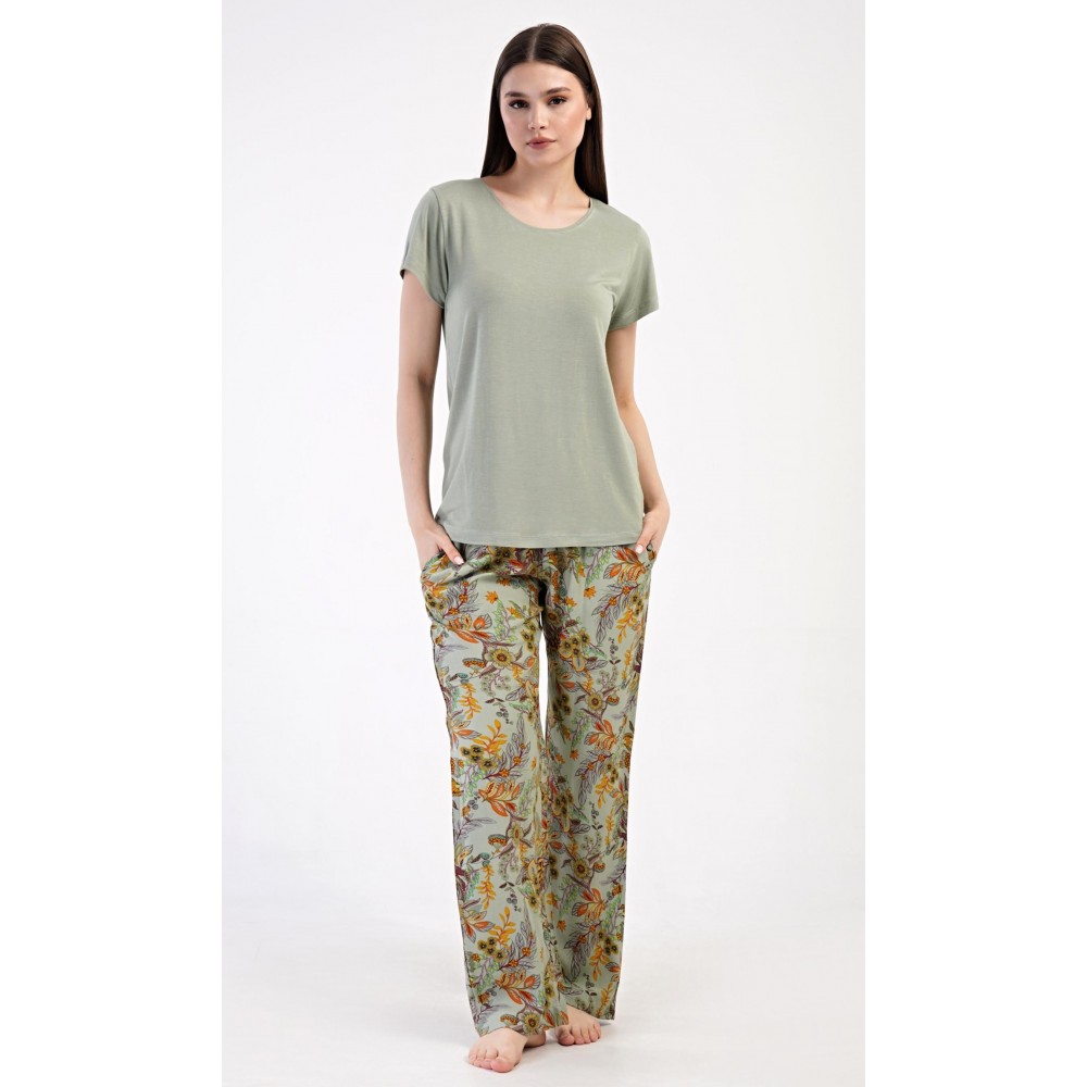 Dámské pyžamo s krátkým rukávem Marta. Dámské pyžamo se skládá z trika s krátkým rukávem a dlouhých kalhot. Triko je jednobarevné, bez potisku, má kulatý výstřih. Kalhoty potištěné květinovým vzorem mají v pase gumu a šňůrku na stažení, nemají kapsy. Použitý viskózový materiál je poddajný a příjemný na dotek.