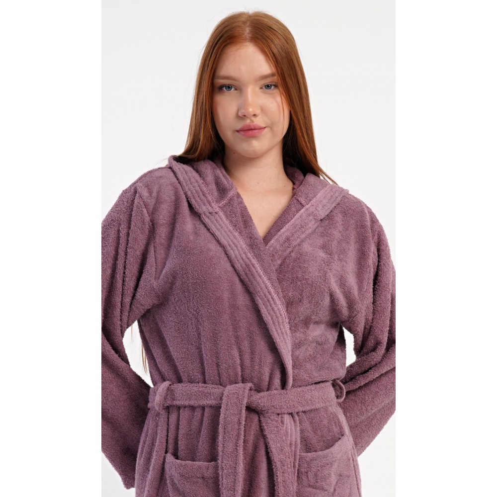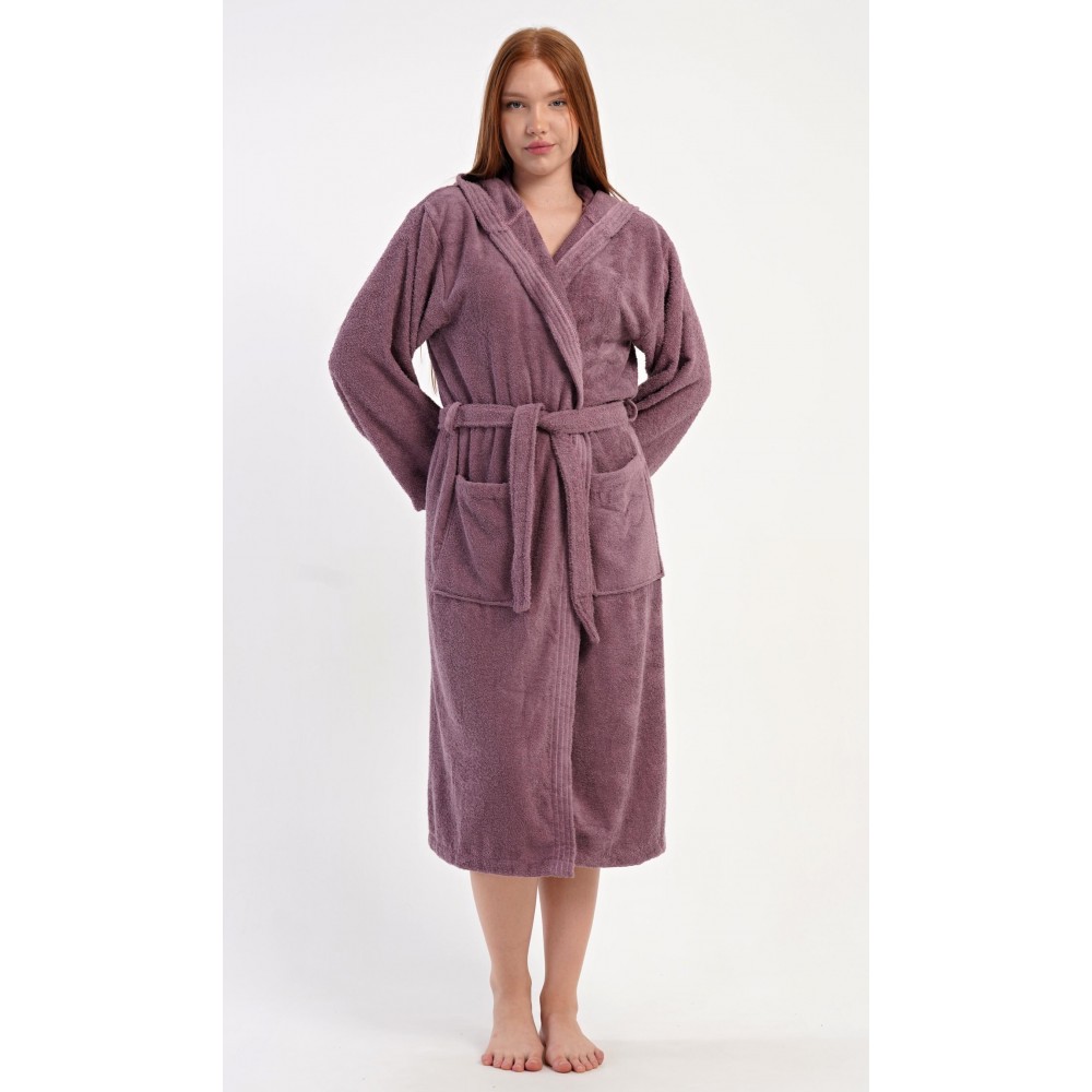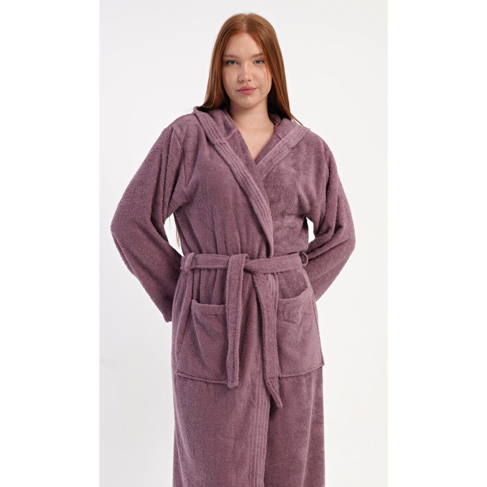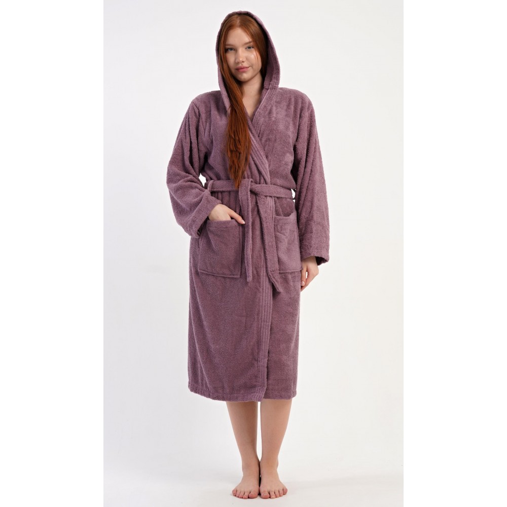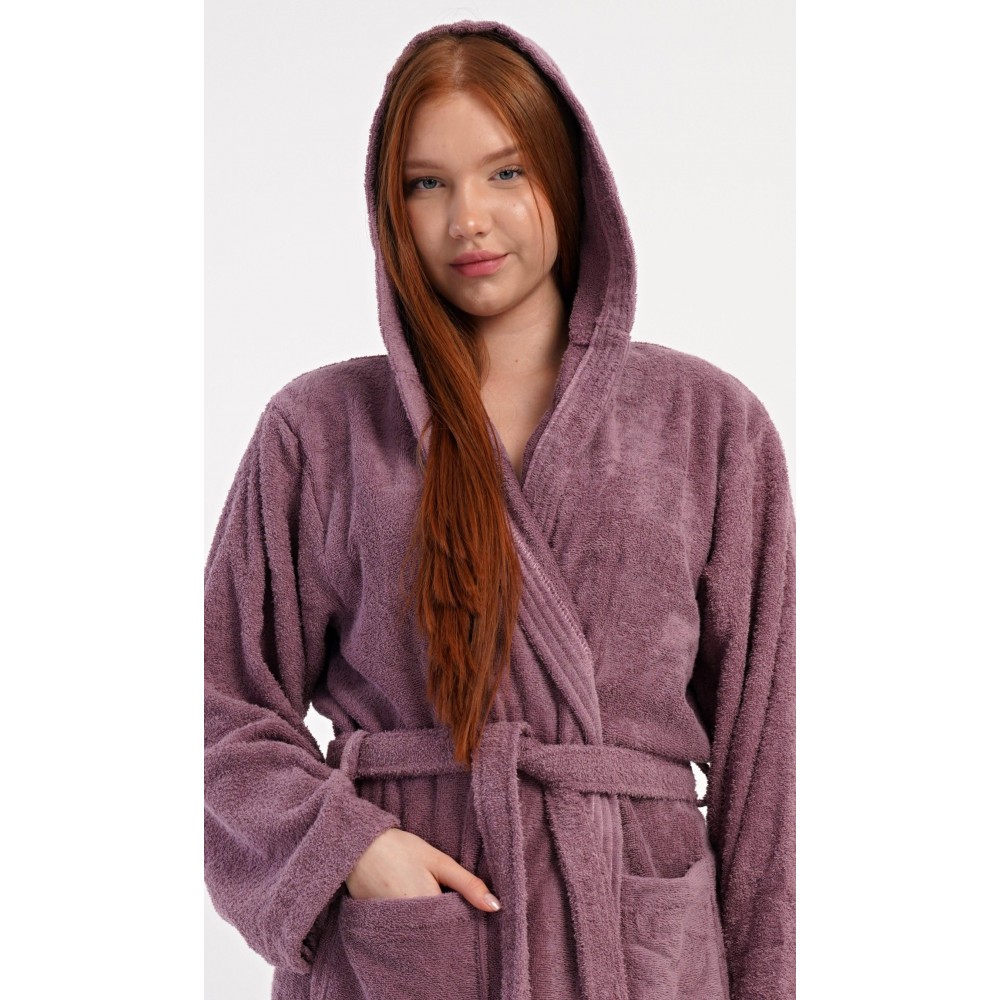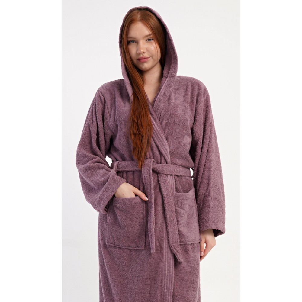 Dámský bavlněný froté župan s kapucí Vřes. Dámský dlouhý župan s kapucí a páskem ke stažení je vhodný po koupeli i na povalování se doma na gauči. Froté župan má praktické kapsy, které oceníte při návštěvě wellness. Použitý bavlněný materiál je příjemný a poddajný na dotek.