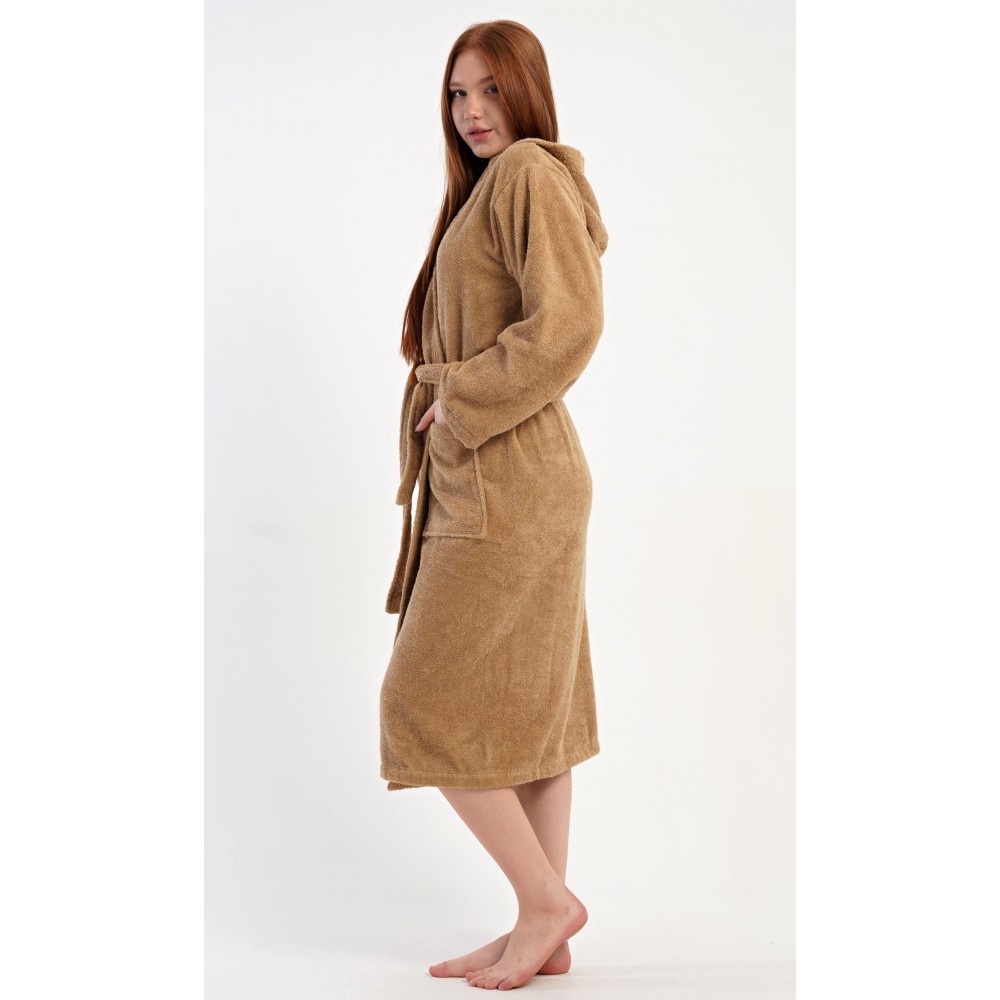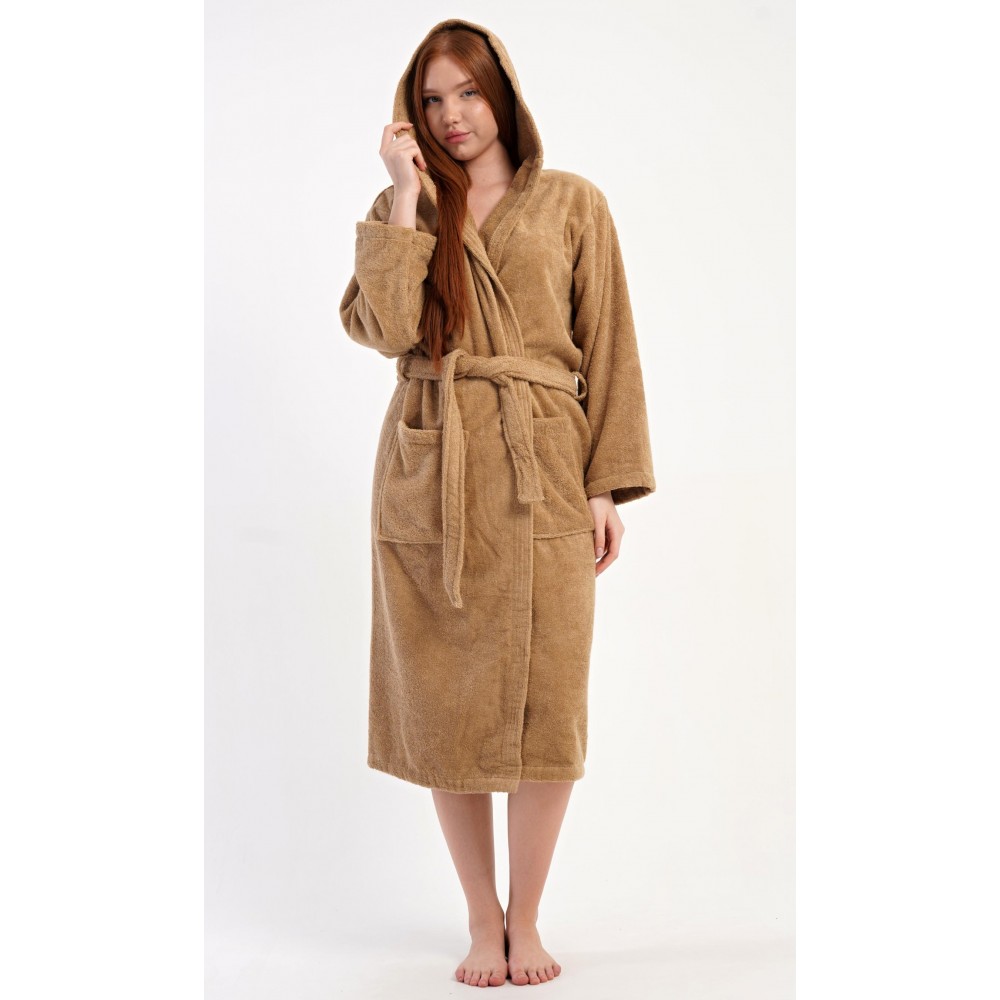 Dámský bavlněný froté župan s kapucí Karamelka. Dámský dlouhý župan s kapucí a páskem ke stažení je vhodný po koupeli i na povalování se doma na gauči. Froté župan má praktické kapsy, které oceníte při návštěvě wellness. Použitý bavlněný materiál je příjemný a poddajný na dotek.