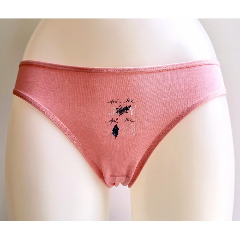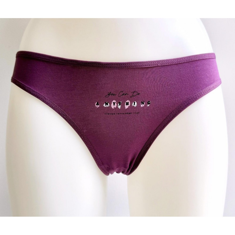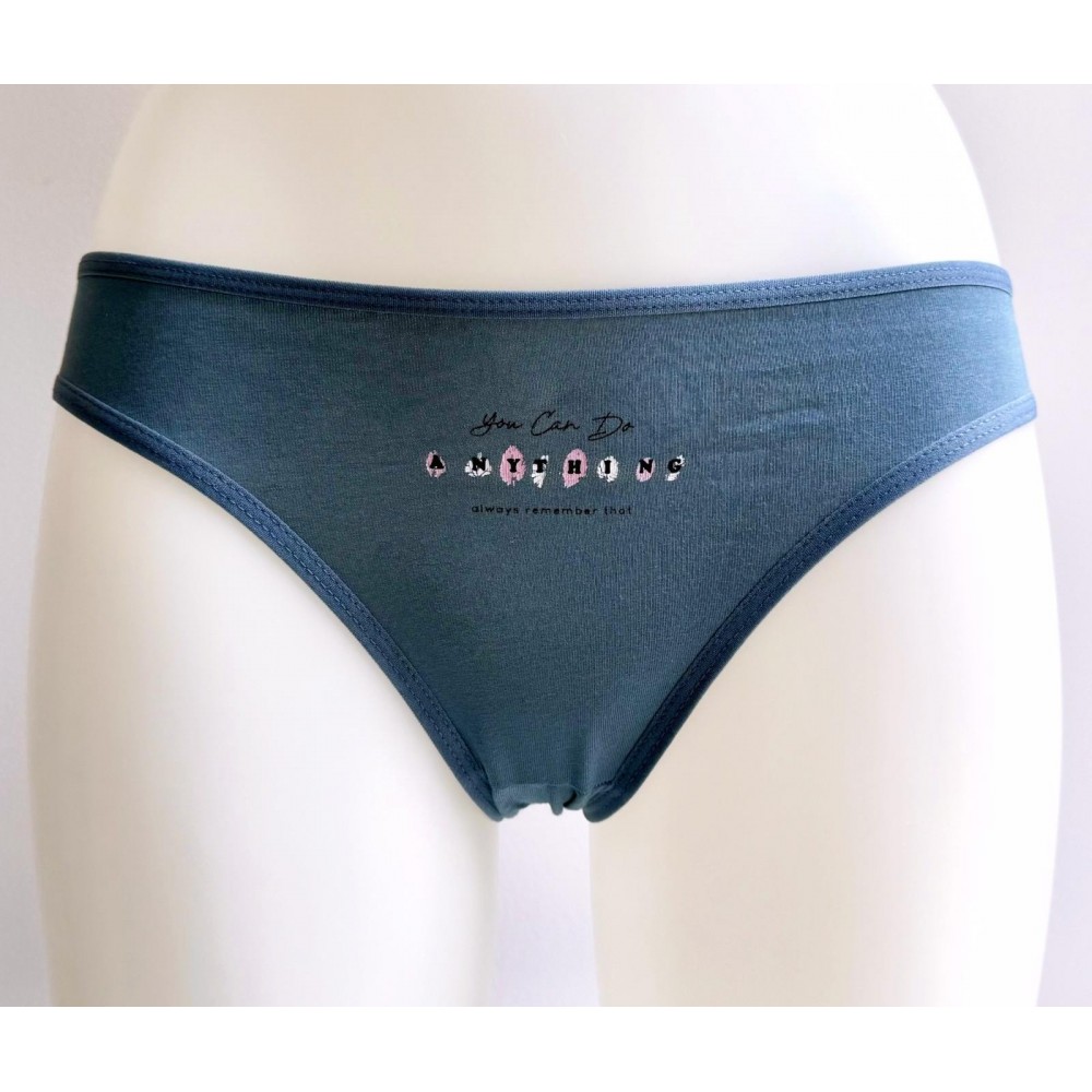 Dámské bavlněné kalhotky Eliza. Slušivé klasické kalhotky zdobené drobným nápisem jsou pohodlným typem spodního prádla pro všechny příležitosti. Obzvláště oceníte materiálové složení - 95% bavlna a 5% elasten. Použitý materiál je příjemný a poddajný na dotek.