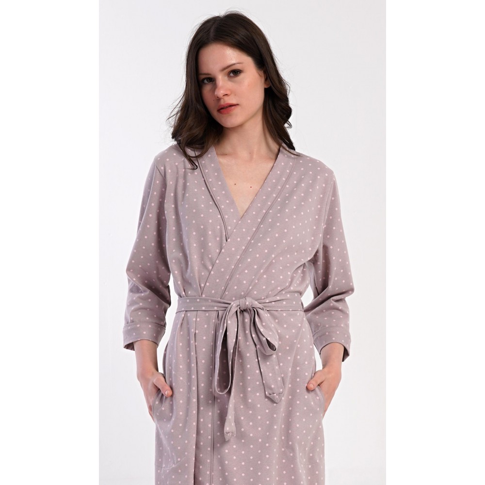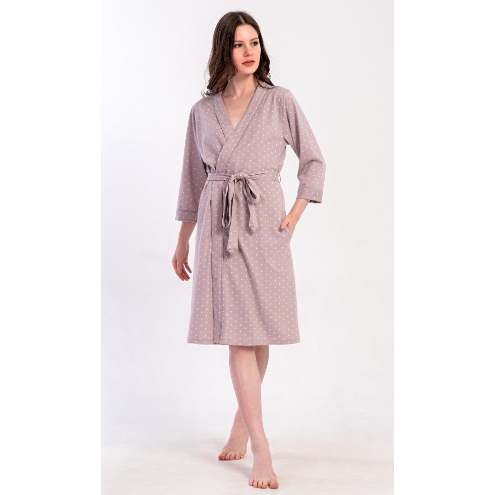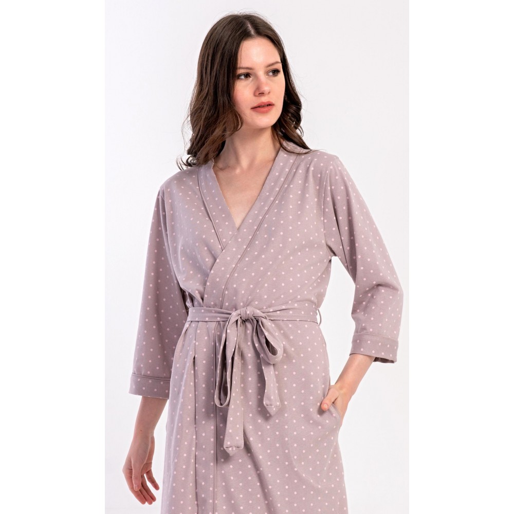 Dámský krátký bavlněný župan Adélka. Dámský župánek s tříčtvrtečním rukávem a délkou pod kolena je potišten drobnými puntíky. Župan má pásek ke stažení a praktické kapsy. Použitý bavlněný materiál je příjemný a poddajný na dotek, saje a oceníte ho i po koupeli.