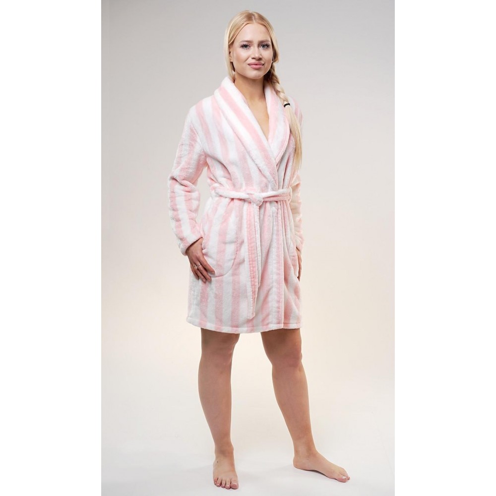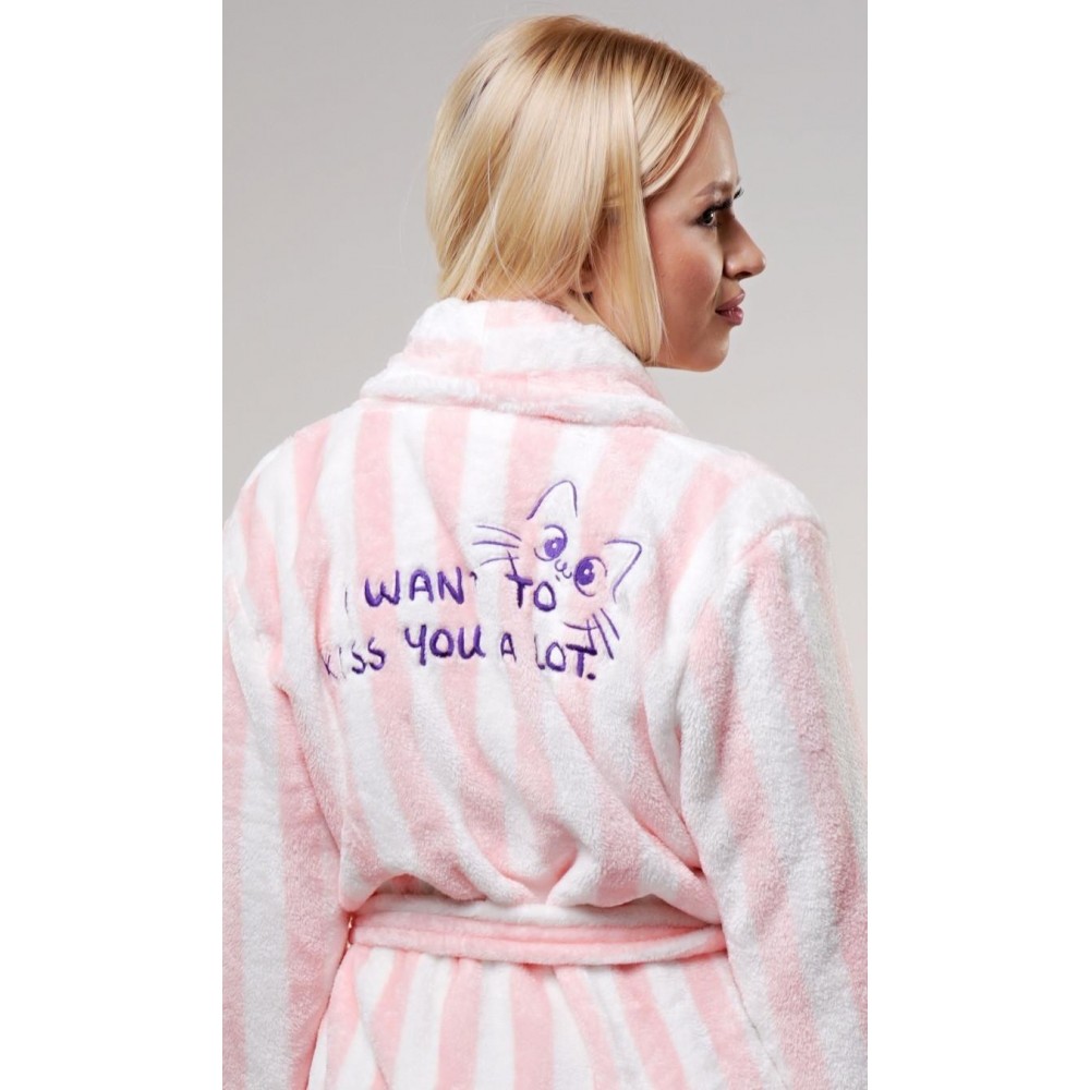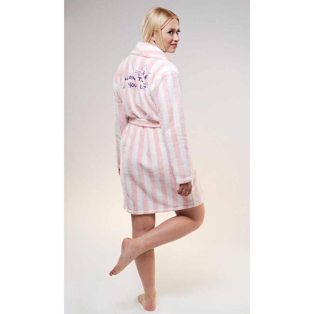 Dámský župan krátký Alice. Dámský pruhovaný župan s kapsami a páskem ke stažení má hřejivý šálový límec. Na zádech županu je nápis I want to Kiss you a lot s roztomilou kočičkou. Použitý materiál je jemný a poddajný na dotek. Župan je vhodný na denní nošení.