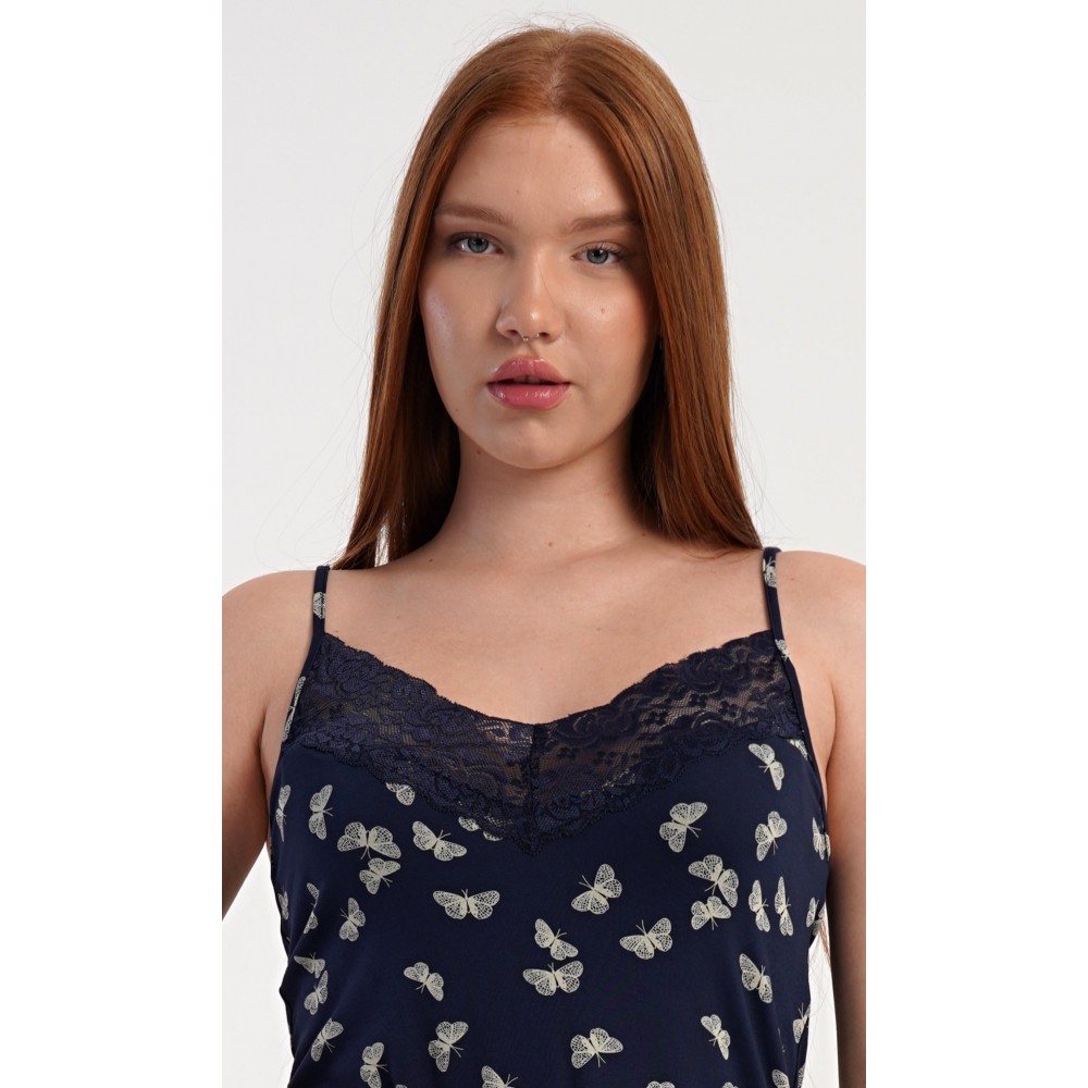 Dámská noční košile na ramínka Motýlci. Dámská noční košile s úzkými ramínky má příjemnou délku nad kolena a ozdobné žlábkování okolo spodního lemu. Ramínka jdou nastavit na Vám pohodlnou délku. Výstřih je ozvláštněn jemnou krajkou. Tmavě modrá košilka je potištěna drobnými motýlky. Použitý materiál ze směsi viskózy a lycry je příjemný a poddajný na dotek.