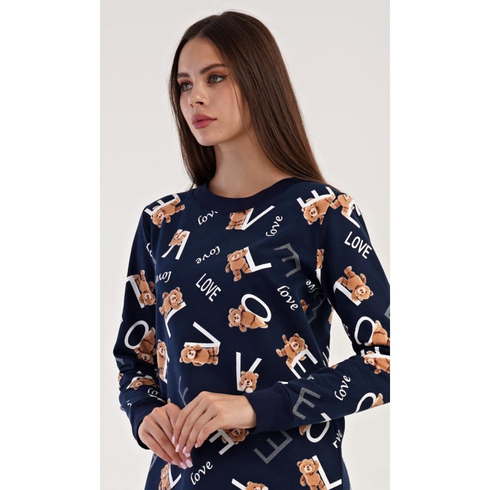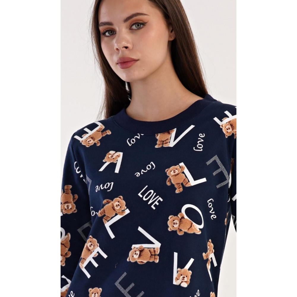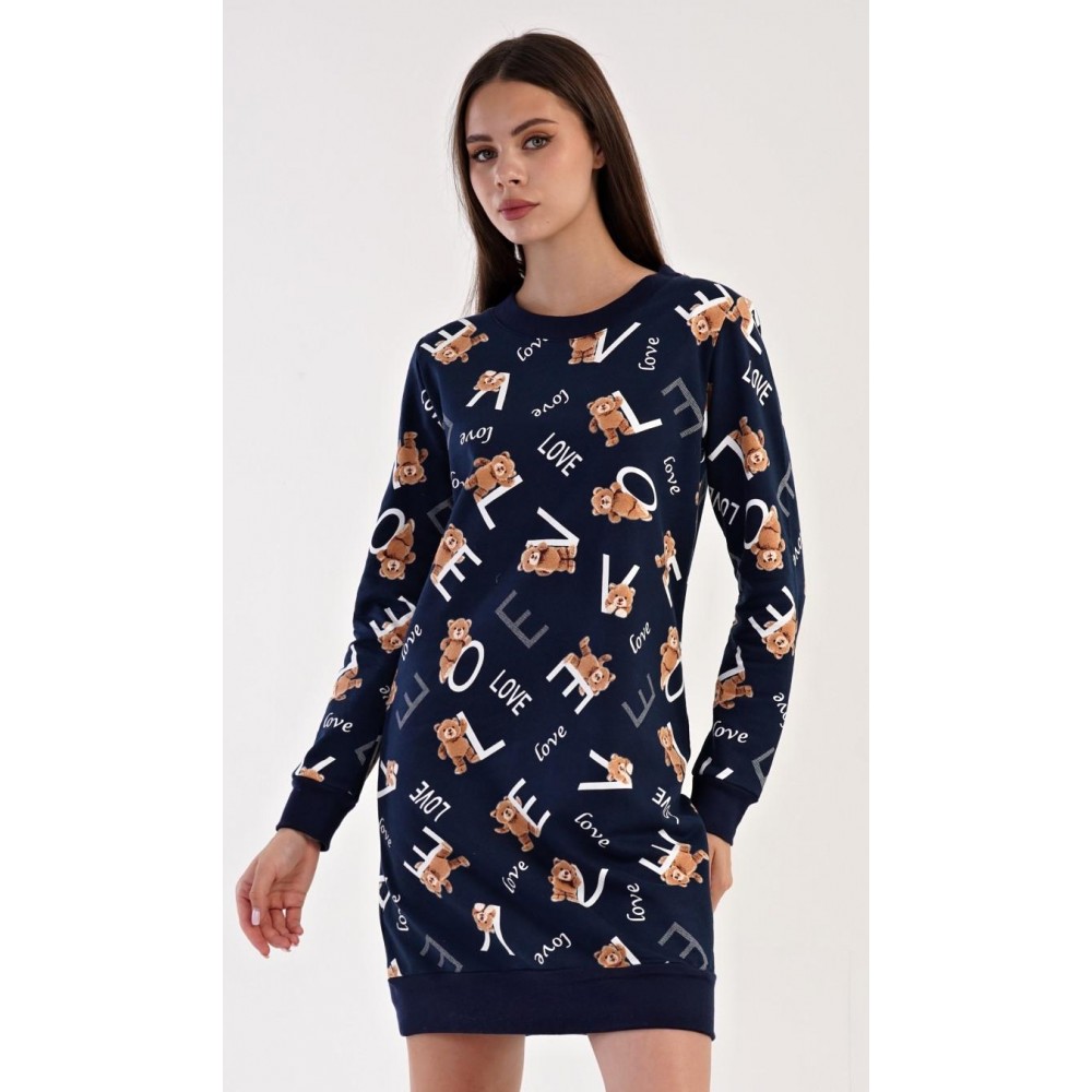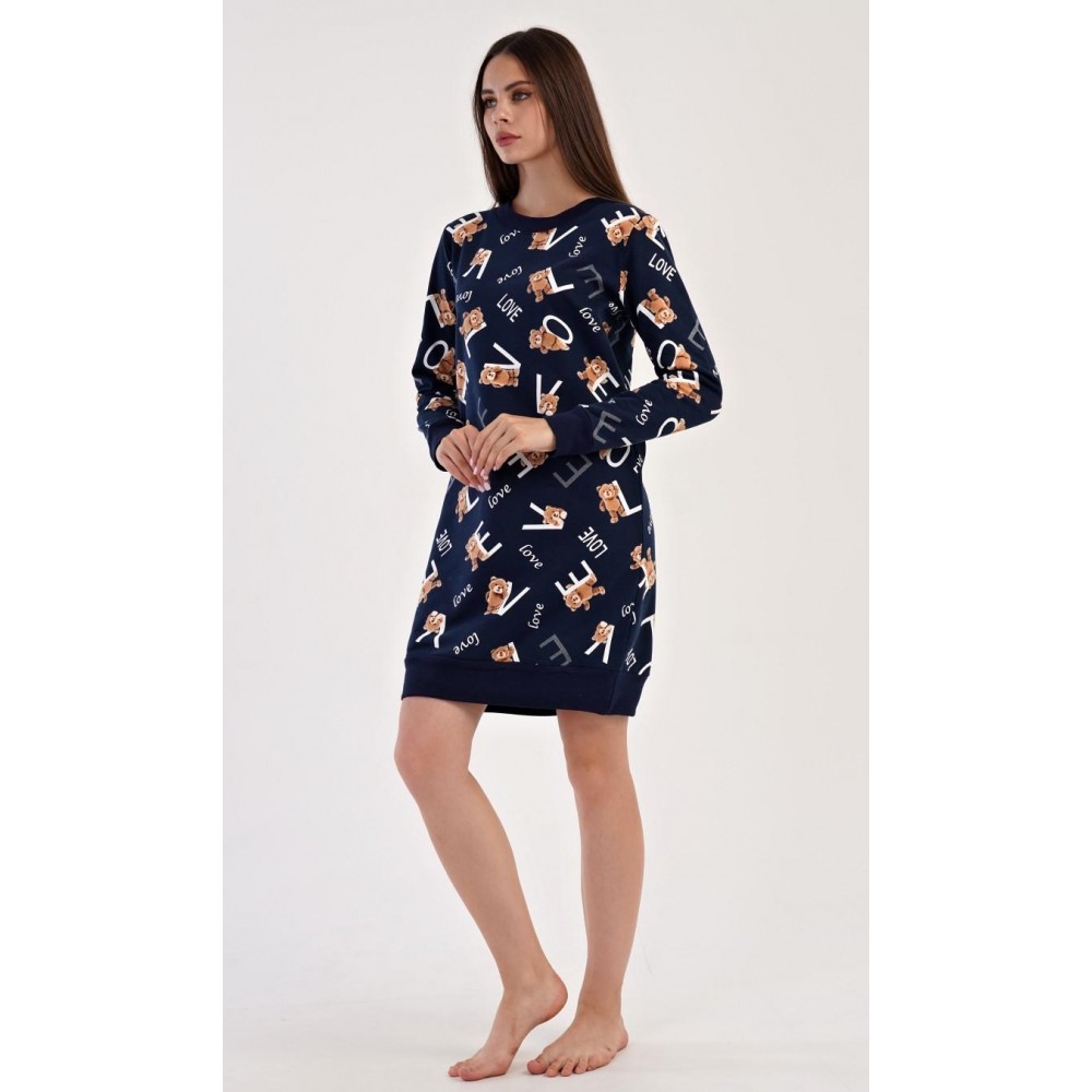 Dámská bavlněná noční košile s dlouhým rukávem Méďa. Silnější oteplený materiál je potištěný obrázky pyšových medvídků a nápisy LOVE. Rukávy a spodní lem jsou zakončeny pantem. Košile je vhodná i na denní nošení jako domácí šaty. Doplněnou o legíny ji oceníte v chladnějších dnech.