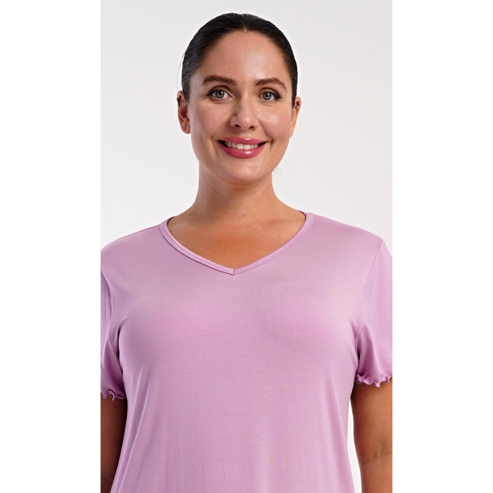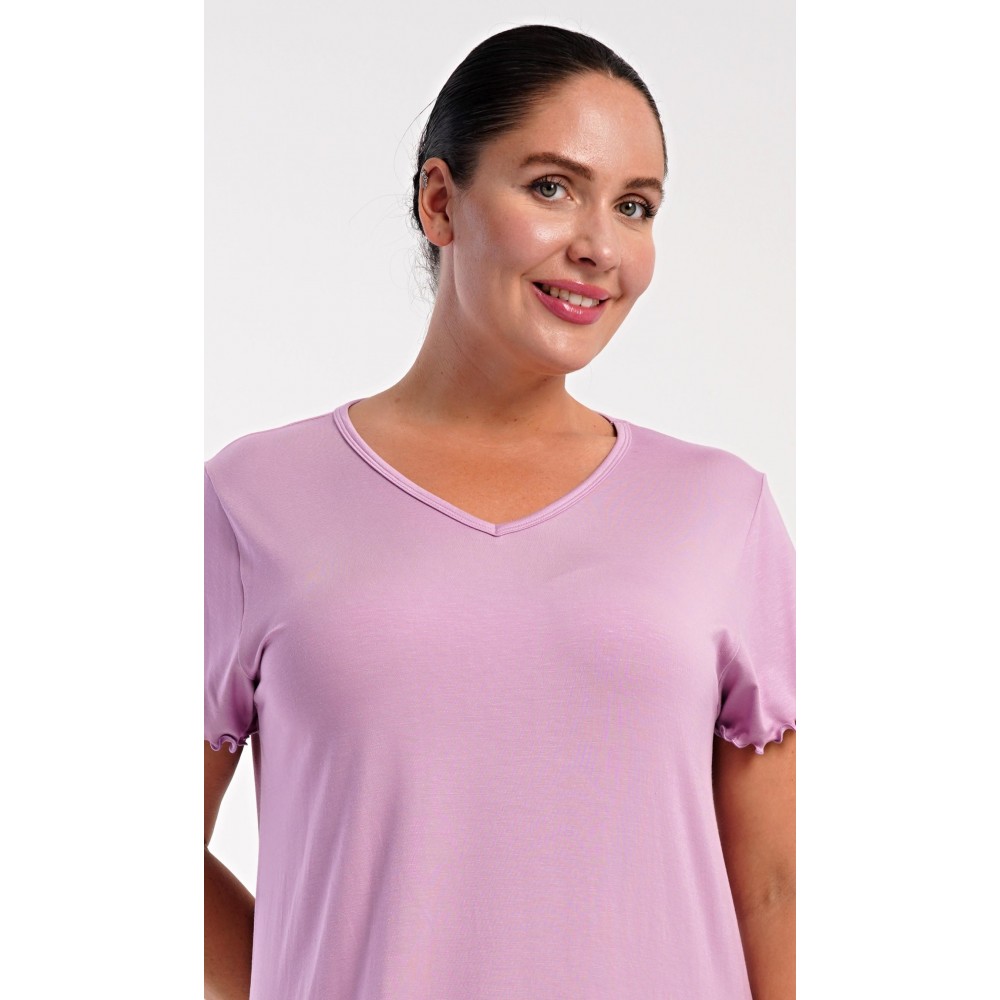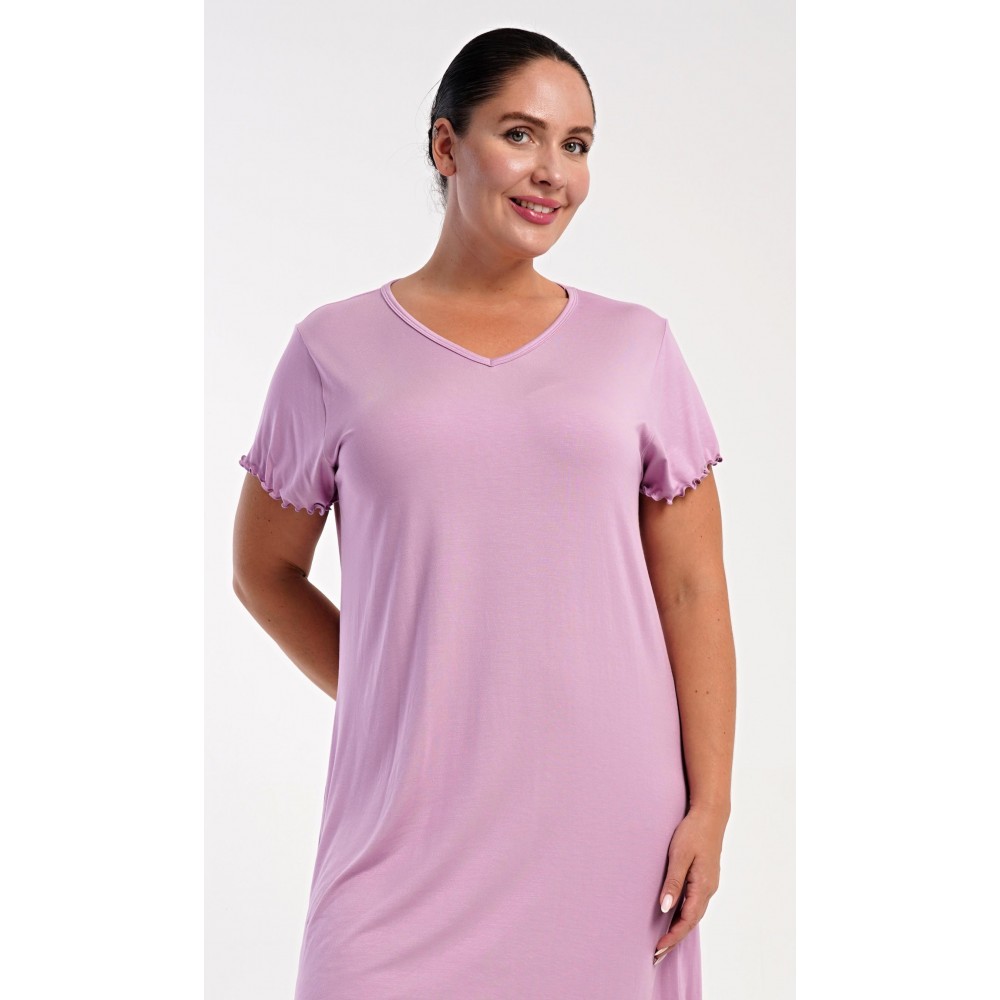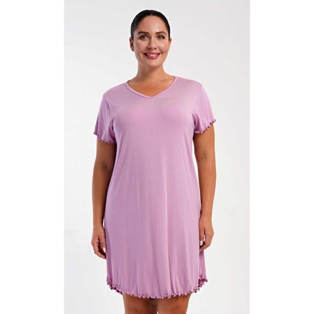 Dámská bavlněná noční košile s krátkým rukávem Liliana. Košile má příjemnou délkou nad kolena a výstřih do V, je ozdobena žlábkováním na rukávech a spodním lemu. Použitý materiál s podílem bavlny 95% je příjemný a poddajný na dotek.