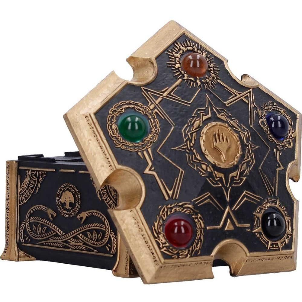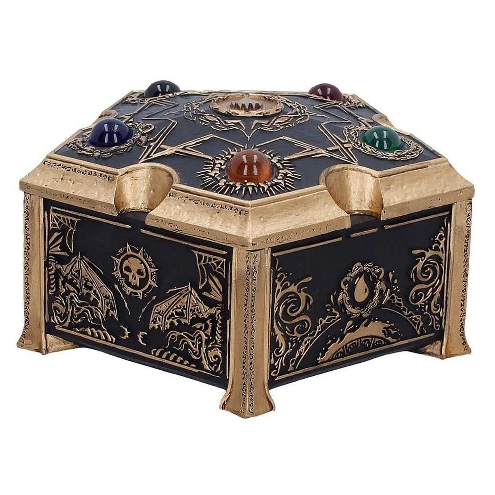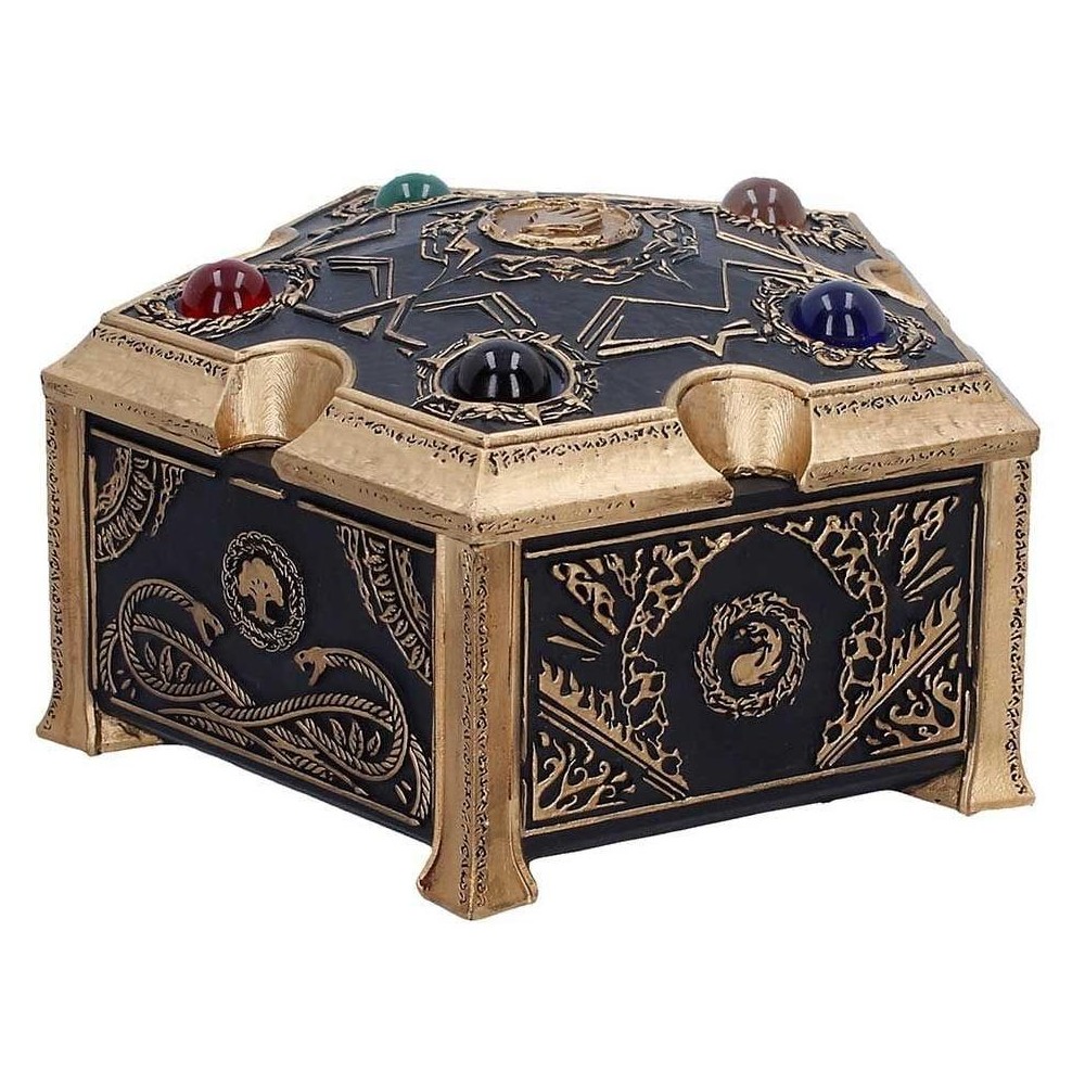 Úložný box v pentagonálním tvaru s pěticí barevných drahokamů, které představují pět různých druhů many z populární karetní hry Magic: The Gathering - skvělý strážce pro tvé poklady! Ručně malovanou krabičku zdobí spletité černé a zlaté detaily a má odnímatelné víko.