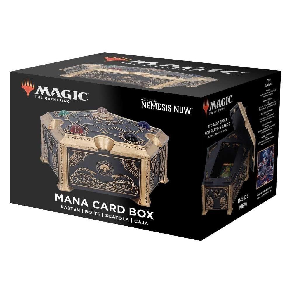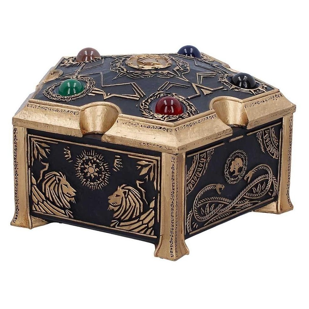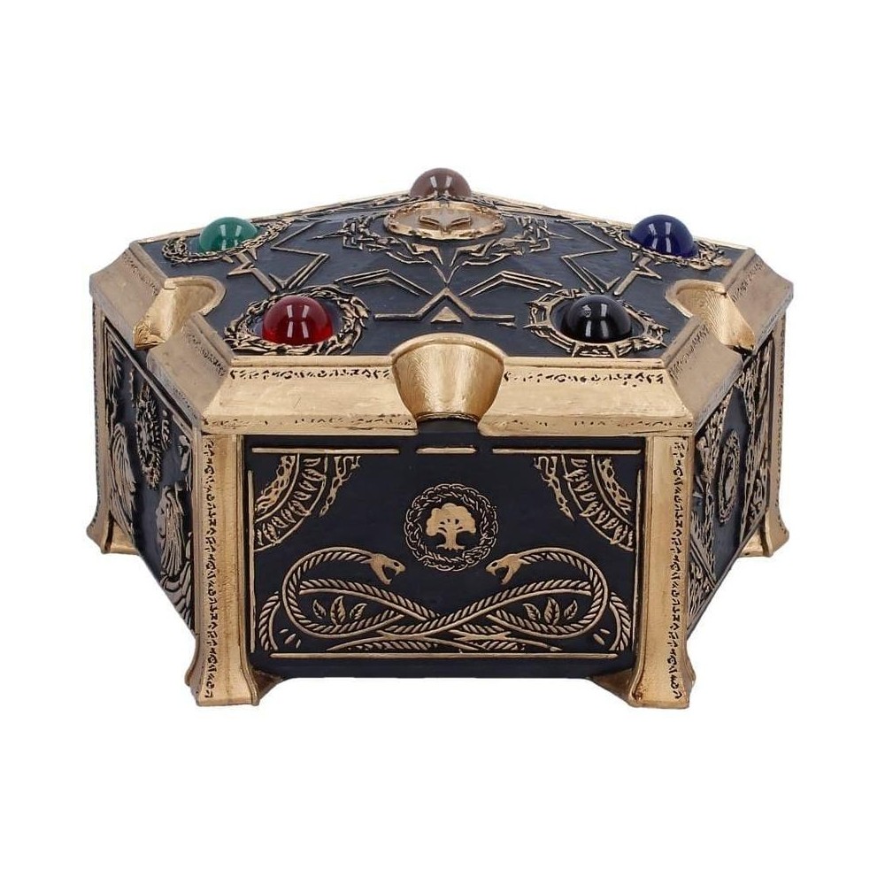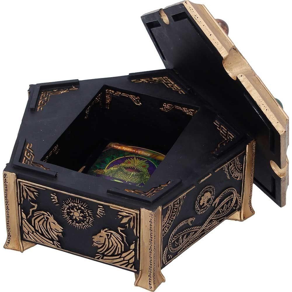 Úložný box v pentagonálním tvaru s pěticí barevných drahokamů, které představují pět různých druhů many z populární karetní hry Magic: The Gathering - skvělý strážce pro tvé poklady! Ručně malovanou krabičku zdobí spletité černé a zlaté detaily a má odnímatelné víko.