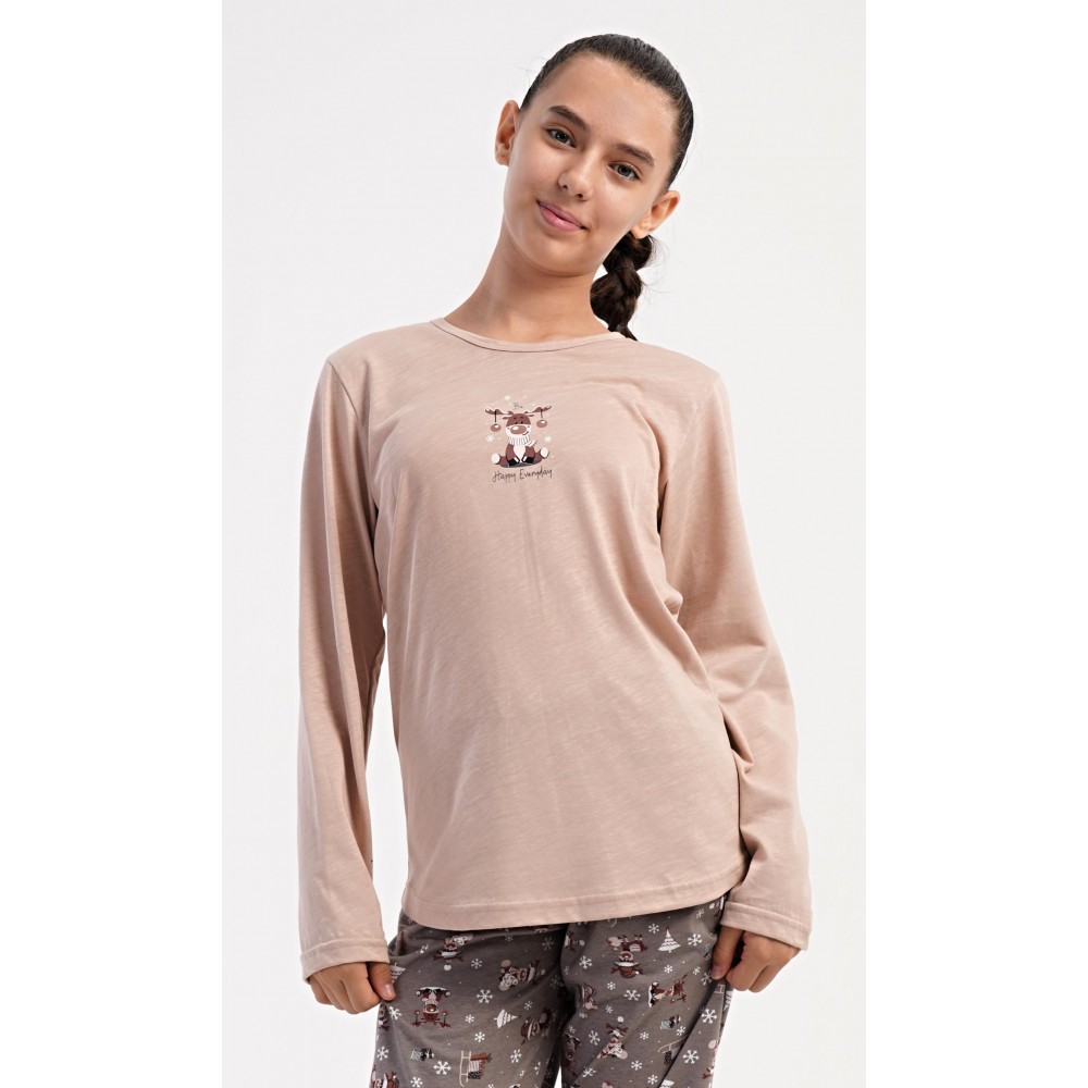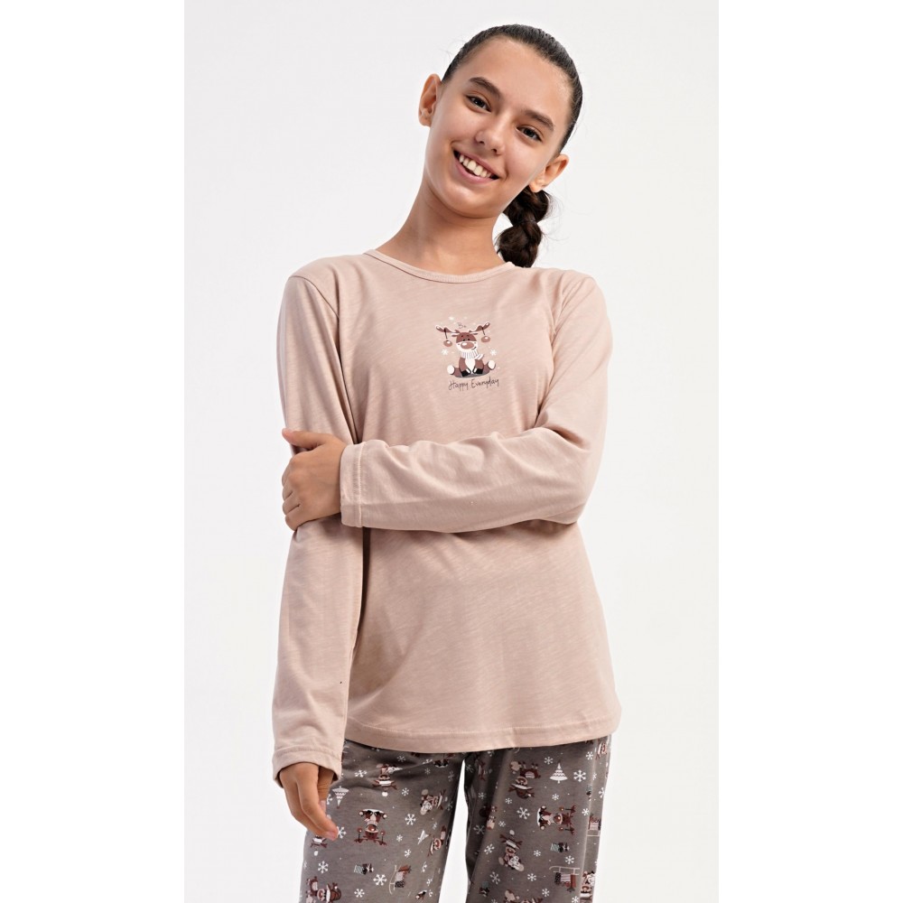 Dětské bavlněné dlouhé pyžamo Sobík. Dívčí pyžamo se skládá z trika s dlouhým rukávem a dlouhých kalhot. Triko s kulatým výstřihem je ozdobeno obrázkem malého vánočního soba. Tento motiv se opakuje i na kalhotách, které mají v pase gumu a šňůrku na stažení, nemají kapsy. Použitý bavlněný materiál je poddajný a příjemný na dotek.