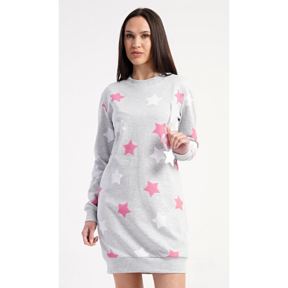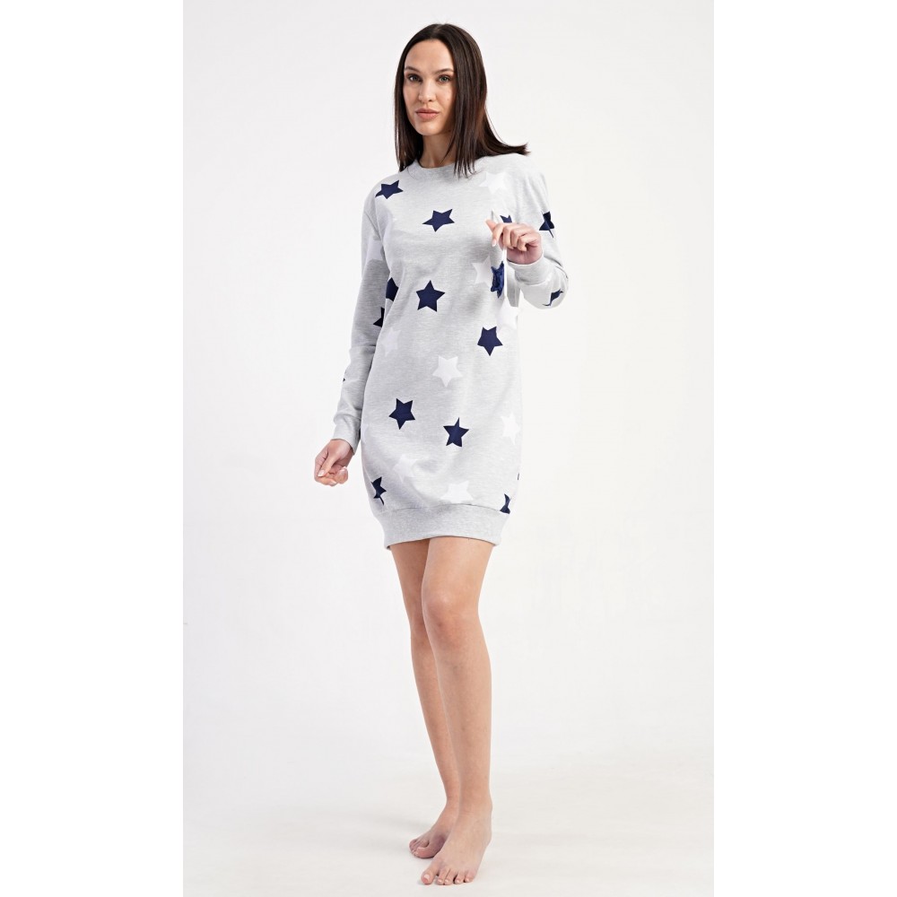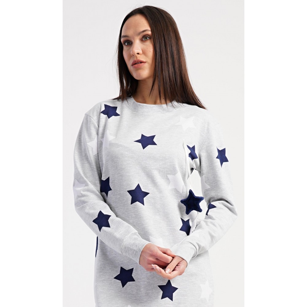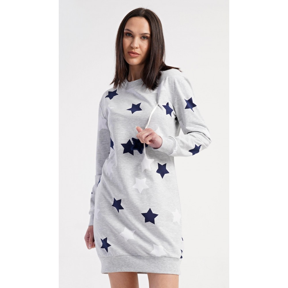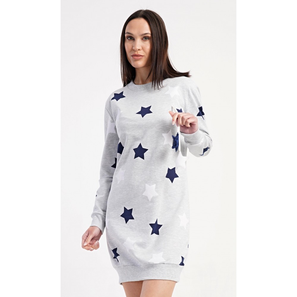 Dámské domácí šaty s dlouhým rukávem Hvězdy. Pohodlné domácí šaty s dlouhým rukávem a kulatým výstřihem zdobí potisk hvězd. Použitý oteplený materiál s obsahem bavlny 70% je příjemný a poddajný na dotek.