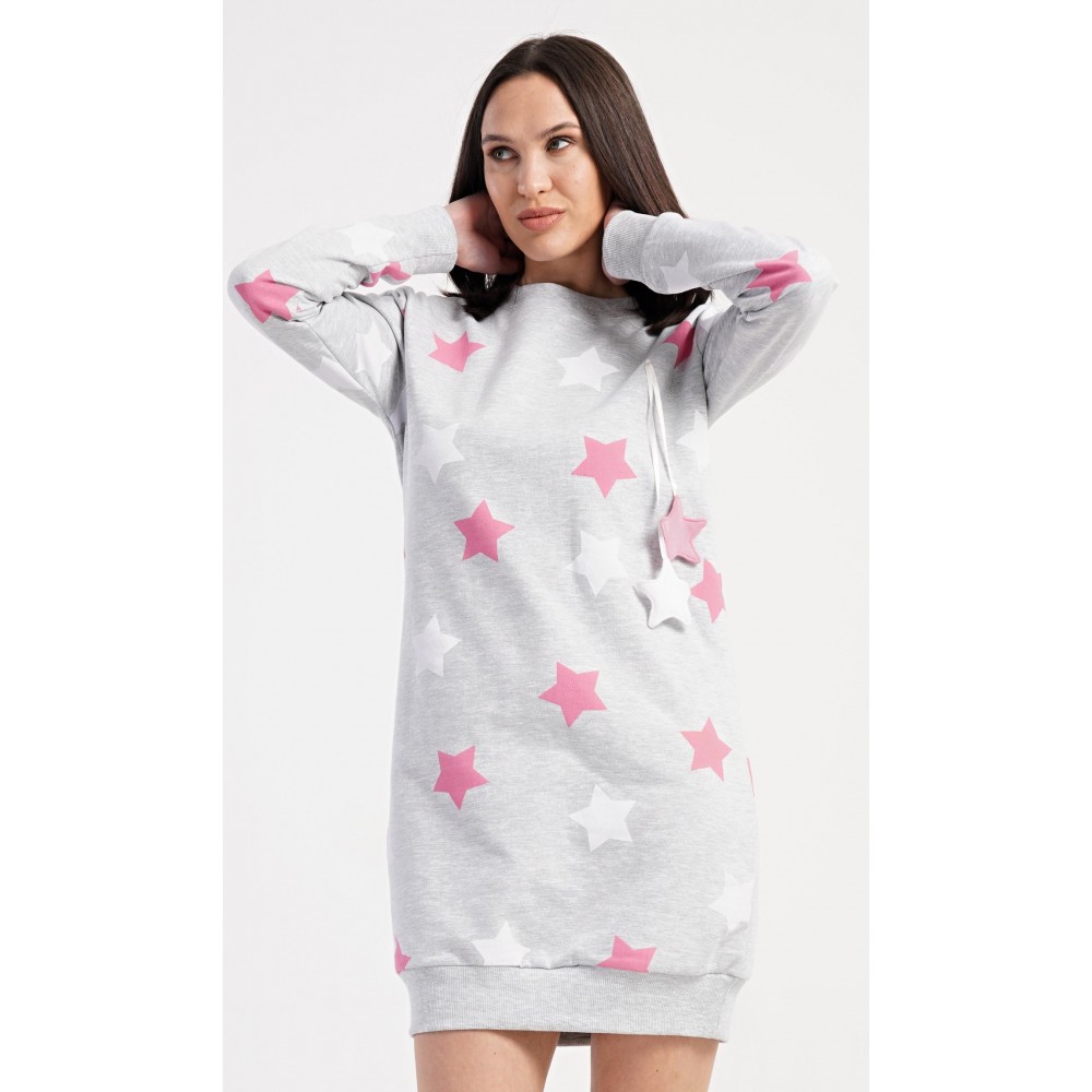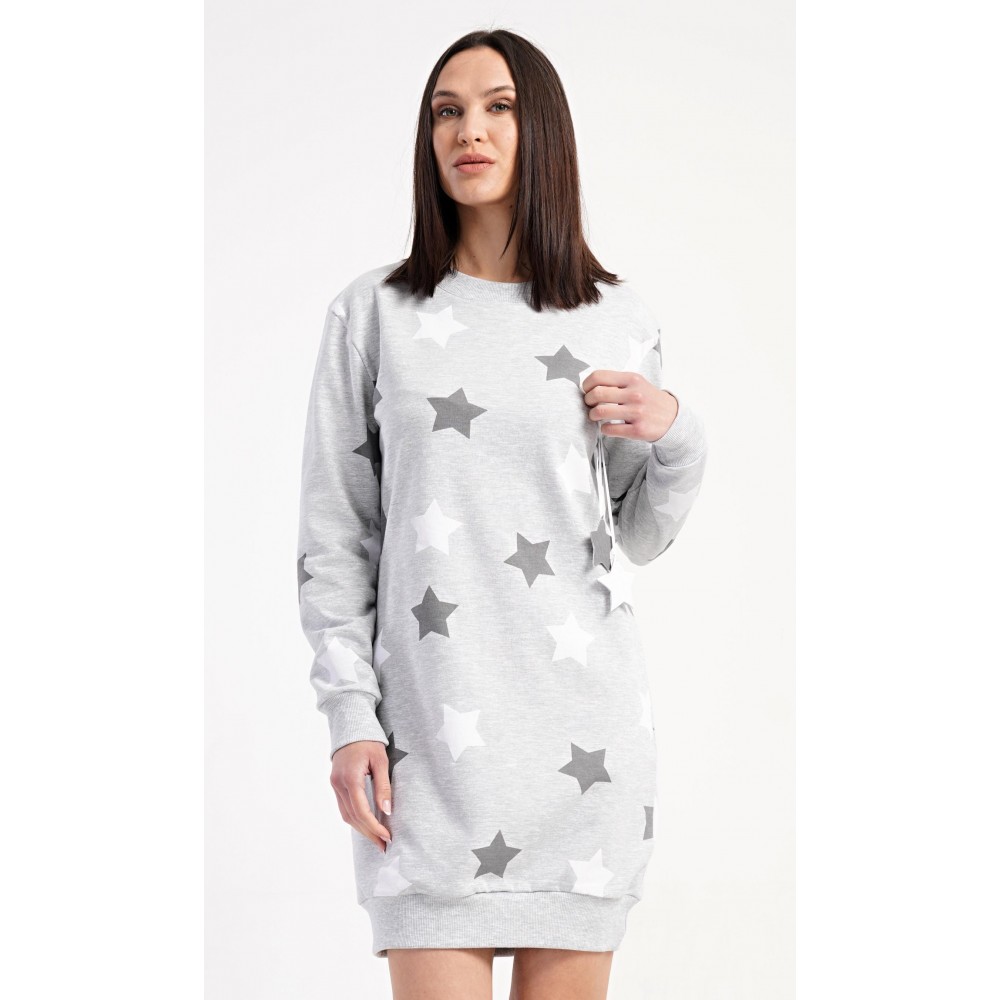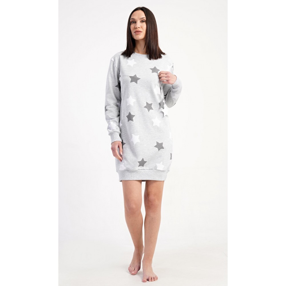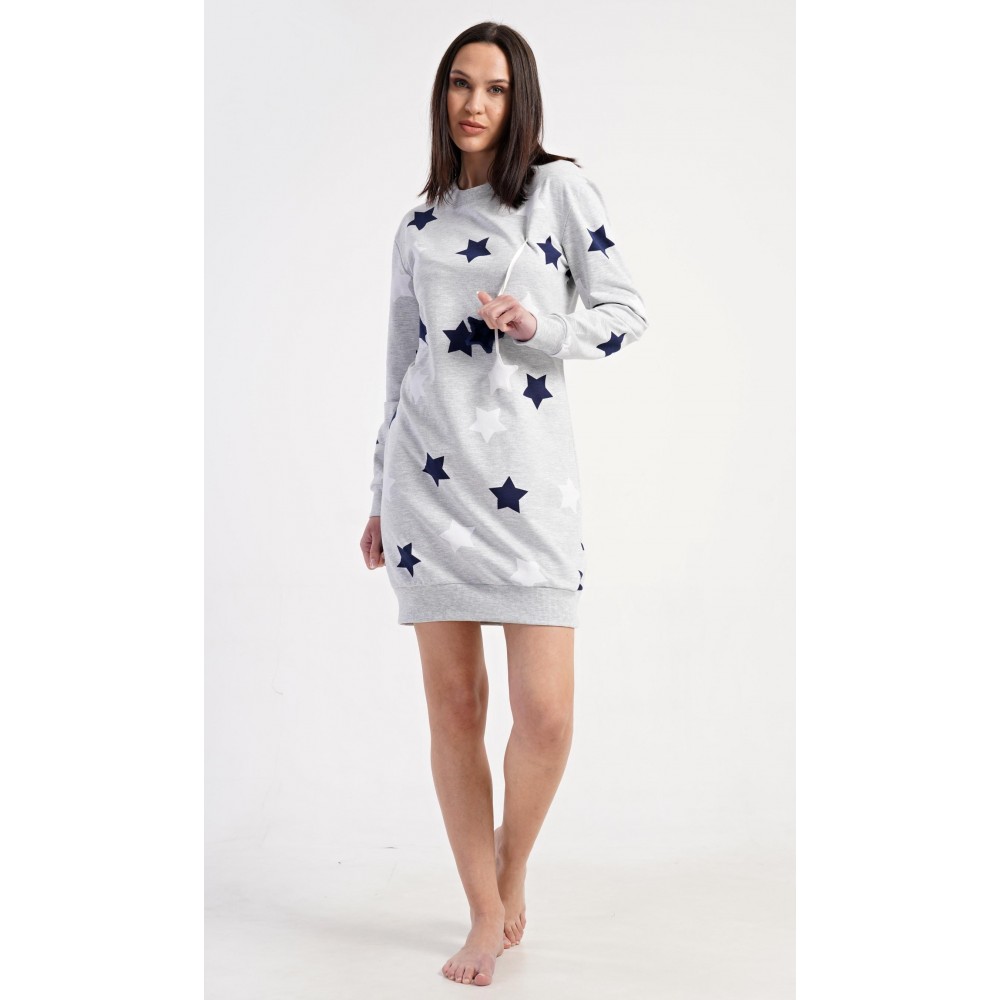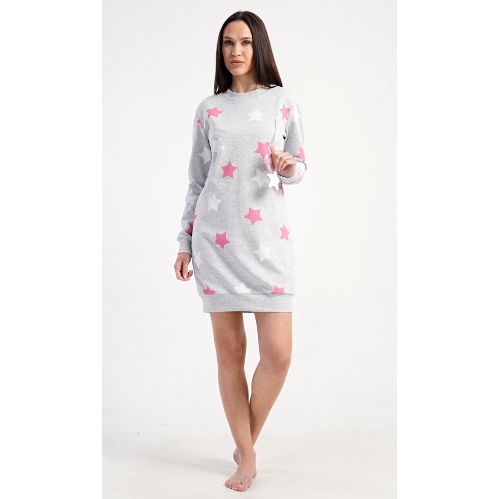 Dámské domácí šaty s dlouhým rukávem Hvězdy. Pohodlné domácí šaty s dlouhým rukávem a kulatým výstřihem zdobí potisk hvězd. Použitý oteplený materiál s obsahem bavlny 70% je příjemný a poddajný na dotek.