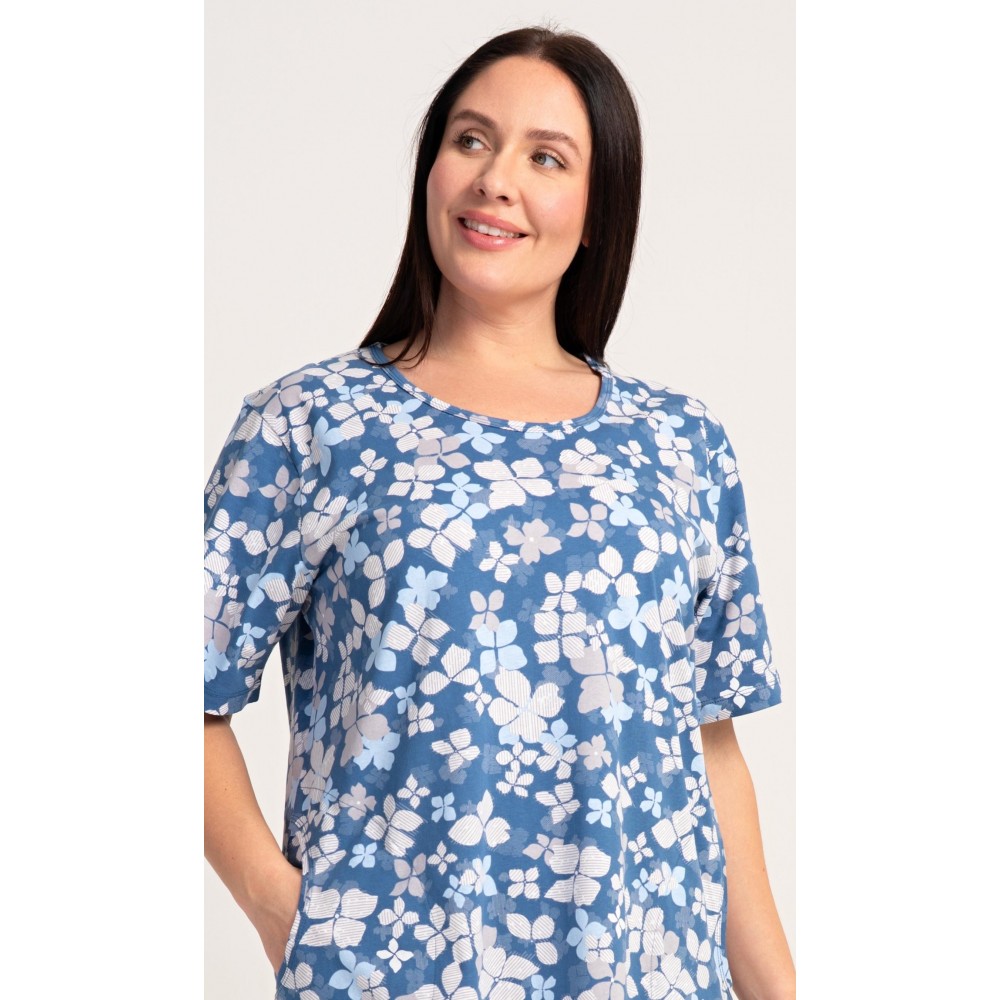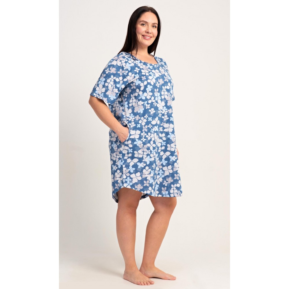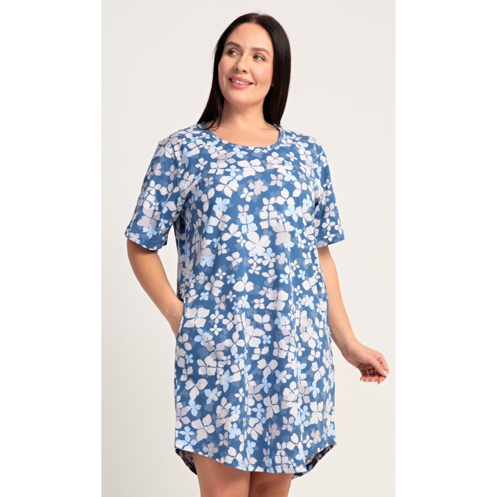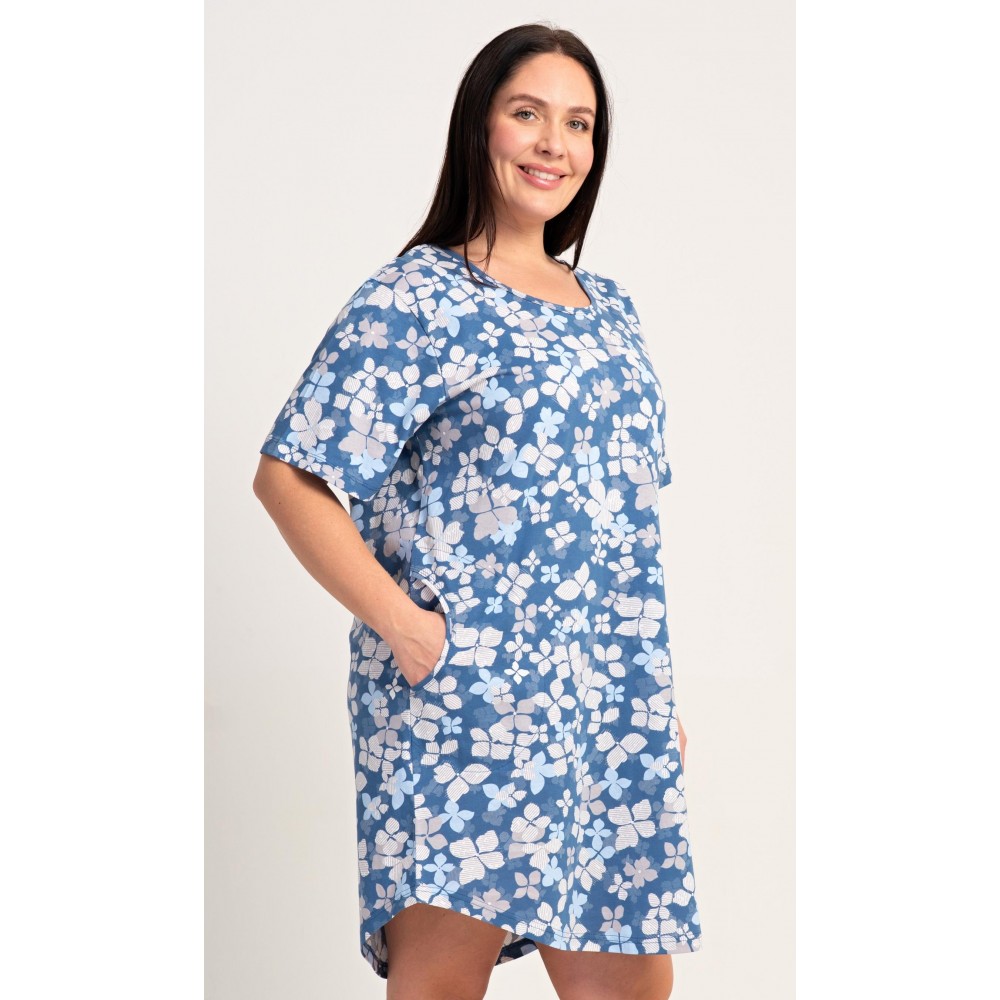 Dámské bavlněné domácí šaty s krátkým rukávem Diana. Domácí jednobarevné šaty s kulatým výstřihem a kapsami zdobí květy. Použitý bavlněný materiál je příjemný a poddajný na dotek. Šaty jsou pohodlné, vhodné na spaní i na denní nošení.