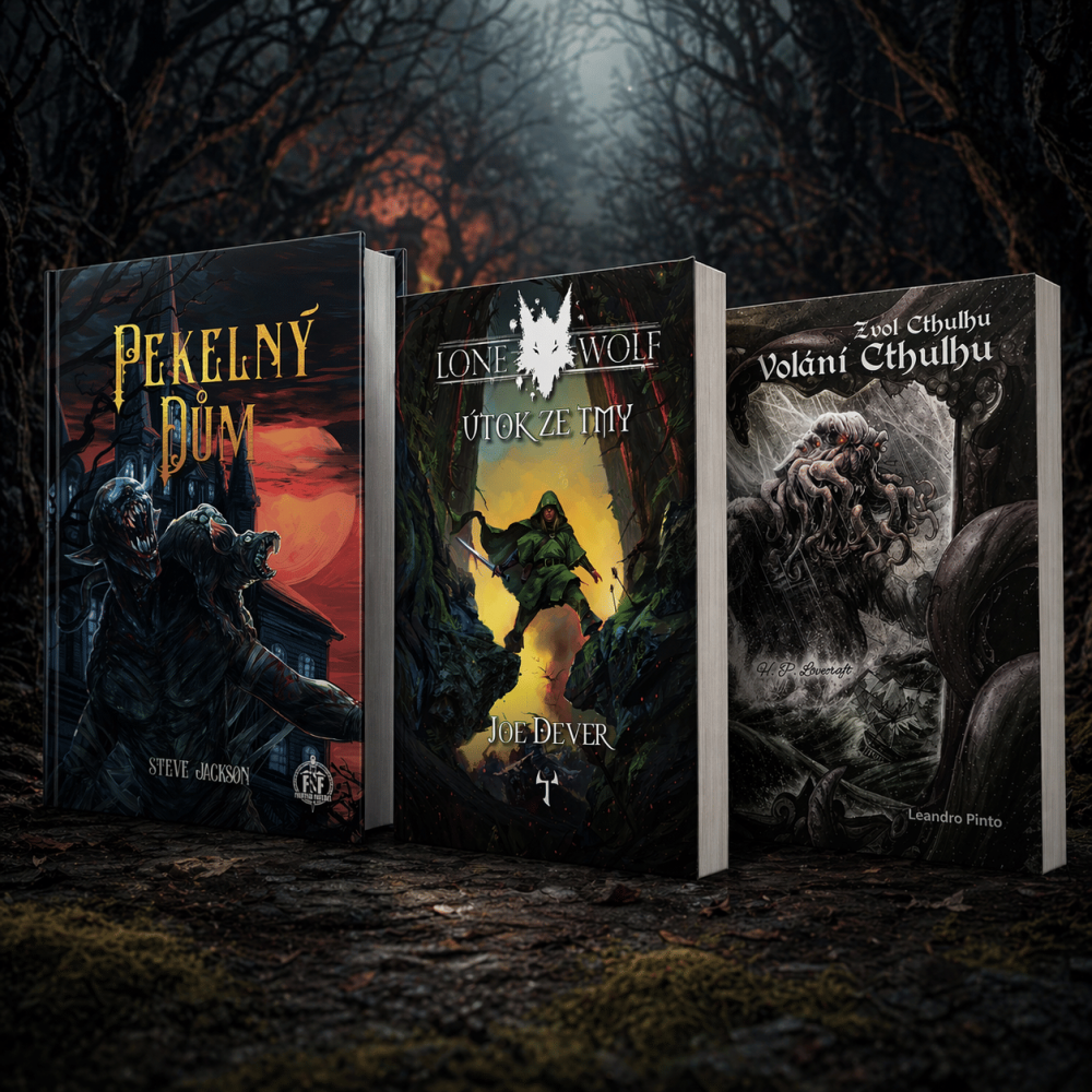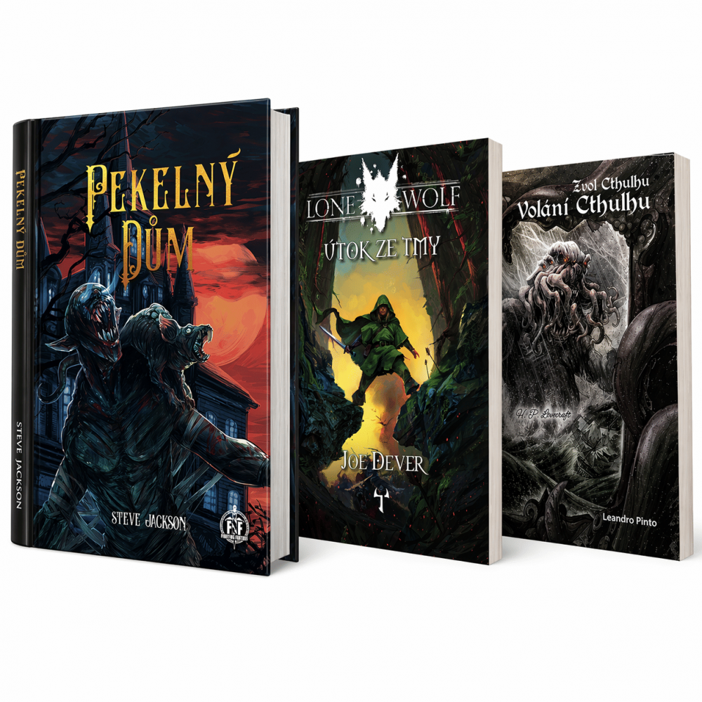 ## Tvoje brána do fantazie Chceš prožít vlastní dobrodružství, ale nevíš, kterou knihu otevřít jako první? Tento bundle jsme sestavili pro všechny, kteří chtějí hned hrát a neztrácet čas studiem pravidel. Najdeš v něm tři různé světy, které tě naučí základy **gamebooků** naprosto přirozeně. ## Od fantasy po horor V sadě na tebe čeká naprostá klasika **[link type= Product id= 4911 label= Lone Wolf ]**, kde se jako poslední z řádu rytířů Kai postavíš temnotě. Pokud tě láká mrazení v zádech (navíc zcela bez boje!) sáhni po adaptaci **[link type= Product id= 65148 label= Volání Cthulhu ]** nebo prozkoumej nebezpečný **[link type= Product id= 61003 label= Pekelný dům ]**. Každá kniha nabízí jiný styl vyprávění, abys mohl zjistit, co tě baví nejvíc. ## Stačí ti jen tužka K hraní nepotřebuješ žádné parťáky ani drahé vybavení. Stačí ti obyčejná tužka, případně guma a hlavně odvaha činit rozhodnutí, která ovlivní celý příběh. Tyto tituly vynikají svou srozumitelností a vtáhnou tě do děje od první stránky.  ## O čem je Pekelný dům? Venku zuří bouře a tvou jedinou nadějí je úkryt – podivný zchátralý dům, který zahlédneš v dálce. Jenže hledání útočiště v tomto místě tě přivede k dobrodružství, při kterém běhá mráz po zádech a v žilách tuhne krev. Děsiví obyvatelé pekelného domu tě budou strašit navždy. Kdo ví, kolik nešťastných poutníků už v jeho hrůzných zdech zahynulo? Podaří se ti v něm přežít noc? ## O čem je Lone Wolf: Útok ze tmy? Jeden z nejslavnějších gamebooků – první ze série Lone Wolf. Jakožto jediný přeživší z rytířů řádu Kai, máš za úkol varovat krále před útokem Temných pánů. Jejich sluhové tě však na cestě pronásledují – nebezpečí číhá na každém rohu. ## O čem je Zvol Cthulhu: Volání Cthulhu? V tomto gamebooku se ujmeš role postavy, která vyšetřuje záhadnou smrt svého prastrýce, profesora Gammella, a odhaluje činnost sekty zasvěcené kosmické entitě Cthulhu. Při postupu příběhem děláš rozhodnutí, která určují výsledek a osud tvé postavy. Lovecraftovy příběhy se často zabývají tématy šílenství, zakázaného poznání a nepoznatelného, takže i v gamebooku Zvol Cthulhu: Volání Cthulhu můžeš očekávat temnou a znepokojivou, dramatickou atmosféru.