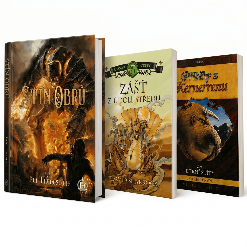 ## Ovládni svůj osud Hledáš cestu do světa, kde o tvém přežití rozhoduje meč a trocha štěstí? Tato sada přináší esenci klasického fantasy dobrodružství, které si užiješ i bez družiny kumpánů. Čekají tě nebezpečné dungeony, prastará magie a souboje s nestvůrami v nejlepší tradici žánru. ## Výzbroj pro hrdiny V balíčku najdeš prověřené tituly, které tě nenechají vydechnout. Postav se ocelovým obrům v legendárním **[link type= Product id= 69979 label= Stínu obrů ]** nebo rozpleť temný příběh v **[link type= Product id= 54146 label= Zášti z Údolí středu ]**. Pokud toužíš po rozsáhlém průzkumu, **[link type= Product id= 56080 label= Příběhy z Kernerrenu ]** ti otevřou živý svět, kde tvoje volby mají skutečnou váhu. ## Perfektní dar pro dobrodruhy Nevíš přesně, co vybrat fanouškovi dračáků nebo RPG her? Tato sada knih je sázkou na jistotu pro každého, kdo vyrůstal na hrdinských eposech. Stačí otevřít první svitek, chopit se tužky a vyrazit na cestu, ze které není návratu.  ## O čem je Stín obrů? Vydej se na napínavou výpravu do světa, kde každý tvůj krok může rozhodnout o životě a smrti! Stín obrů od legendárního autora Iana Livingstonea tě vtáhne do interaktivního dobrodružství, kde jsi hlavním hrdinou právě ty. V temných lesích a prastarých ruinách tě čekají nebezpeční nepřátelé, zákeřné pasti a hádanky, které vyzkouší tvou odvahu a důvtip. Jsi připraven postavit se stínům minulosti a odhalit tajemství obrů? ## O čem je Zášť z Údolí středu? První kniha z trilogie Nositel kosy odehrávající se ve fantasy světě Vlákno, v níž se staneš pánem svého osudu a rozhodneš o tom, jakým směrem se bude příběh ubírat. Zcela nový svět, kde se setkává (mnohdy velmi originální) magie, mystika a realita, okořeněná drobnými narážkami na britskou historii. Příběh spojuje vše, co čtenář od fantasy očekává a nebojí se zabrnkat na děsivou strunu hororu. ## O čem jsou Příběhy z Kernerrenu? V komplexním a detailně propracovaném gamebooku, knižní hře pro 1 hráče, budete cestovat do pobřežního města Liust. Během svého putování potkáte přátele, kteří vám v divoké krajině pomohou. Skrývat se mezi nimi však mohou i tací, co jsou připraveni vás okrást o to nejcennější. První svazek dvoudílného dobrodružství obsahuje tisíc číslovaných sekcí, barevné celostránkové ilustrace, mapy a bestiář kernerrenských nestvůr. Příběhy z Kernerrenu: Za Jitřní štíty jsou na poli gamebooků jedinečným počinem, s nímž zažijete jedno z nejepičtejších dobrodružství svého života!