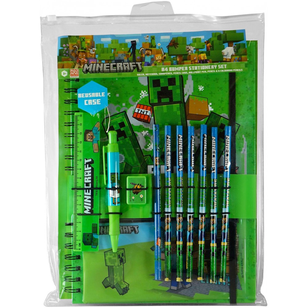 Se sadou školních potřeb pro hráče Minecraftu se staneš tím správným Bossem! Sada potřeb s postavami Alex, Stevem a Creeprem doplněné o další herní detaily si můžeš vzít v praktickém pouzdru do školy i kanceláře. Skvělé pro milovníky světa z kostiček. Obsah balení: 1x linkovaný zápisník 1x tužka 1x ořezávátko 1x pravítko 1x kuličkové pero 1x penál na tužky 6x barevných pastelek