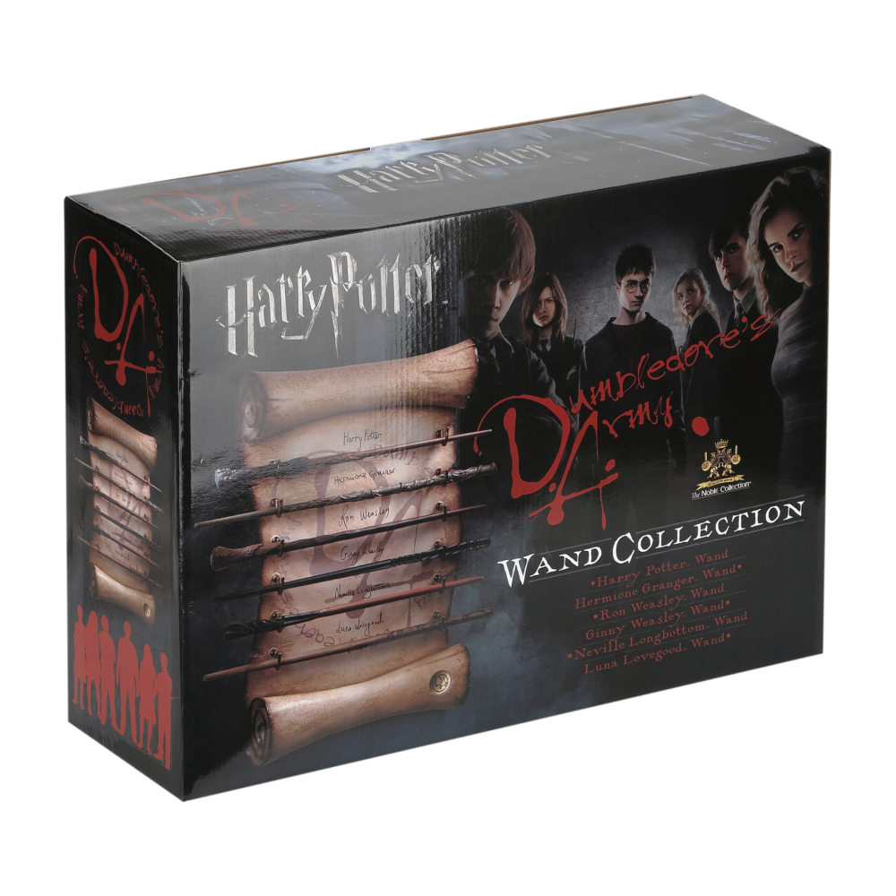 Vyzdobte si svou magickou studovnu, pokoj, pracovnu nebo hernu sbírkou kouzelnických hůlek členů Brumbálovy armády z knih a filmů o Harry Potterovi! Stylový stojan v podobě svitku si můžete zavěsit na zeď, obsahuje šestici hůlek se jmény svých majitelů. Jedná se o krásně zpracované sběratelské hůlky z resinu, s kovovým jádrem. Sada obsahuje kouzelnické hůlky těchto postav: Harry Potter Hermiona Grangerová Ron Weasley Neville Longbottom Ginny Weasleyová Lenka Láskorádová