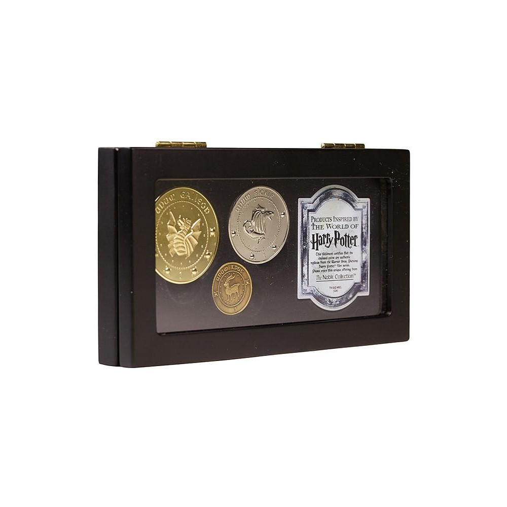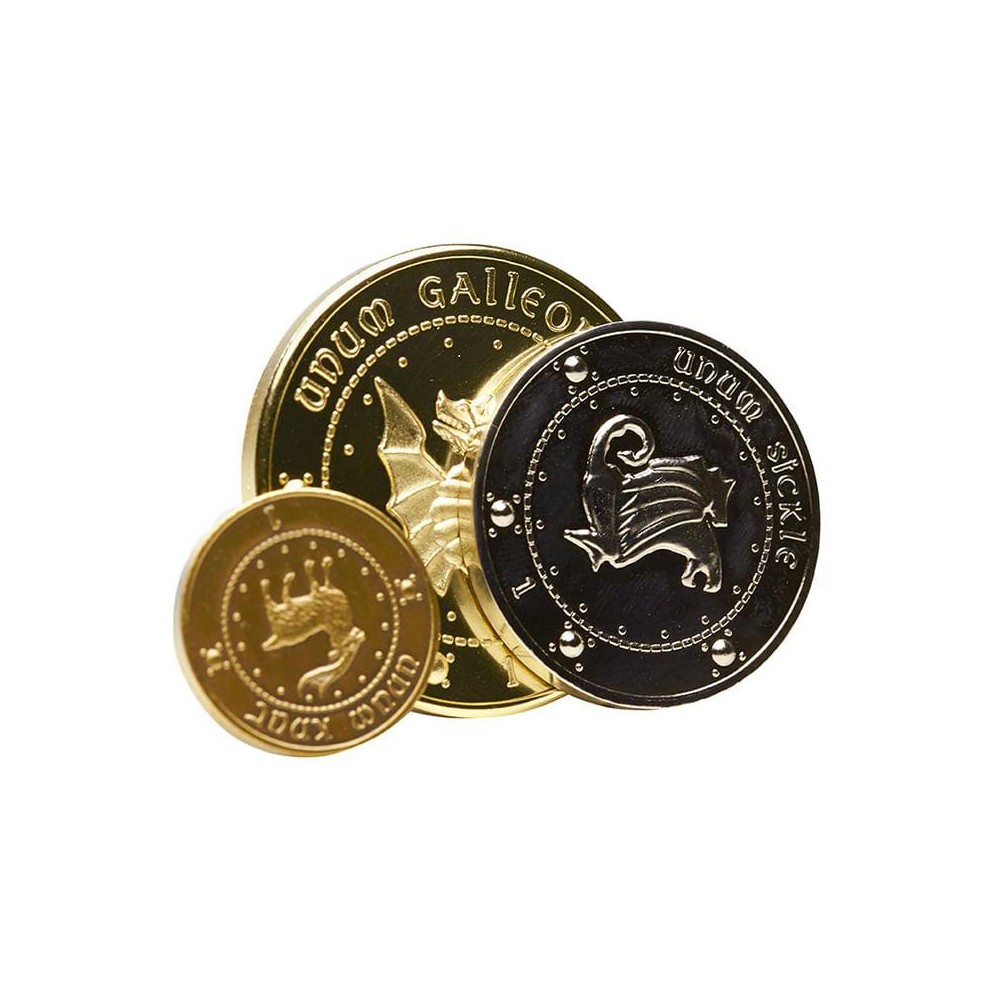 Galeon, srpec a svrček - jeden kus od každé čarodějnické mince z Gringotovy banky ve stylovém pouzdře. Každá mince je precizně vyrobená, galeon je potažen 24 karátovým zlatem, srpec stříbrem a svrček mědí. Průměr největší mince je 4 cm, střední 3,3 cm a nejmenší 2,2 cm.