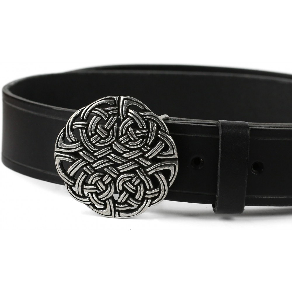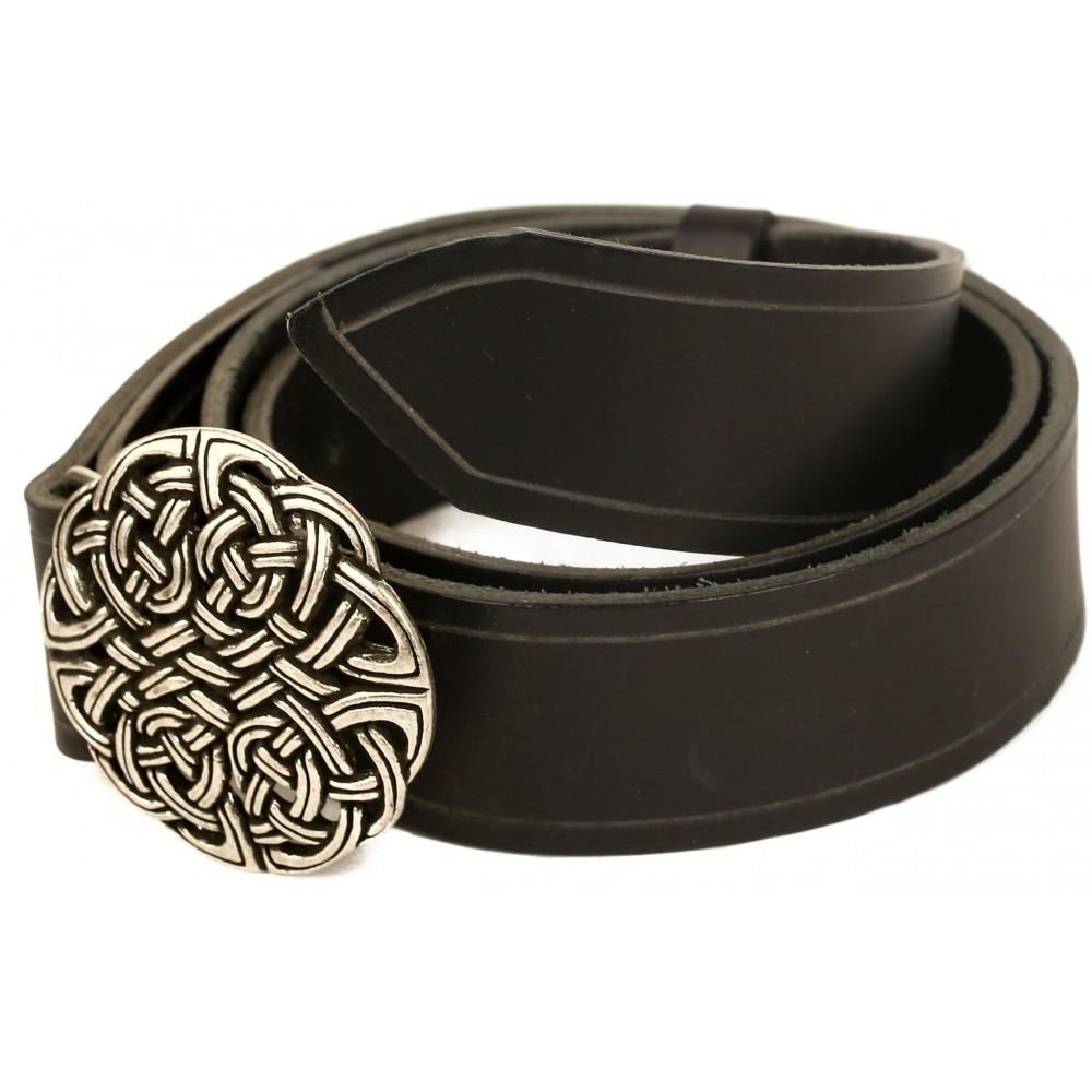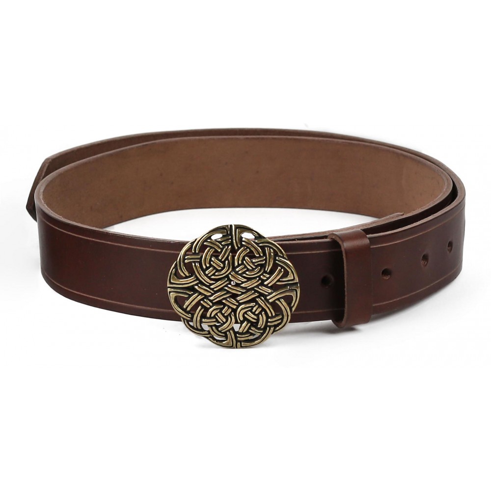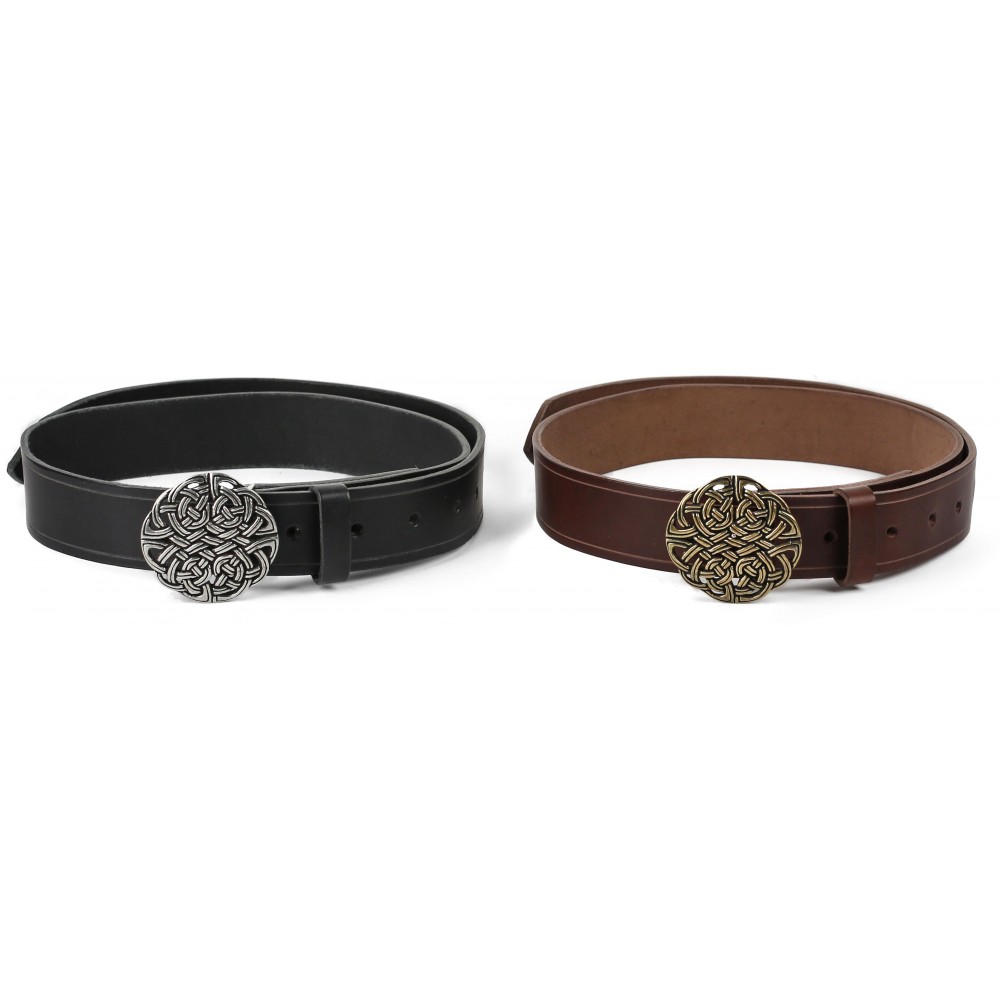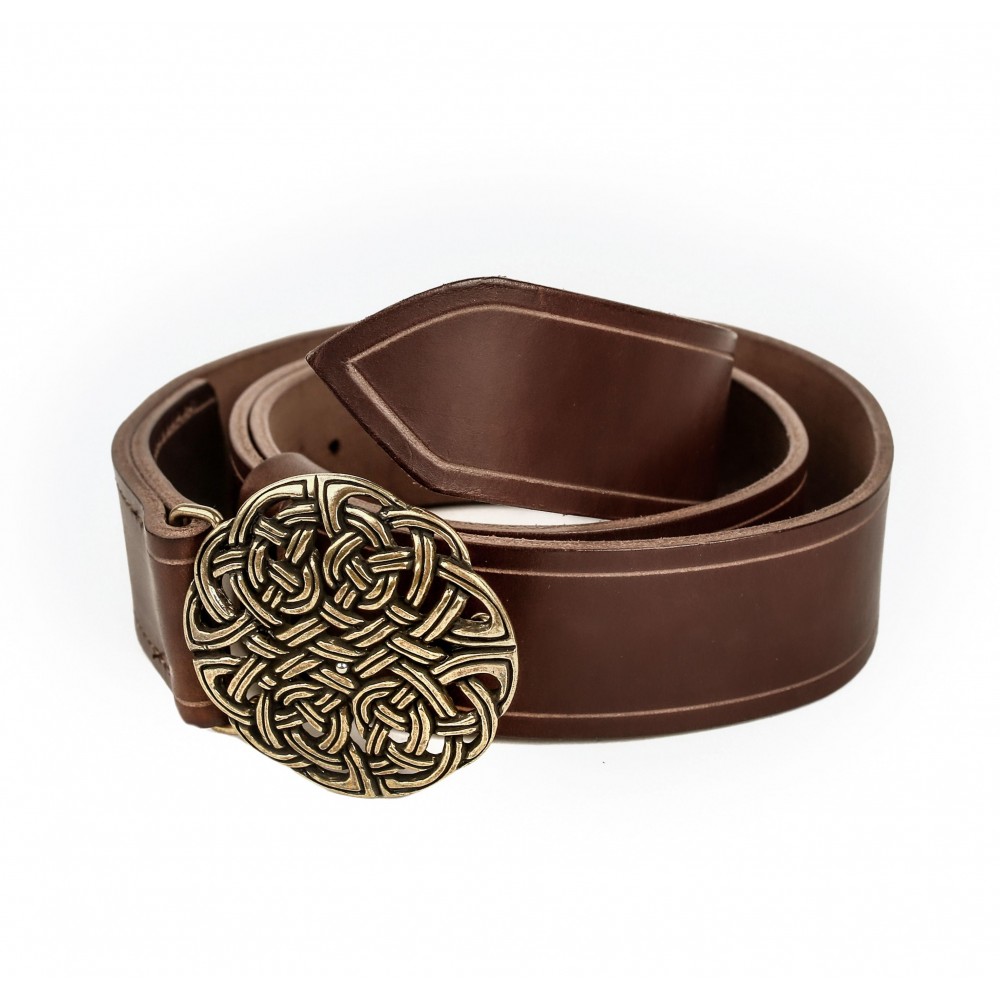 Kvalitní kožený opasek zdobí kovová spona s tradičním keltským uzlem, který nositele ochrání před zlými silami a démony, jichž na Larpech a keltských slavnostech není málo. Opasek je opatřen masivní kovovou sponou (průměr 6 cm) s trnovým zapínáním a má dírky v rozmezí obvodu pasu cca 69 - 93 cm. K mání ve dvou variantách: z hnědé kůže se sponou v barvě bronzu a z černé kůže se stříbrně zbarvenou sponou. Bude ideálním koženým doplňkem k dobovému keltskému kostýmu, ale slušet mu to bude i u jiných pánských fantasy kostýmů. Na přání můžeme vyrobit opasek dle požadovaných parametrů, například delší než 110 cm, jiná barva a pod. V případě zájmu nás neváhejte kontaktovat, nebo napište požadavek do poznámky k objednávce.
