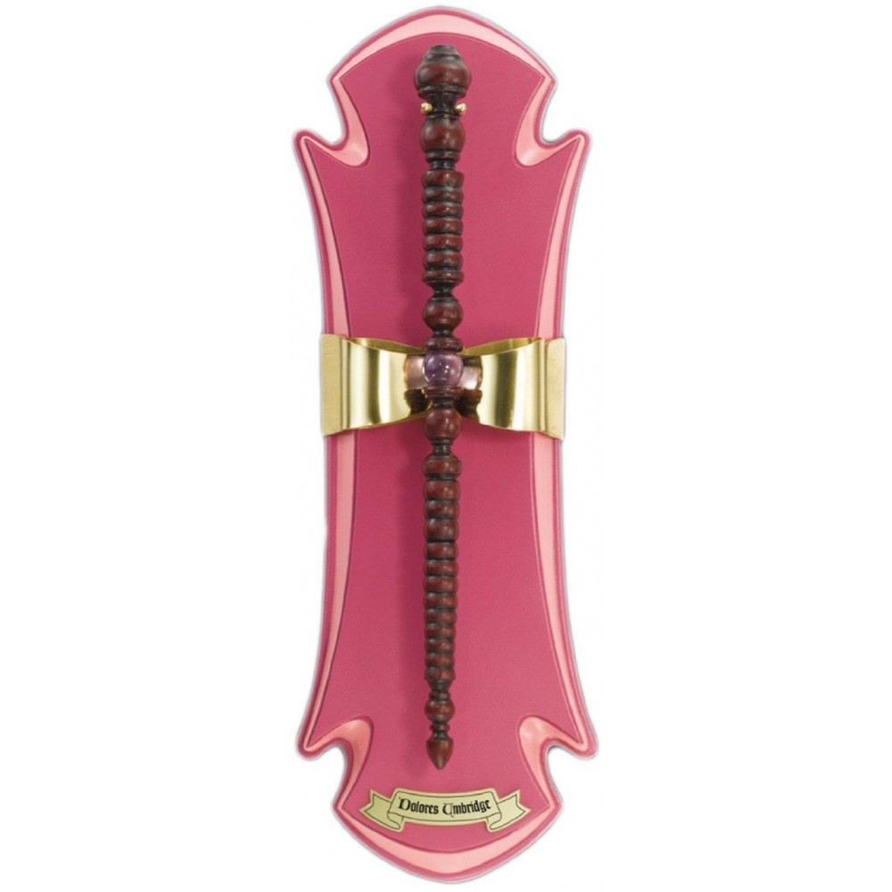 Replika kouzelnické hůlky náměstkyně ministra kouzel Dolores Umbridgeové s elegantním podstavcem. V pátém díle série Harry Potter se stane dokonce profesorkou obrany proti černé magii, je pasována do funkce vrchní vyšetřovatelky a na čas je dokonce i ředitelkou Bradavické školy čar a kouzel. Orginální dárek pro fanouška Harryho Pottera! Sběratele potěší i stylový držák na zeď. Hůlka je dlouhá cca 26.5 cm, vyrobena ze syntetické pryskyřice.
