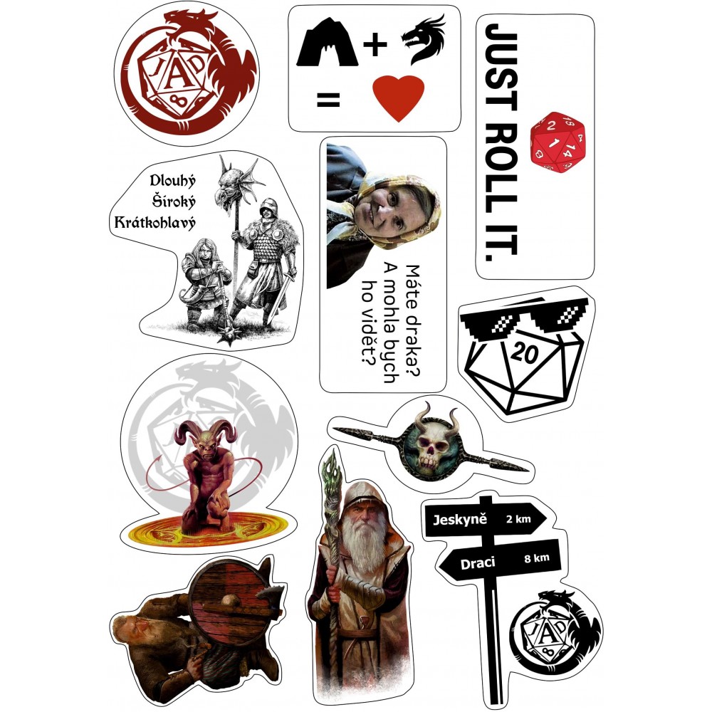 Sada barevných samolepek pro vaši nejoblíbenější českou hru na hrdiny – Jeskyně a draci. Chcete si ozdobit osobní deník nebo kartu družiny? Vylepšit si pravidla nebo herní příslušenství? Nebo jen někam přidat logo Jeskyní a draků? S těmito nálepkami máte jedinečnou možnost! Navíc jsme také přidali pár vtipných nálepek. Zábava totiž ke hrám na hrdiny neodmyslitelně patří. Ukažte nám, jak se vám povedlo nálepky využít. A klidně nám přidejte i vlastní návrhy.