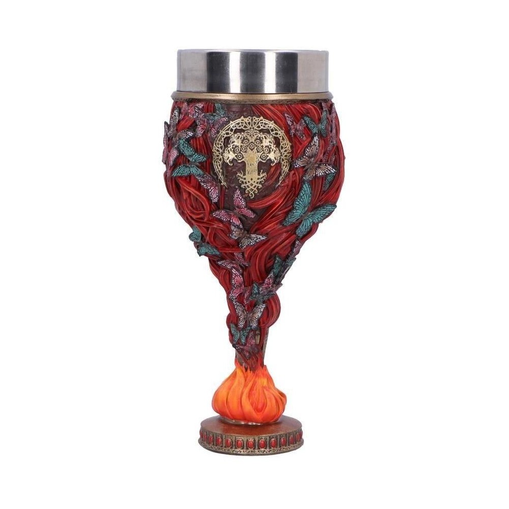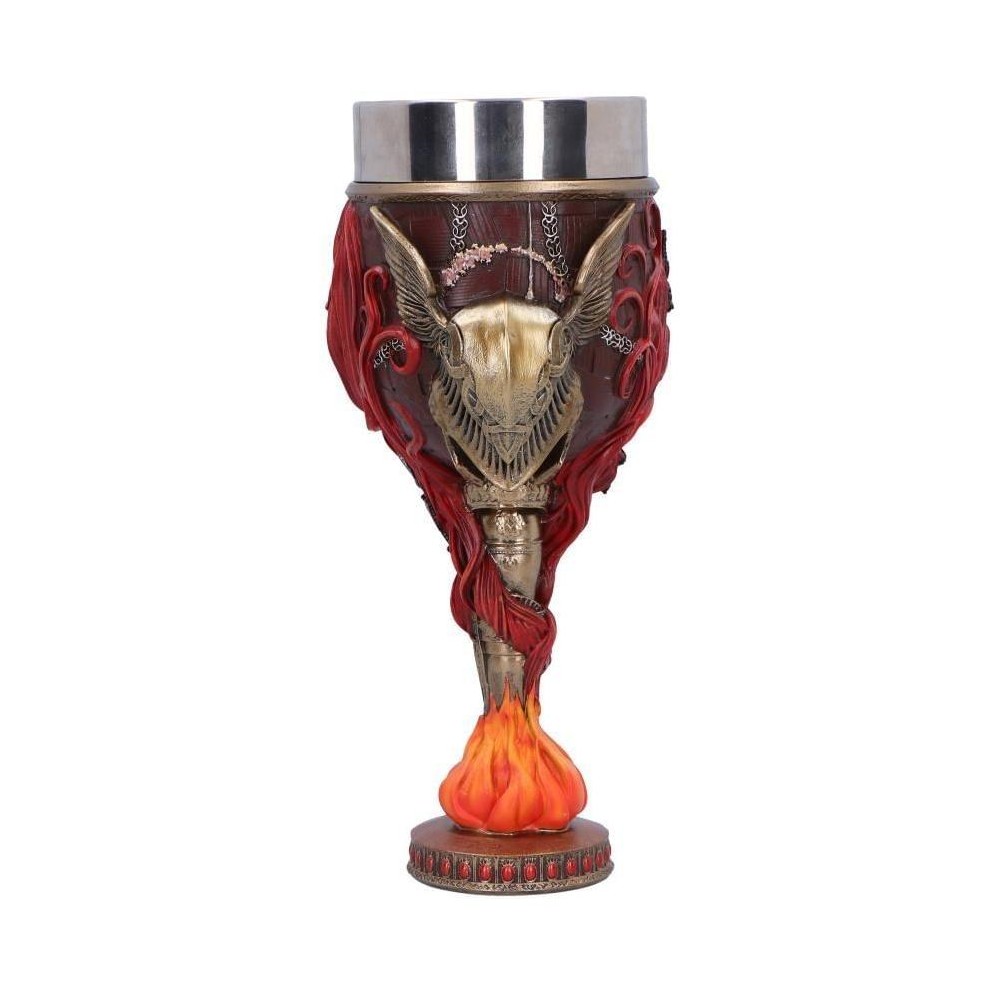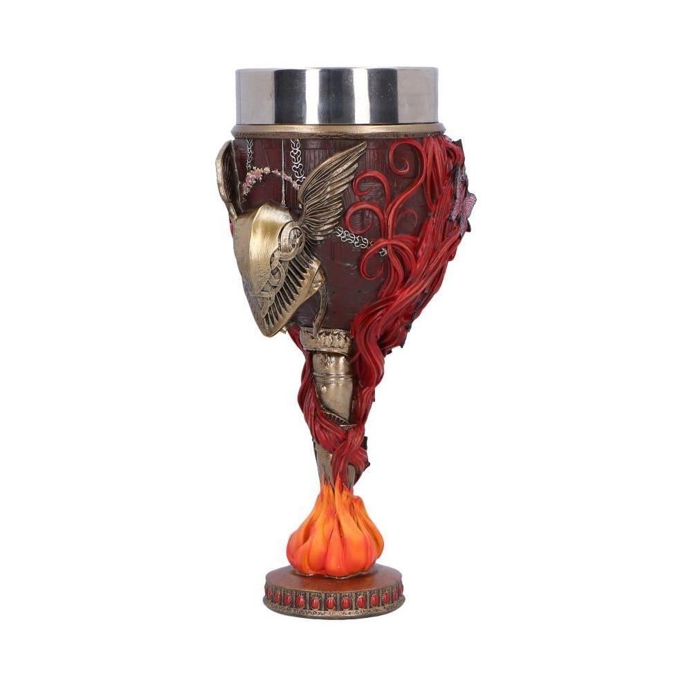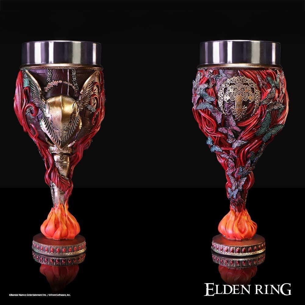 Vychutnej si krušné herní okamžiky v Elden Ring spolu s pohárem věnovaným jedné z nejtěžších bossů Malenii. Pohár má zbarvení jejího karmínového brnění a zdobí ho její okřídlená helma či motivy pramenů rusých vlasů a motýlů. Vše ve spodní části u stojanu doplňuje plamen - živel, vůči němuž je Malenia, Blade of Miquella, odolná. Nerezová vnitřní část je vyjímatelná, což umožňuje snadnou údržbu. Pohár není vhodný do myčky nádobí ani mikrovlnné trouby!