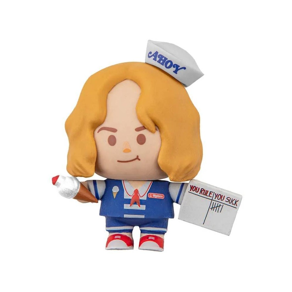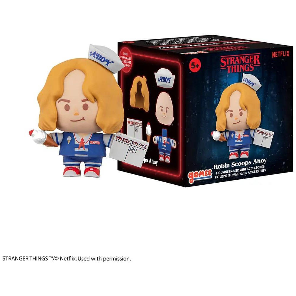 Přidej do své sbírky Stranger Things Robin Scoops Ahoy ve formě hravé sběratelské Gomee figurky! Robin je zachycena v ikonické retro uniformě Scoops Ahoy, která ji okamžitě dělá rozpoznatelnou. Součástí jsou vyměnitelné doplňky, včetně legendární tabule „you rule, you suck“, díky kterým můžeš Robin přizpůsobit a vystavit ji přesně podle své sběratelské fantazie. Figurku lze nejen vystavit, ale díky materiálu z gumového kaučuku funguje i jako skutečná guma na mazání! Rozměr figurky je 6,5 cm.