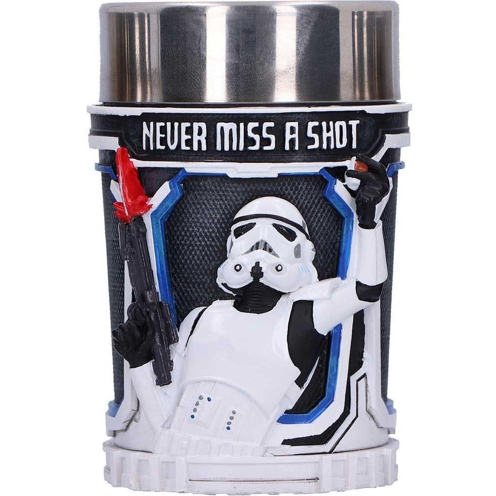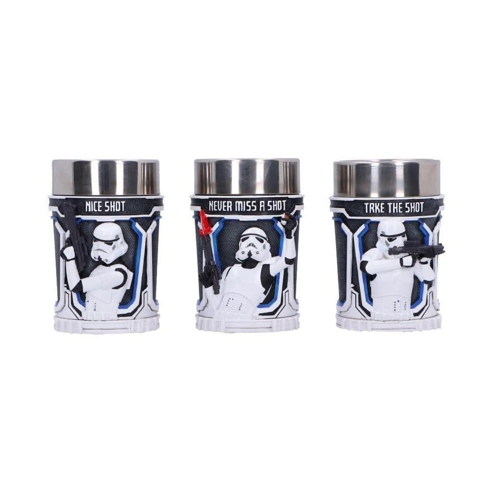 V sadě najdeš 3 originální panáky se Stormtroopery ze Star Wars s vtipnými hláškami, jako Take the Shot, Nice Shot nebo Never Miss a Shot. Skvělý způsob, jak si připít s přáteli, ať už před nastoupenou jednotkou po úspěšně splněné misi nebo během sledování filmu či seriálu ze světa Hvězdných válek. Vniřní část stormtroopeřích panáků je z nerezové oceli a je vyjímatelná, což umožňuje jejich snadné mytí. Panáky nejsou vhodné do mikrovlnné trouby ani do myčky nádobí.