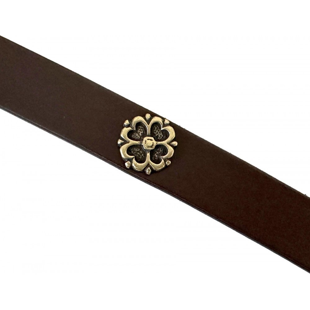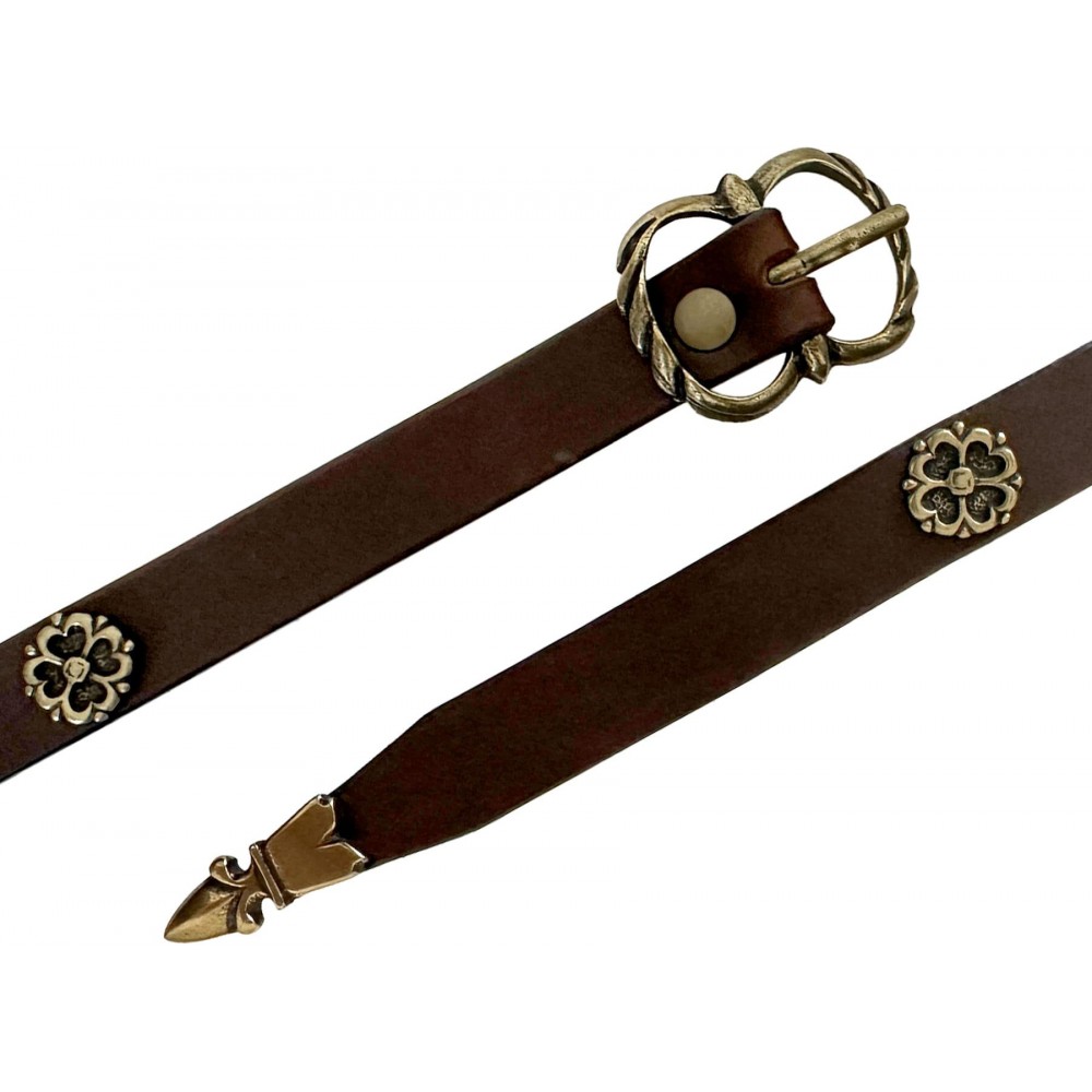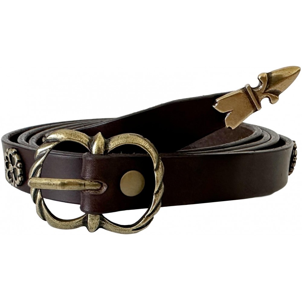 Doplň svůj středověký či historický kostým autentickým opaskem inspirovaným 14.–15. stoletím. Tento hnědý kožený pásek je v tenkém stylu, typického pro nošení k tunikám nebo šatům, a je zakončen mosazným zdobením ve zlaté barvě. Mosazné dekorace jsou zdobeny motivem čtyřlístku, připomínajícím autentické exempláře z pozdního středověku. Díky decentnímu a elegantnímu provedení je pásek nejen stylový, ale i praktický pro kostým či historické rekonstrukce. Skvělý doplněk pro LARP, tématické festivaly nebo historické kostýmy! Rozměry pásku jsou - šířka 2 cm, tloušťka 0,3 cm a délka je cca 166 cm.