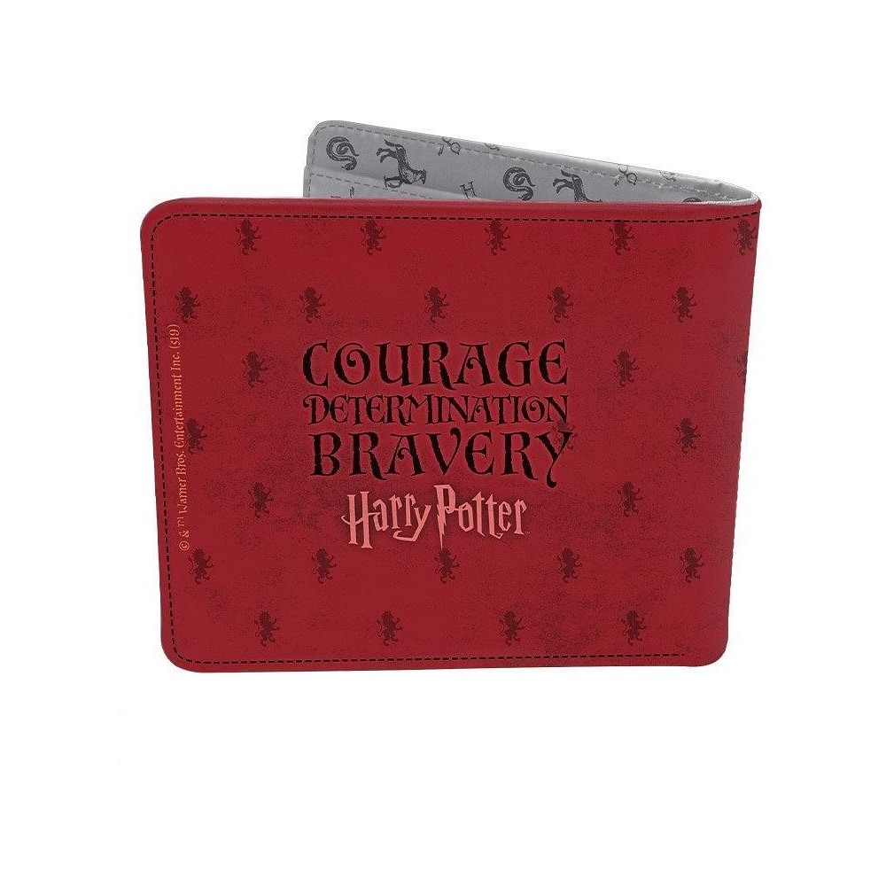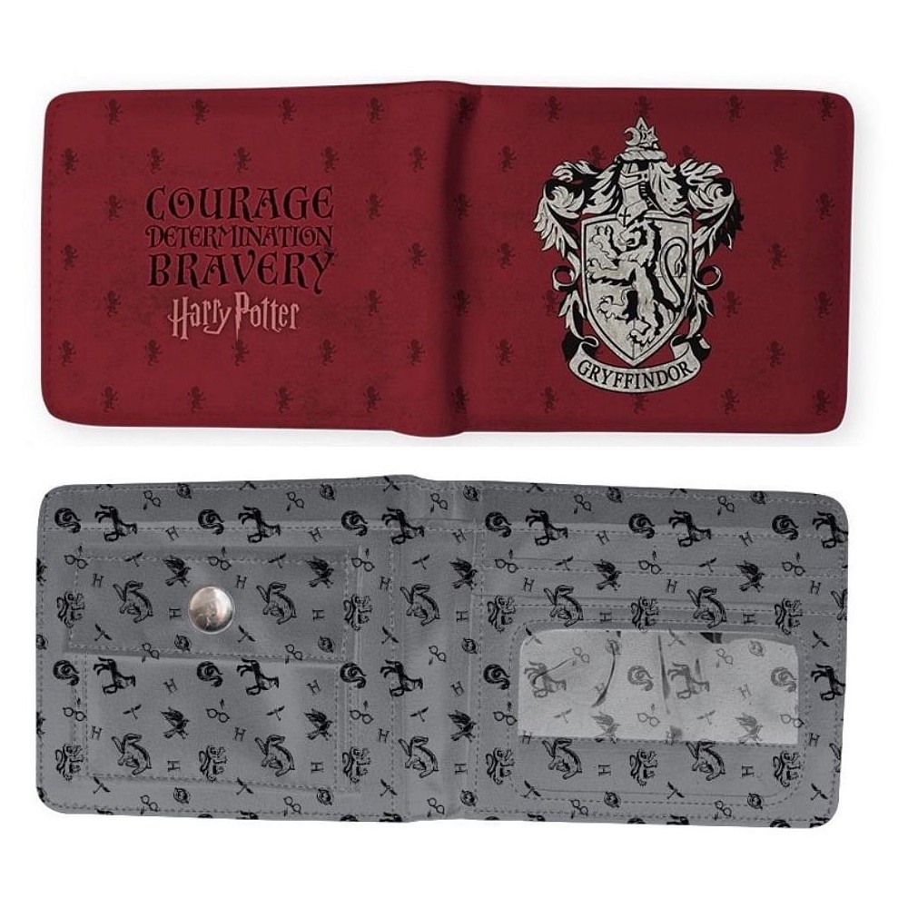 Koženková peněženka se znakem Nebelvíru (Gryffindor), koleje školy čar a kouzel v Bradavicích. Na zadní straně peněženky jsou nebelvírská hesla: courage, determination, bravery (odvaha, odhodlání, statečnost). Peněženka má několik slotů na karty, velkou kapsu na bankovky a kapsičku na mince uzavíratelnou cvočkem.