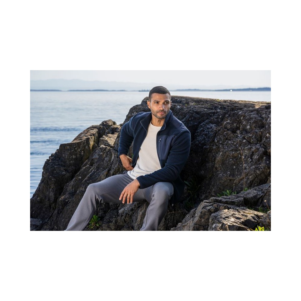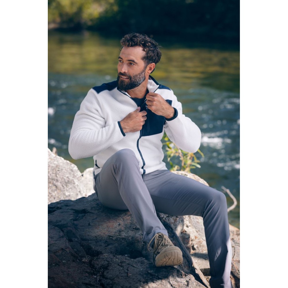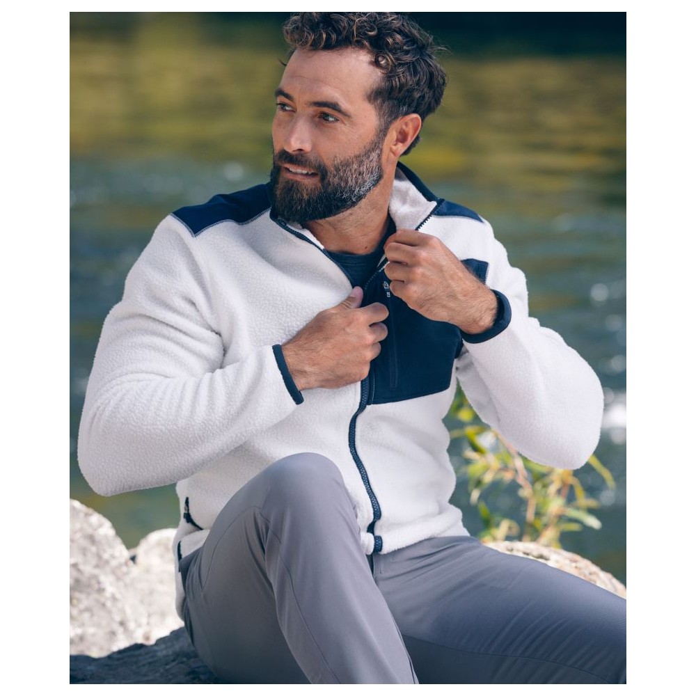 Prodyšný materiál, elastické manžety na rukávech a lemu, 2 boční kapsy a 1 náprsní kapsa se zipem, lemování a vsadky v kontrastní barvě, velmi měkký a teplý materiál, počesaná vnitřní strana, pratelné na 30°, nelze sušit v sušičce, nelze chemicky čistit