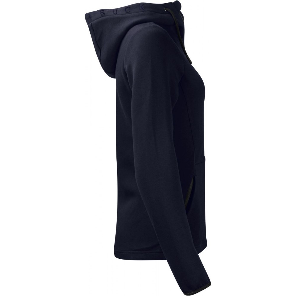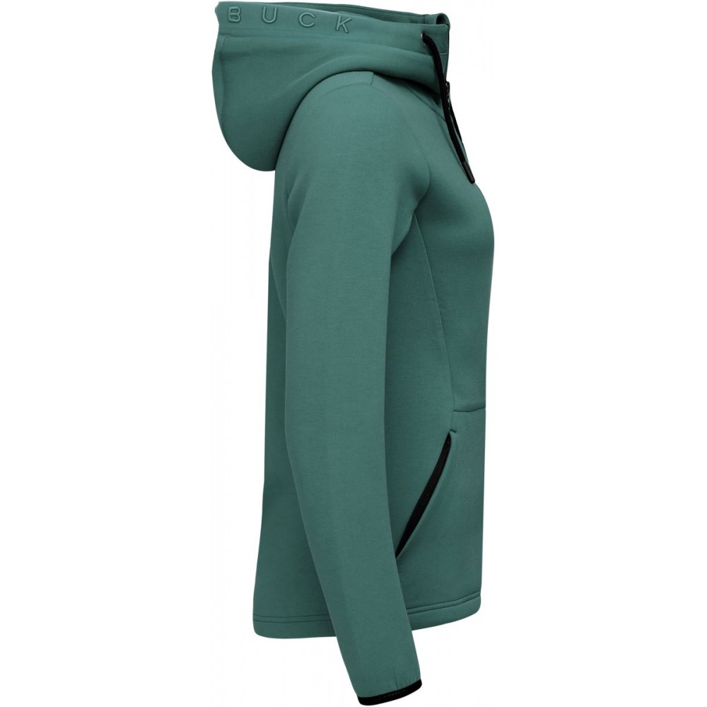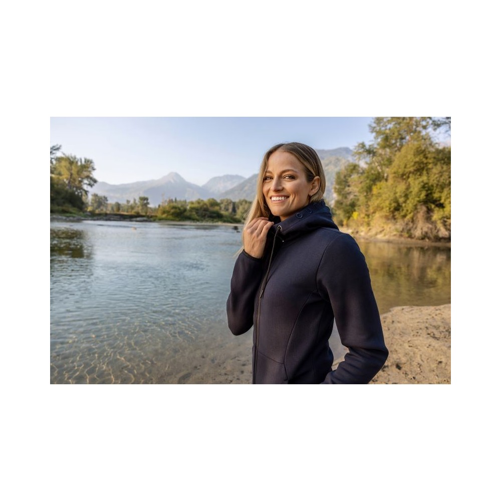Podšitá kapuce se šňůrkou, elastické manžety na rukávech, 2 boční kapsy se zipem, dvojitě pletená, měkký pružný materiál, výšivka loga na okraji kapuce, UV ochrana 50+, pratelné na 40°, nelze sušit v sušičce, nelze chemicky čistit
