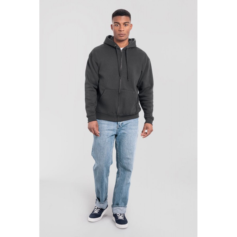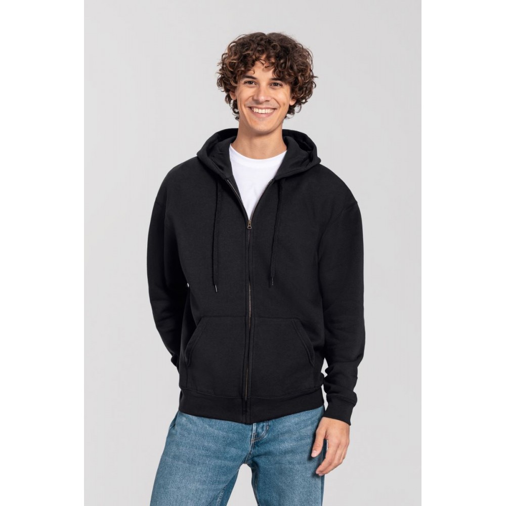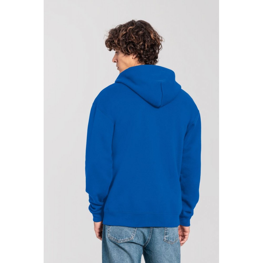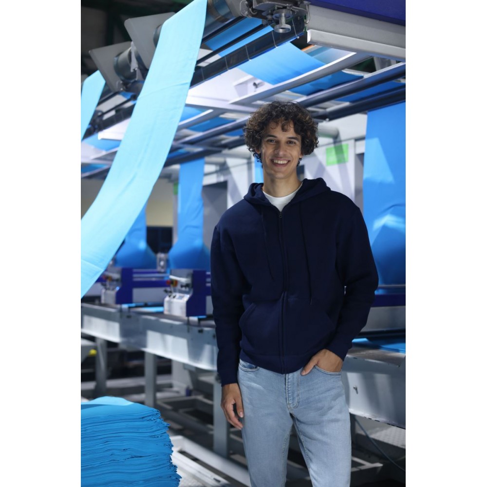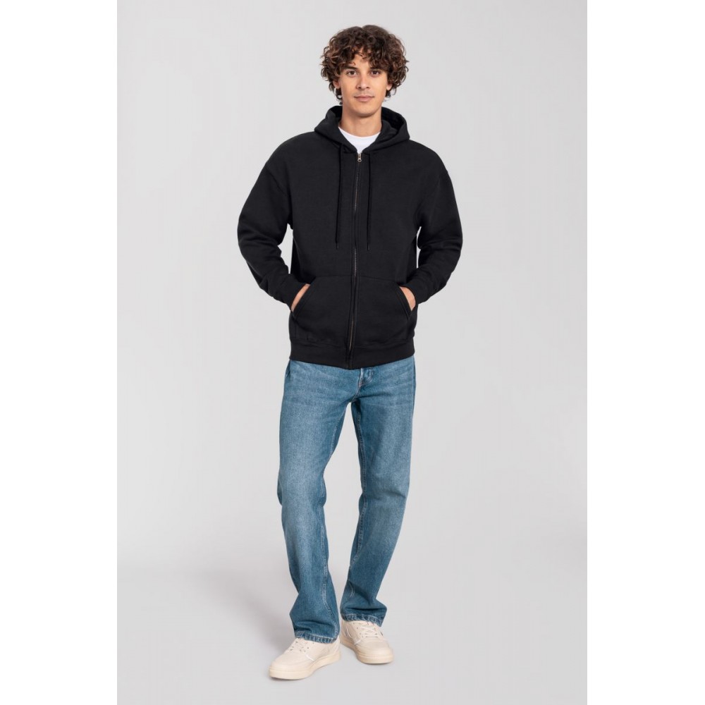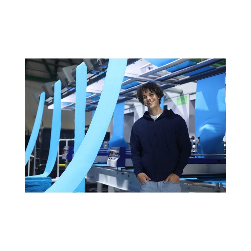 Klasický střih, podšitá kapuce s plochou šňůrkou tón v tónu, žebrované manžety na rukávech a lemu s Lycrou®, skrytý kovový zip, klokaní kapsa, povrch ze 100% bavlny, uvnitř počesaná, Použití udržitelných vláken CiCLO®, štítek Tear Away, pratelné na 40°, lze sušit v sušičce při nízké teplotěg